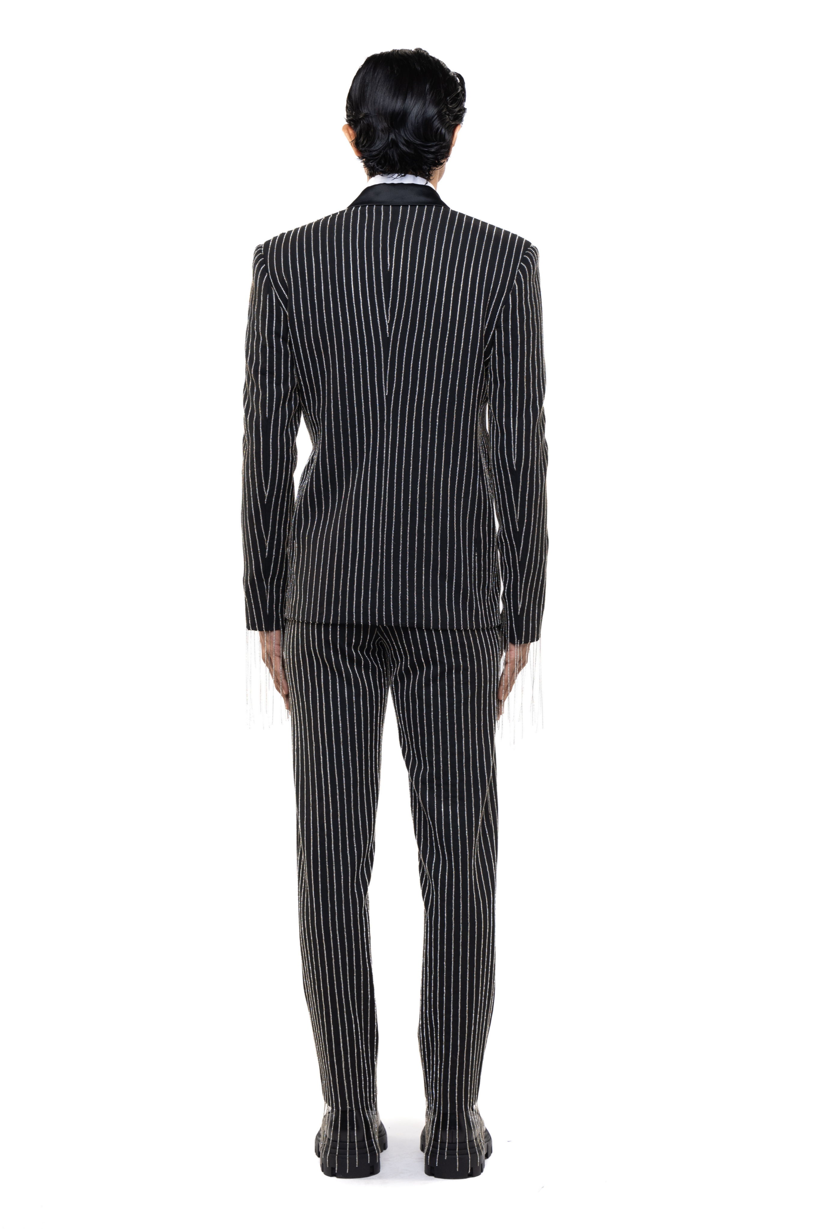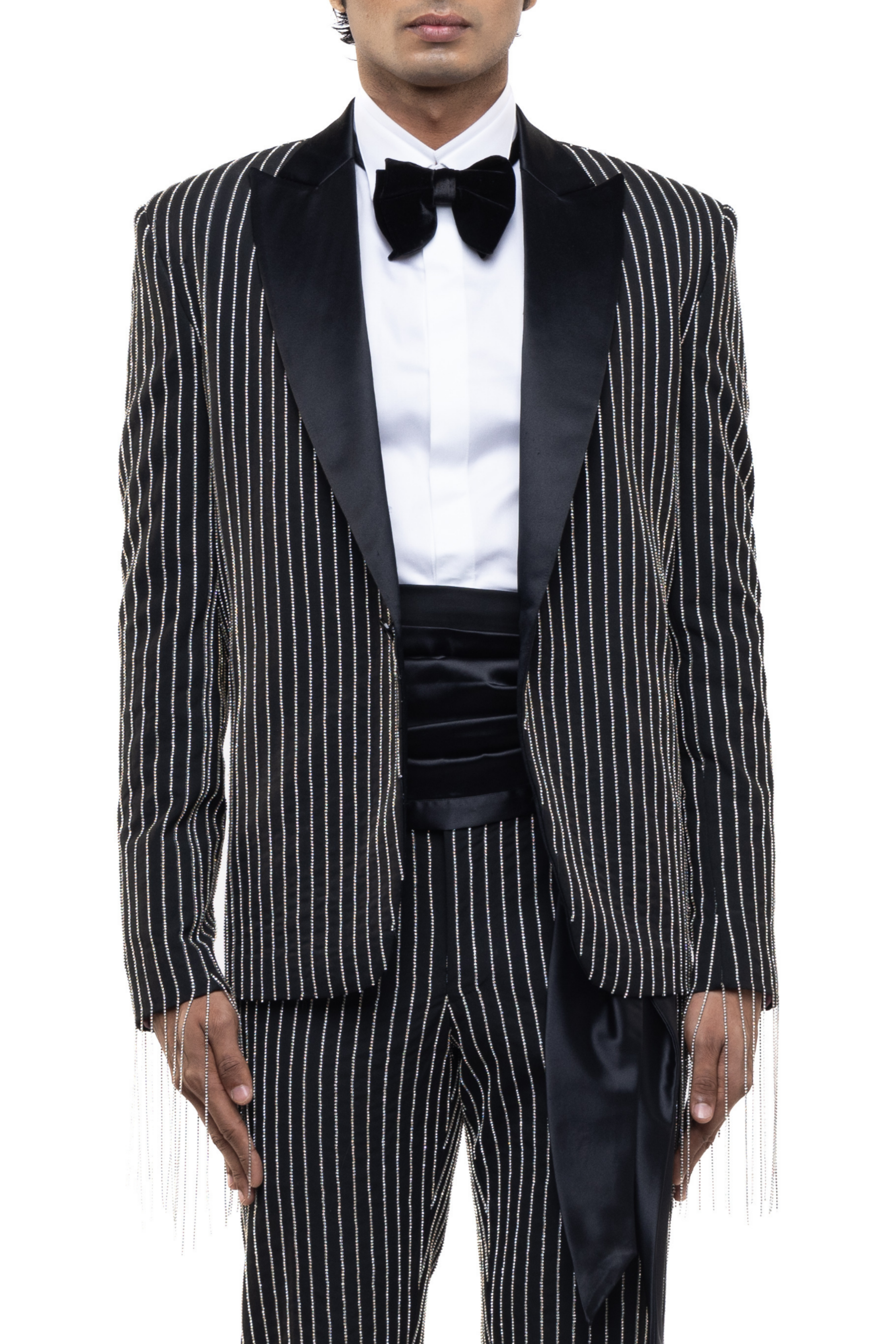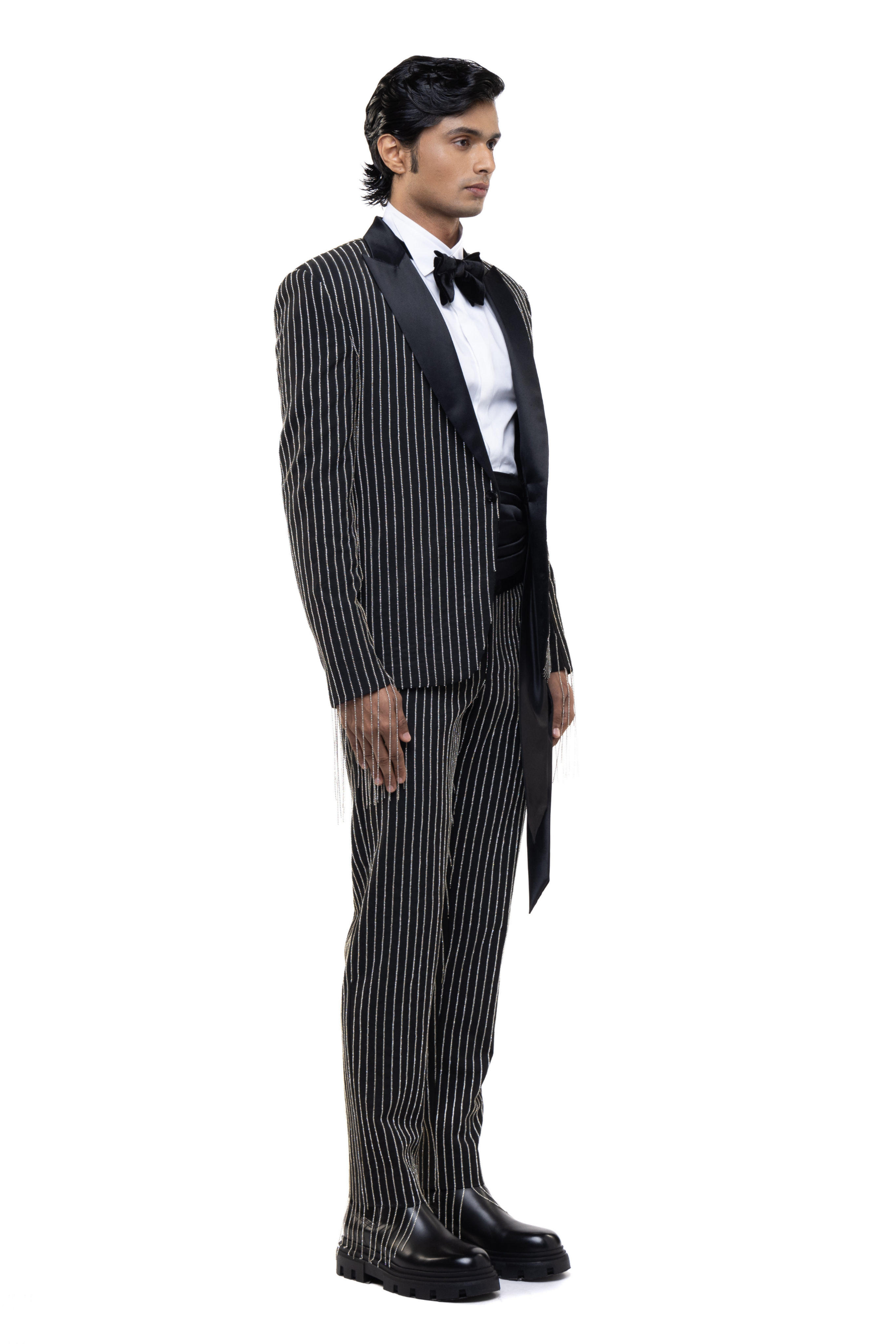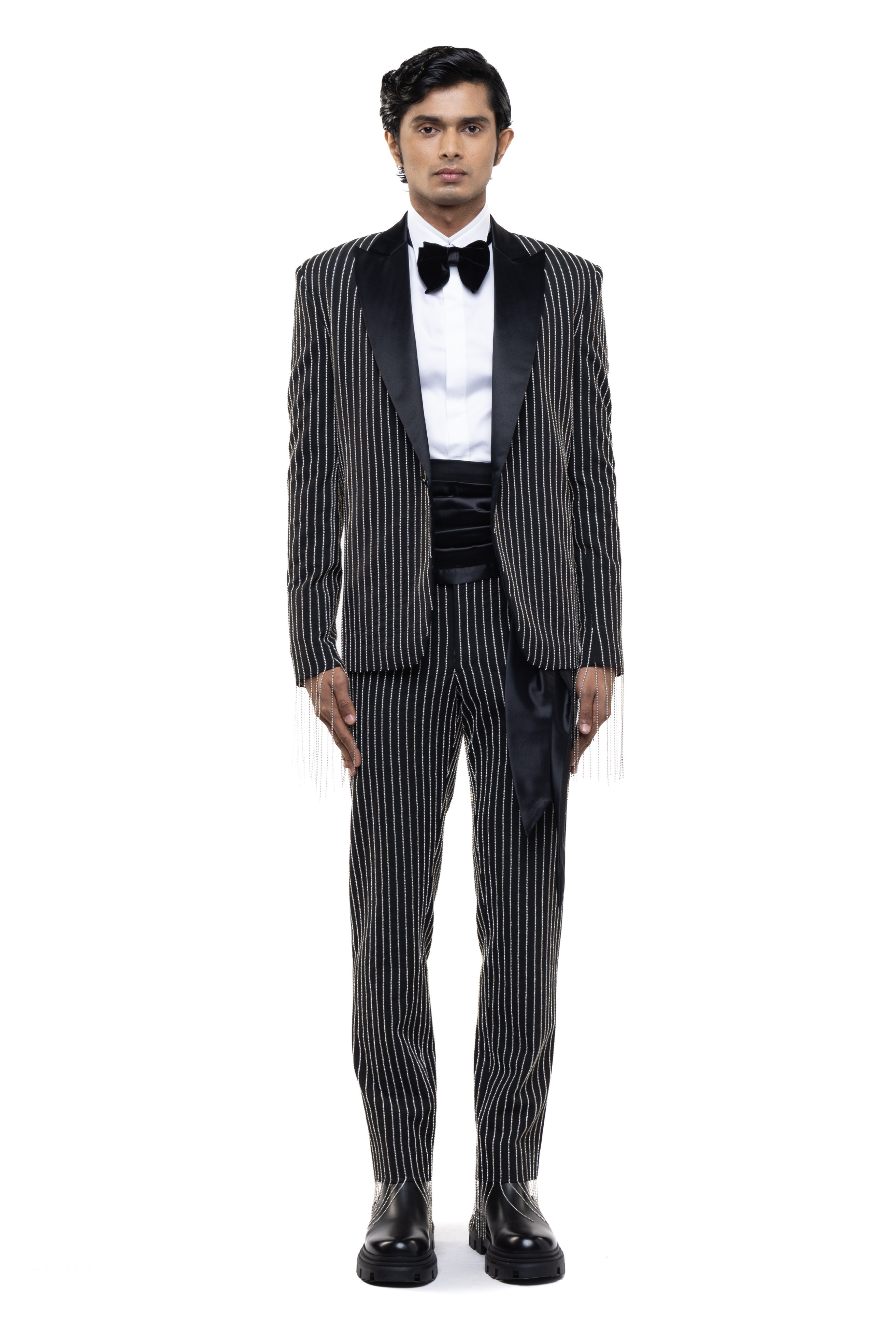 A striking option for reception, sangeet, or cocktail events, this tuxedo showcases rhinestone detailing on premium worsted wool. Pair with patent leather shoes and a crisp shirt for a dapper look.