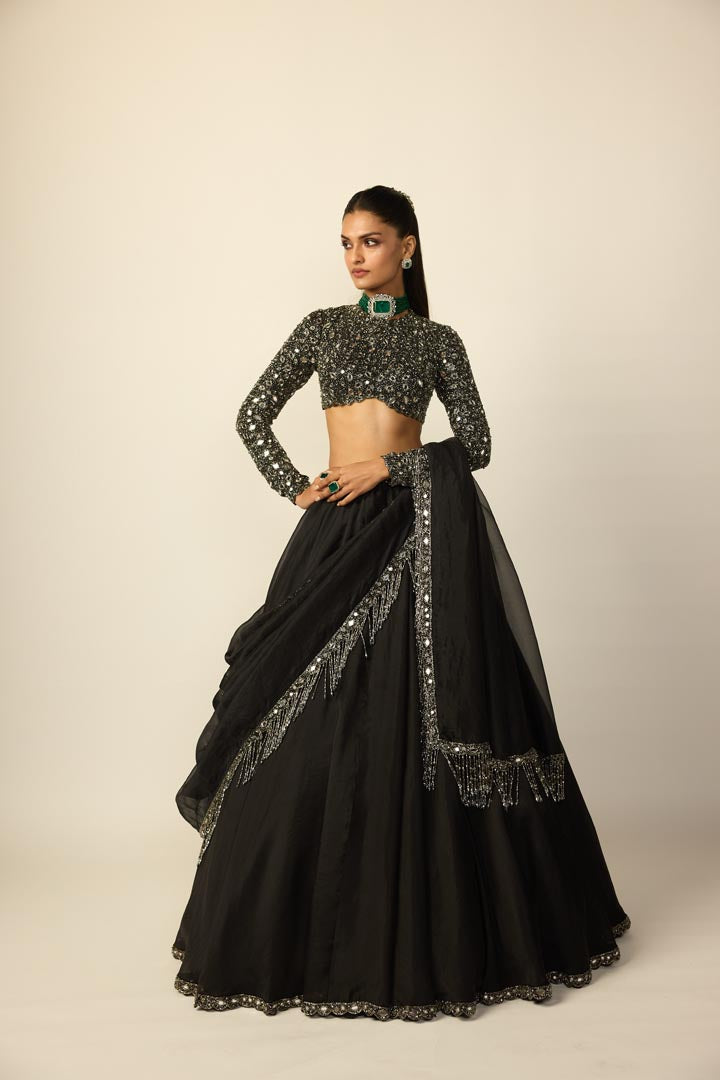 Black Organza Lehenga, paired with a heavily embroidered Zero neck blouse and a dupatta with cascading silver tassels.