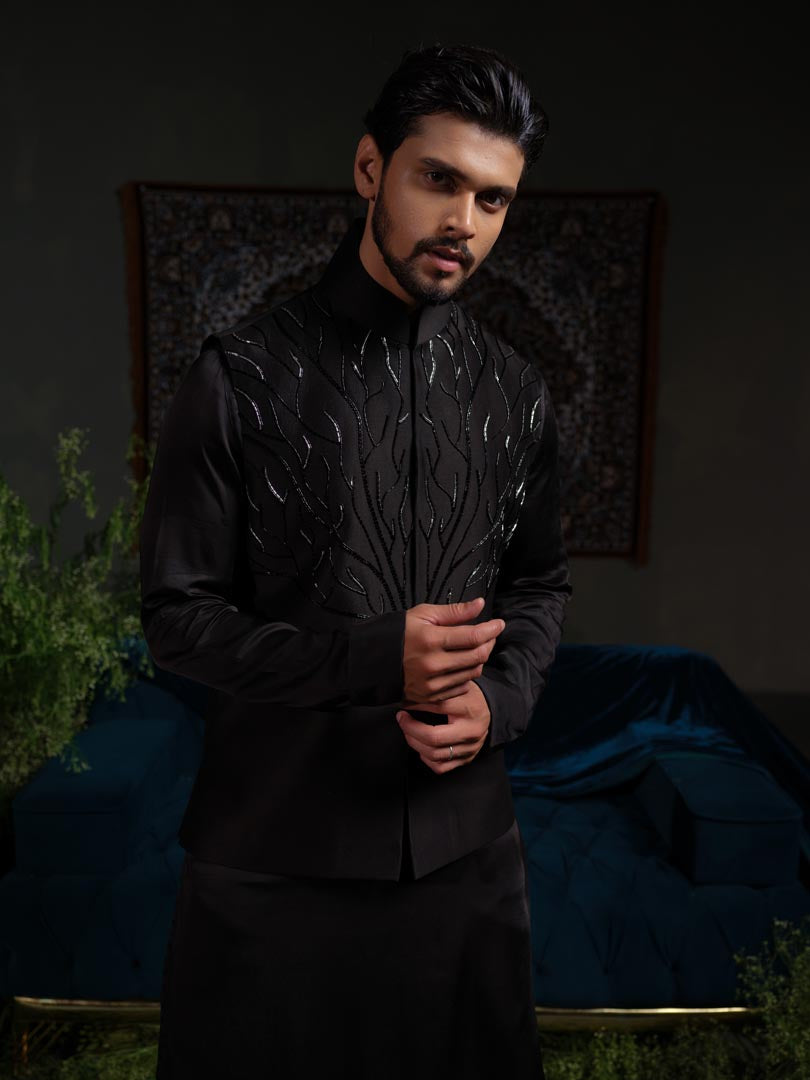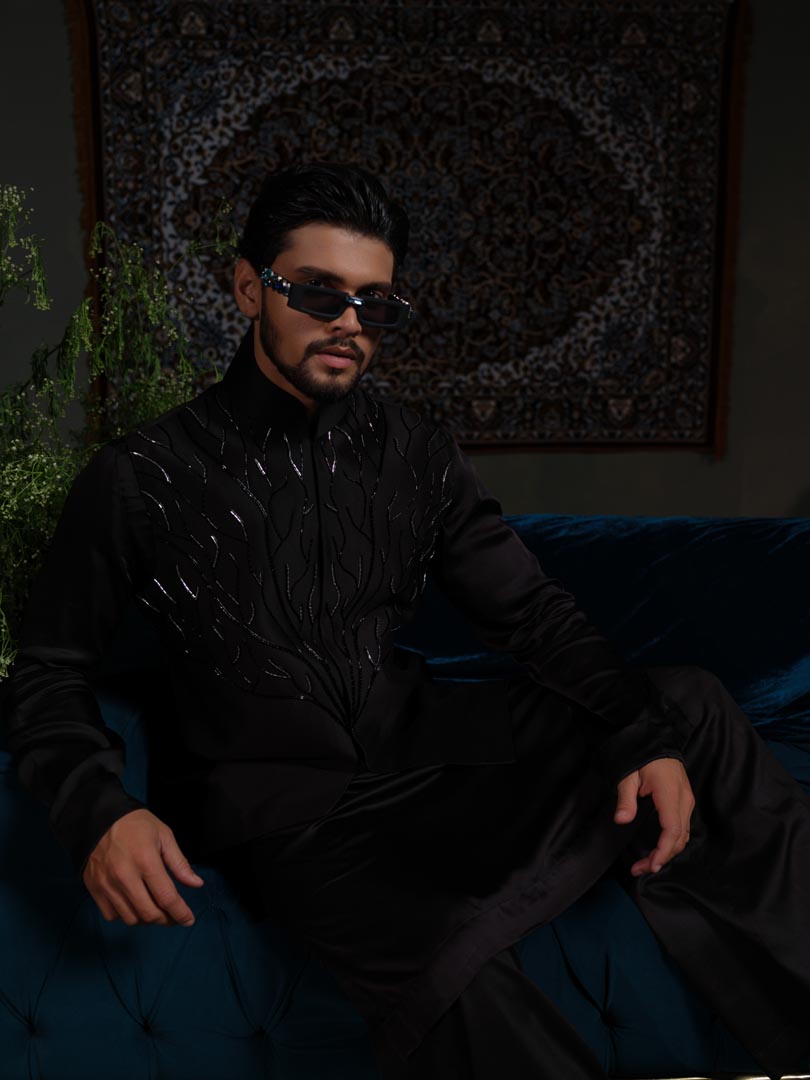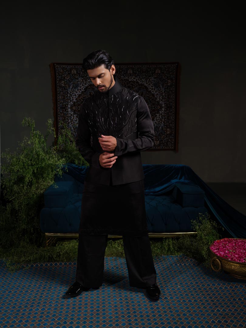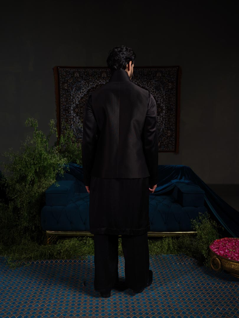 A black stunner Bundi embroidered in cutpipes depicting the electric thunder aura , crafted in silk is highlighted with elevated collar.