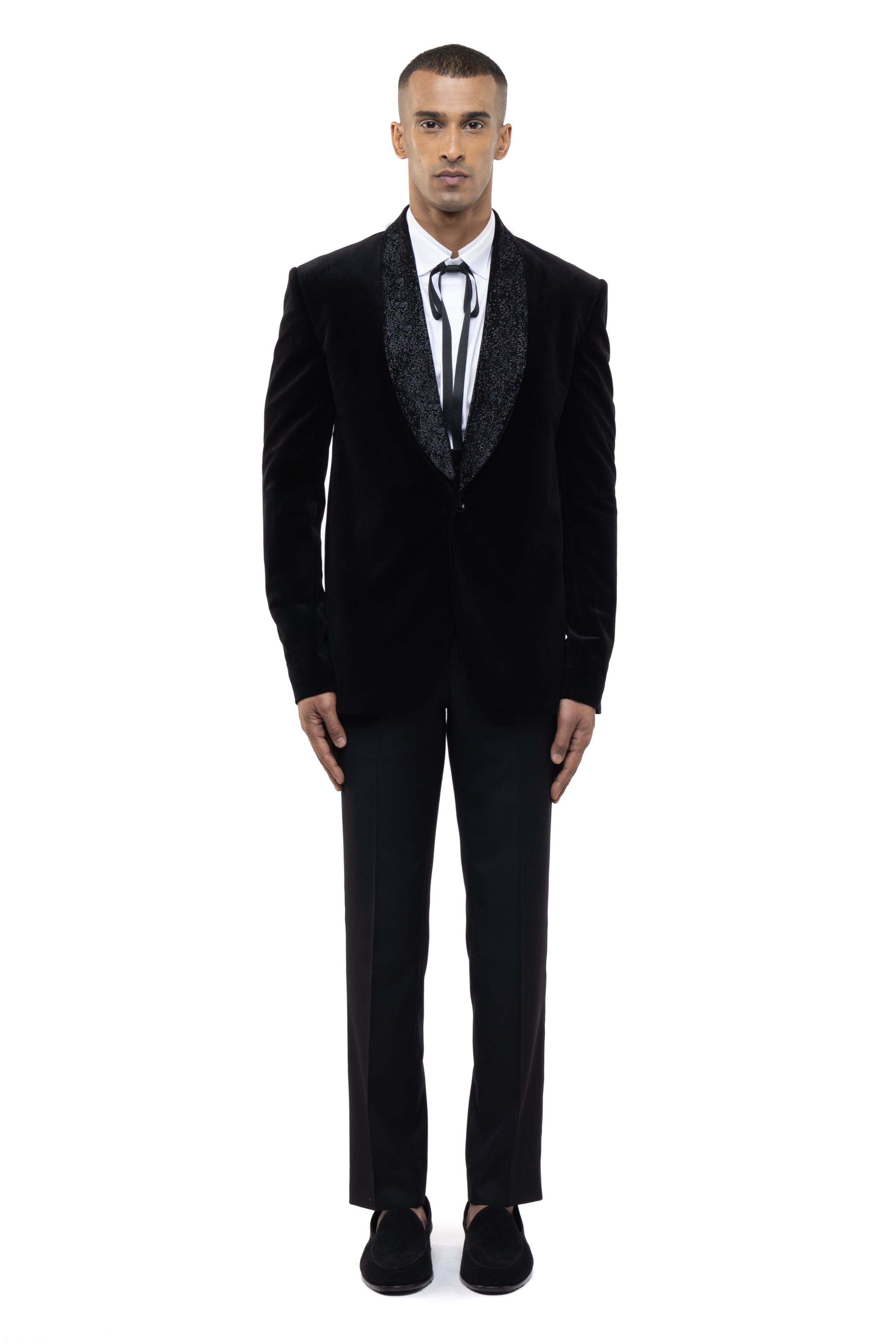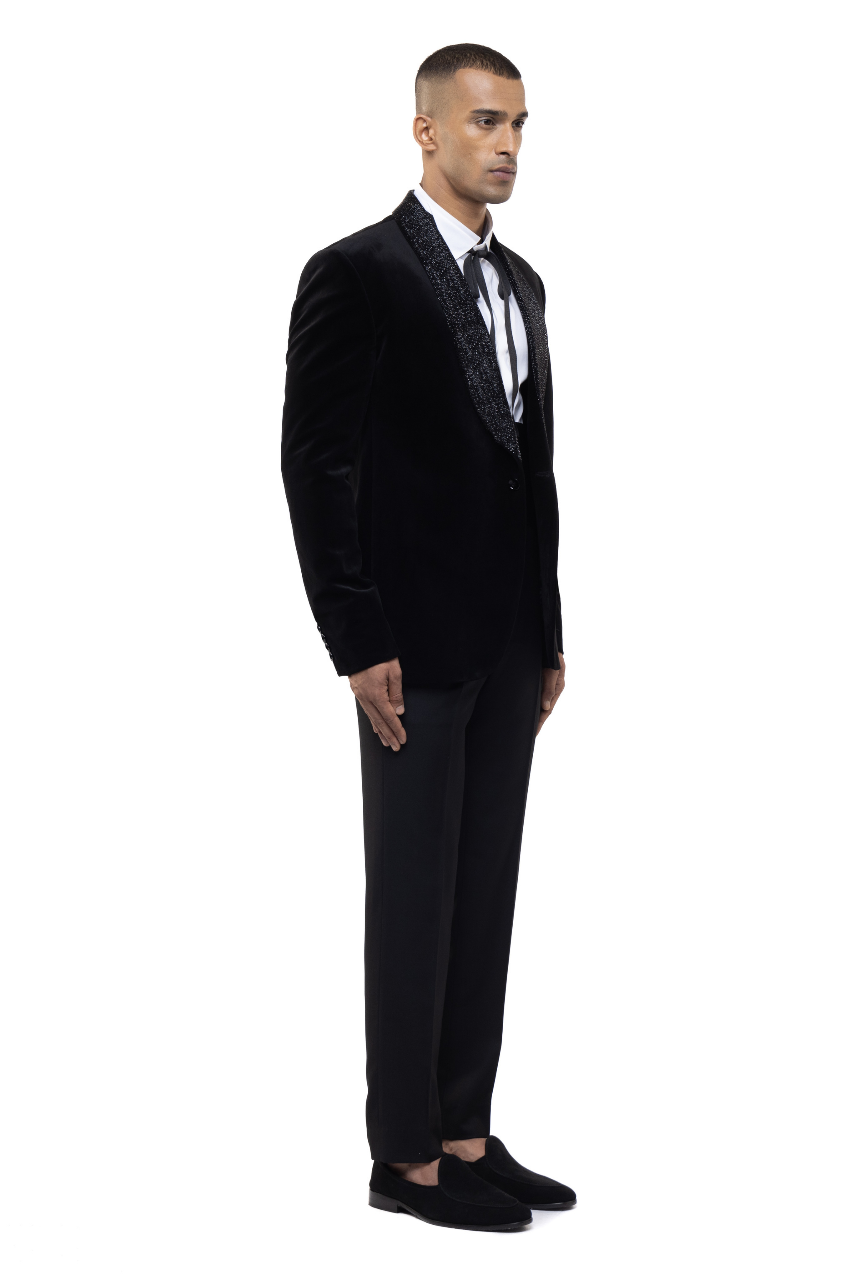 This black velvet cutdana shawl lapel tuxedo set exudes sophistication, ideal for reception, sangeet, and cocktail events.