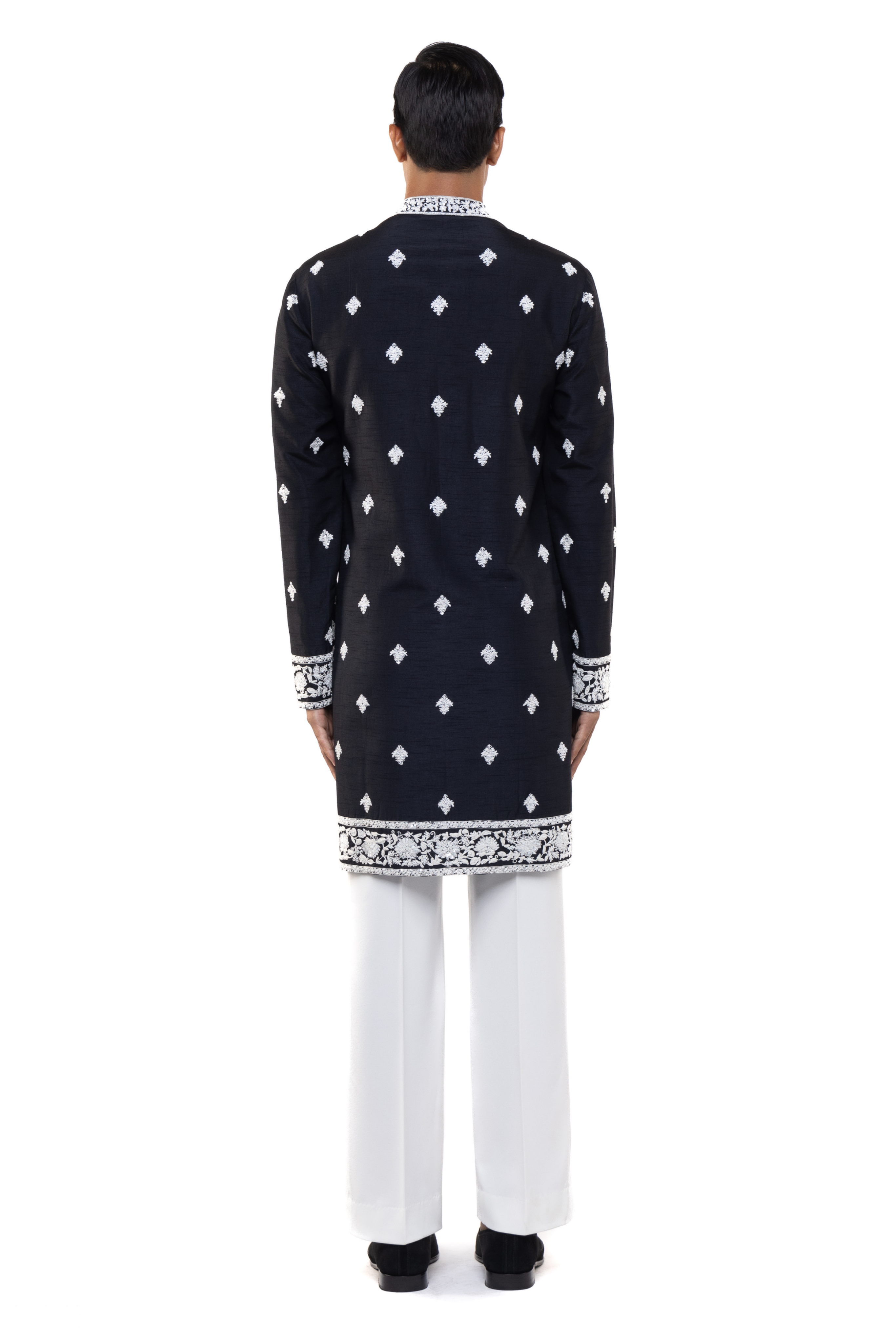 This black and white silk kurta set is adorned with intricate dori embroidery, perfect for ethnic and festive occasions.