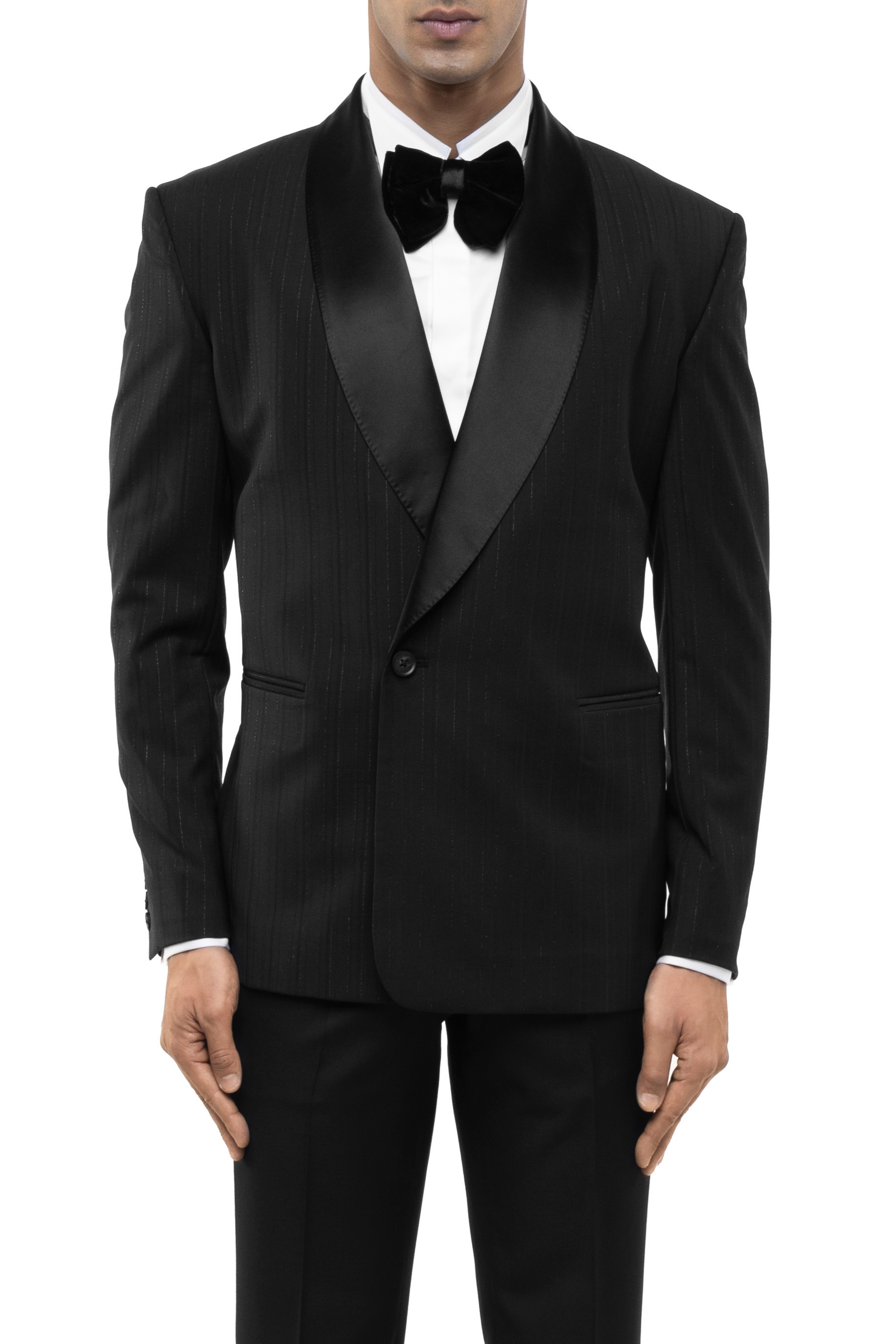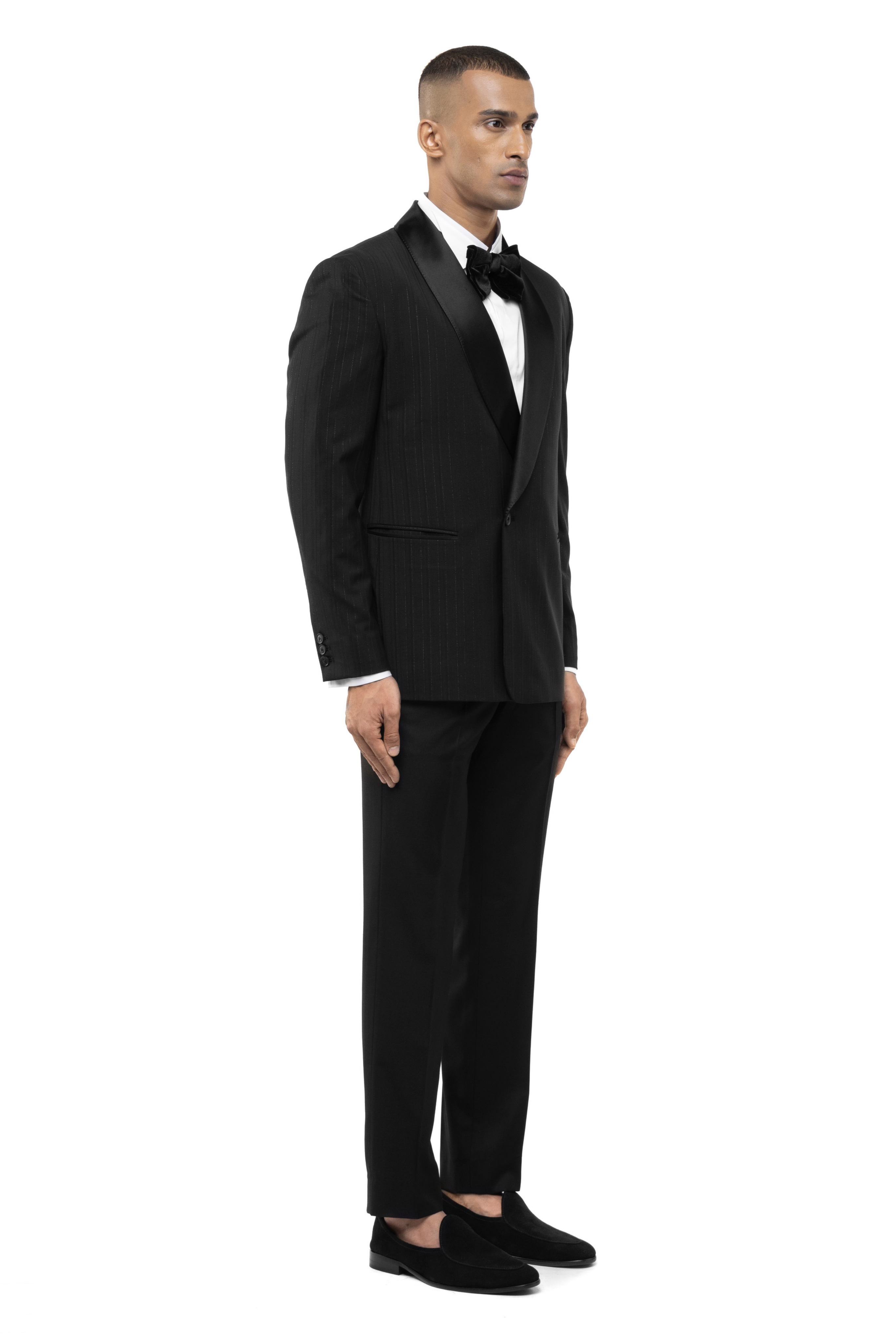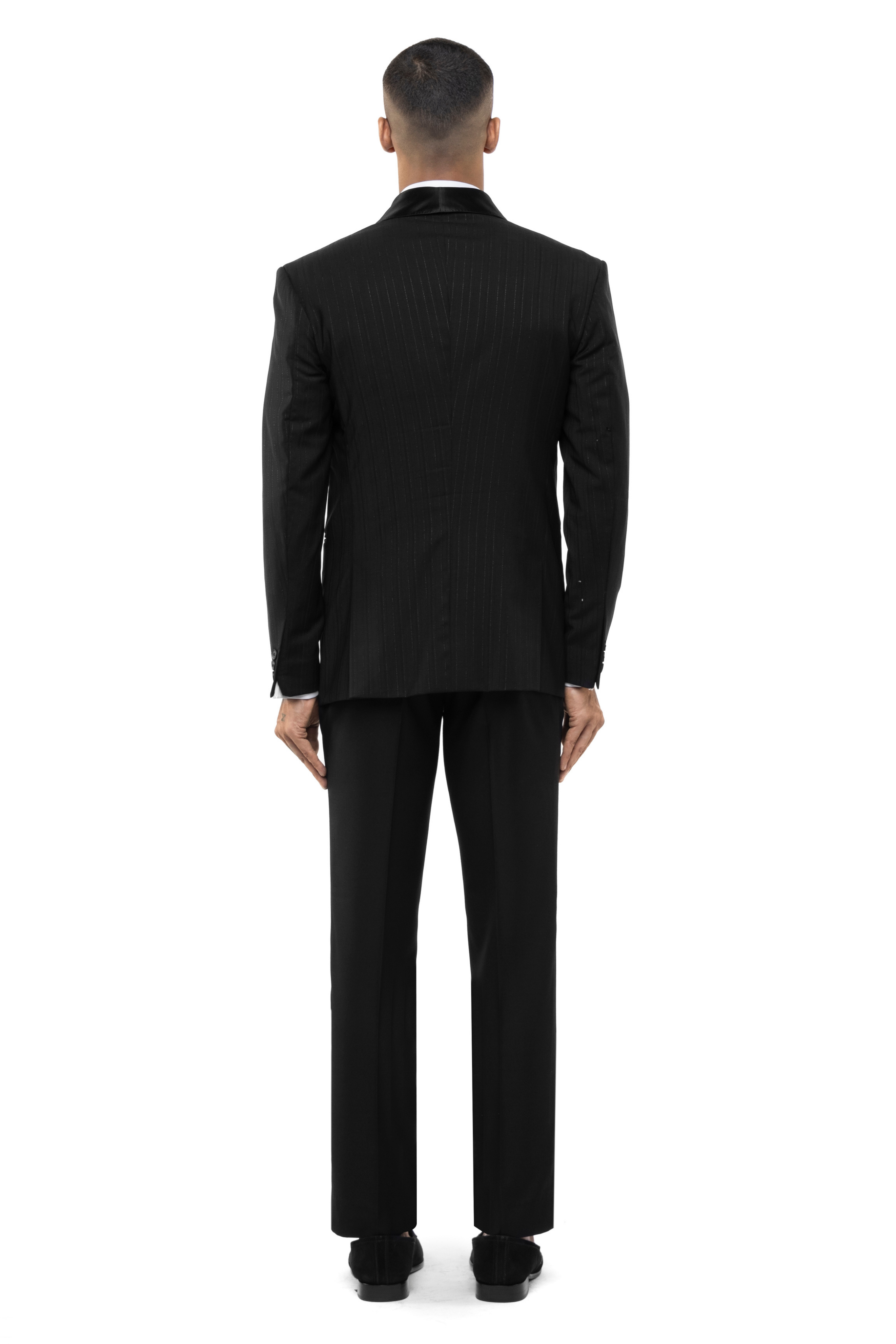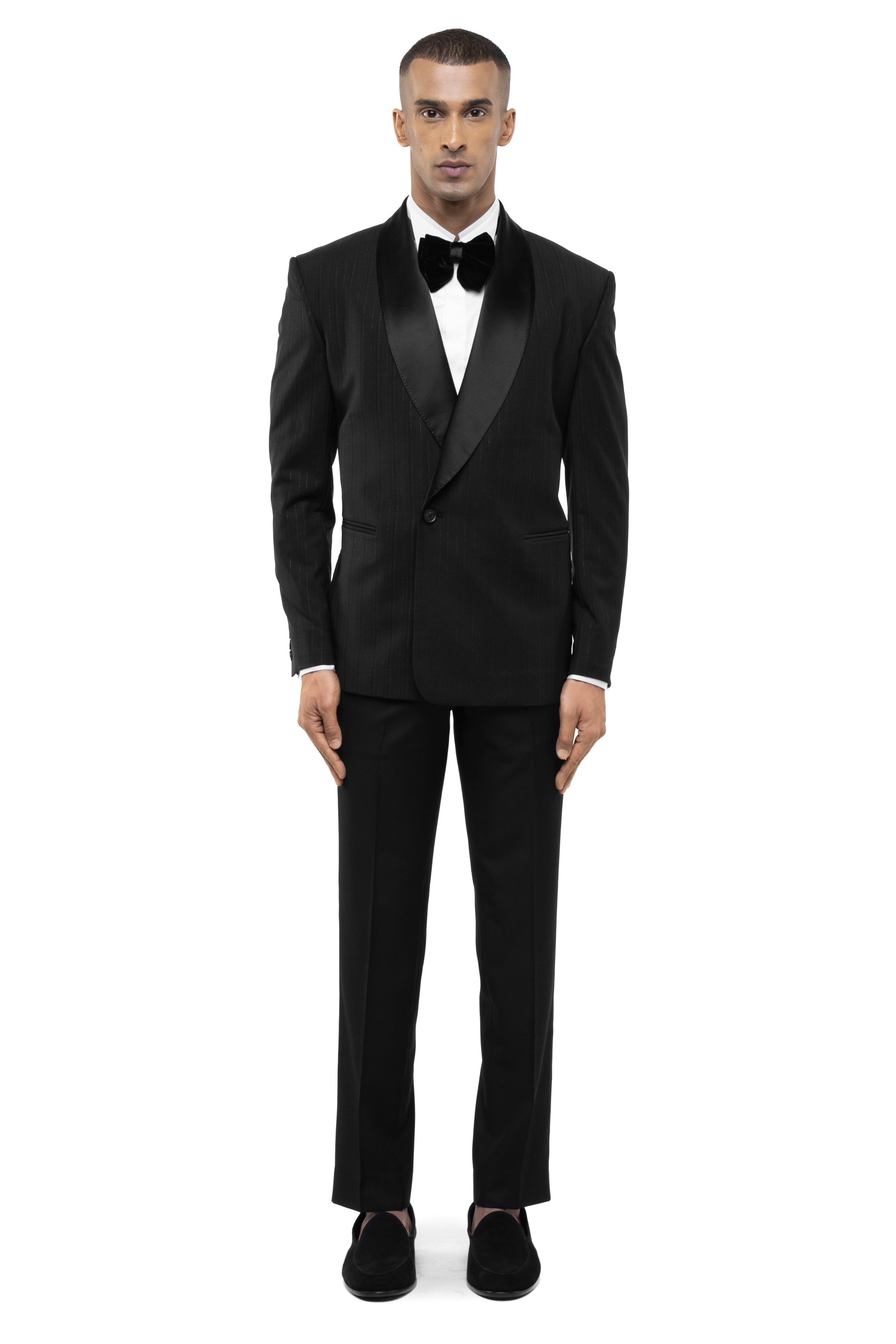 A classic double-breasted tuxedo in black worsted wool, featuring a shawl lapel, ideal for cocktail events, sangeet, or receptions.