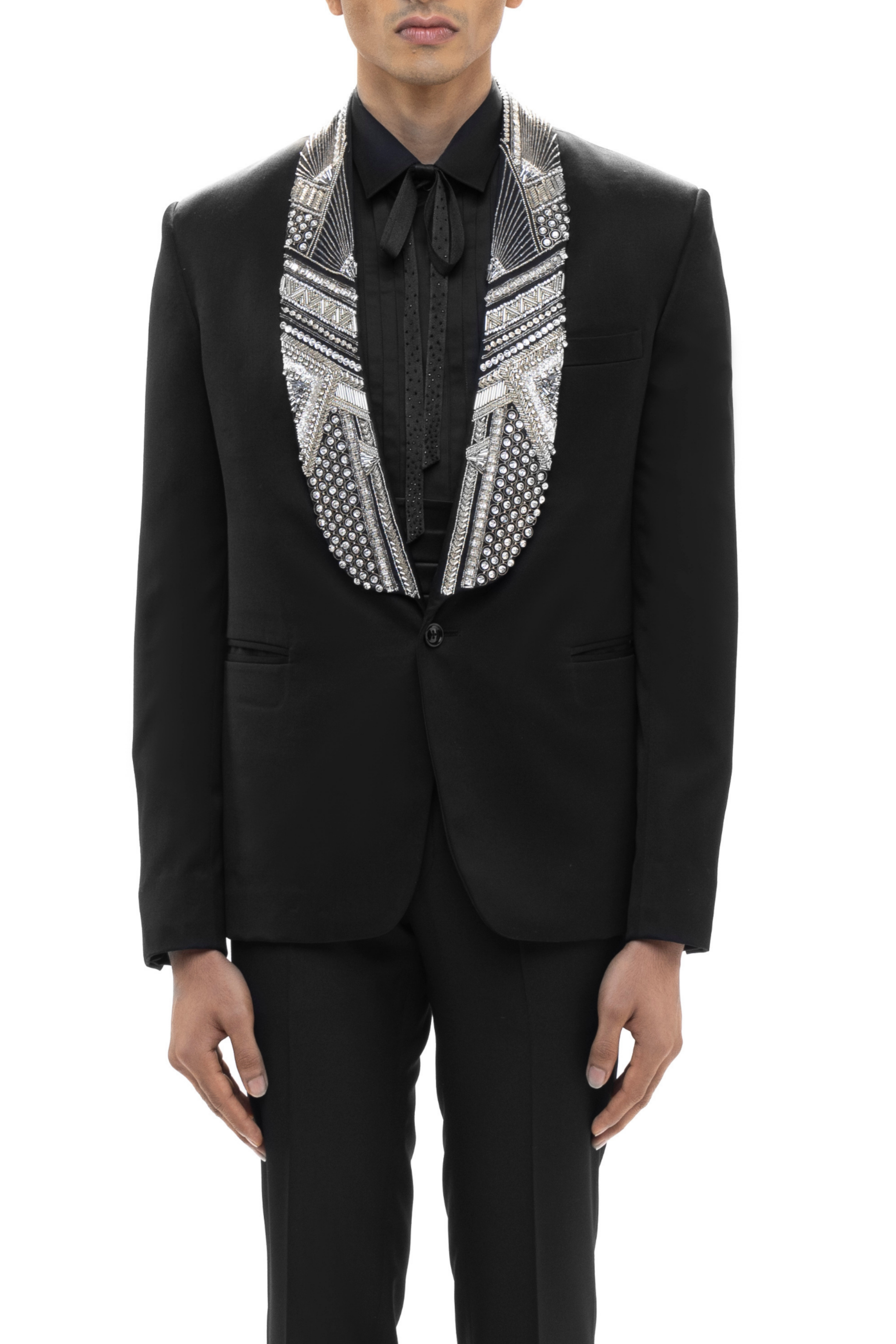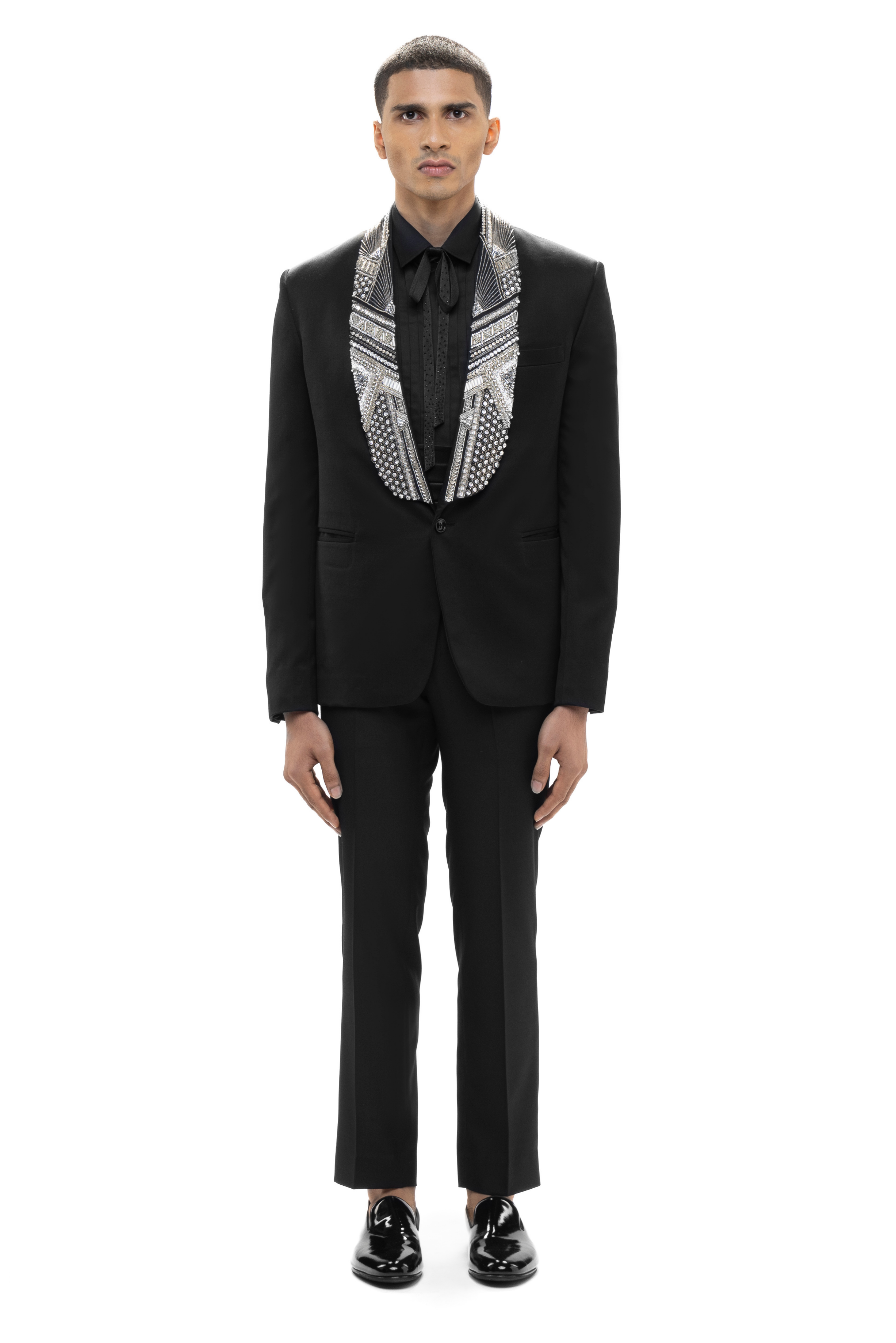 This black worsted wool tuxedo with peak lapels and beaded accents is perfect for reception, sangeet, or cocktail events..