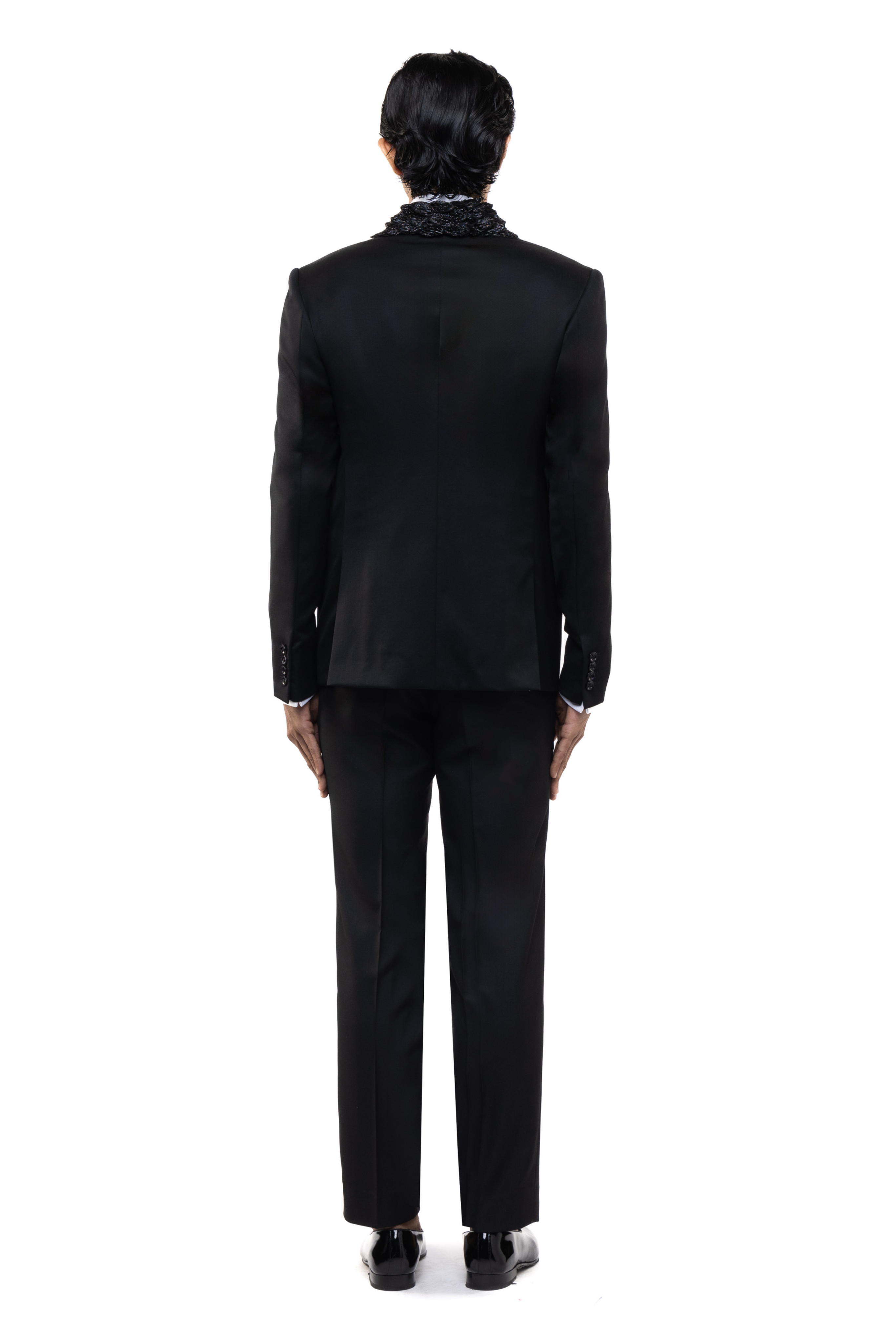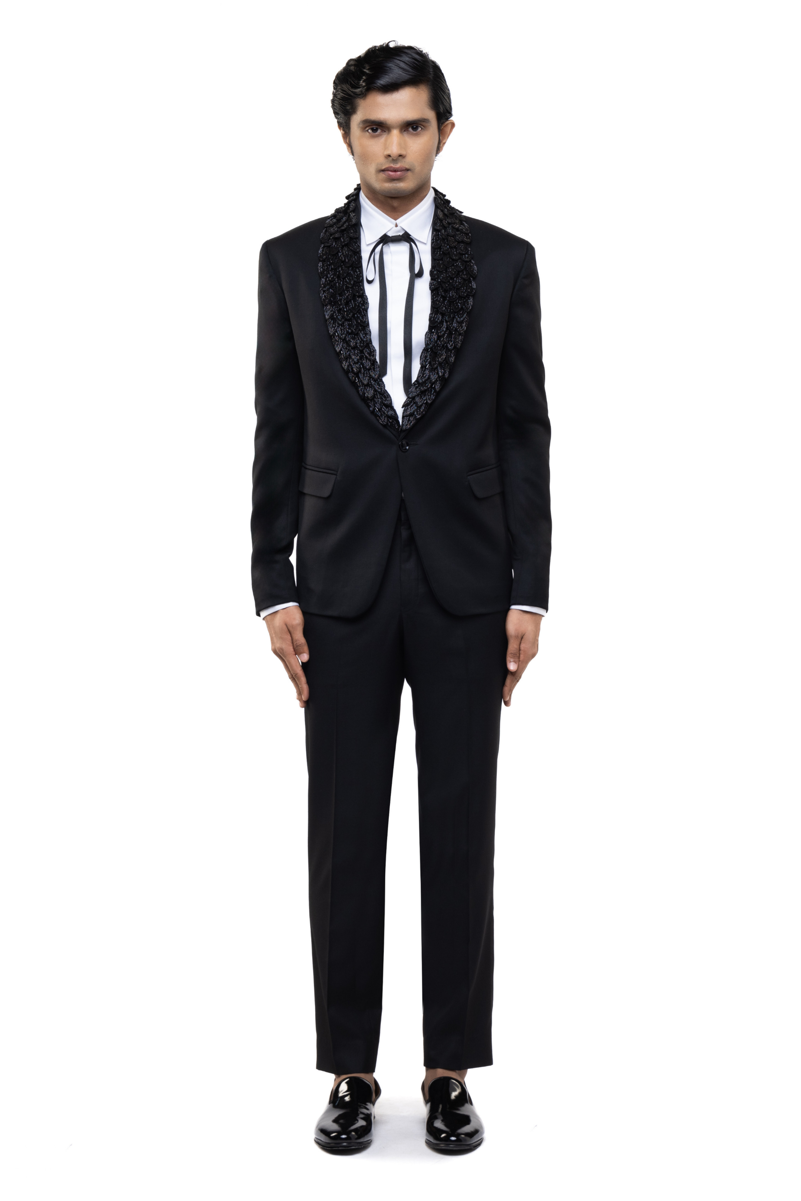 Elevate your reception, sangeet, or cocktail look with this tuxedo featuring a feather lapel and intricate embroidery. Style with a silk bow tie and polished accessories.