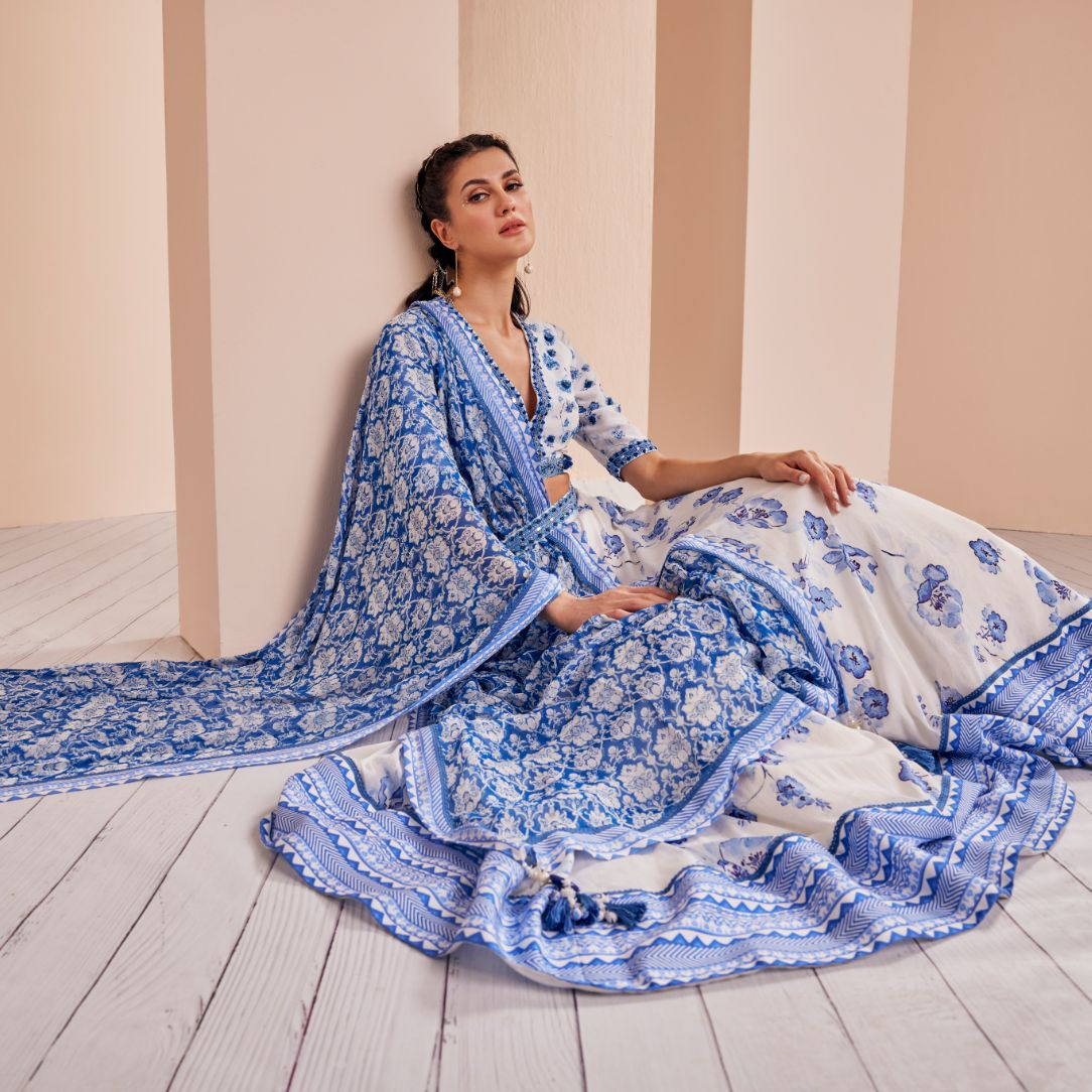 A true work of art, this ensemble is a testament to craftsmanship and exquisite detailing. The chanderi blouse boasts tonal embroidery, graced with the addition of rectangular mirror work and 3D highlighted print, creating a stunning visual texture that captures the eye.