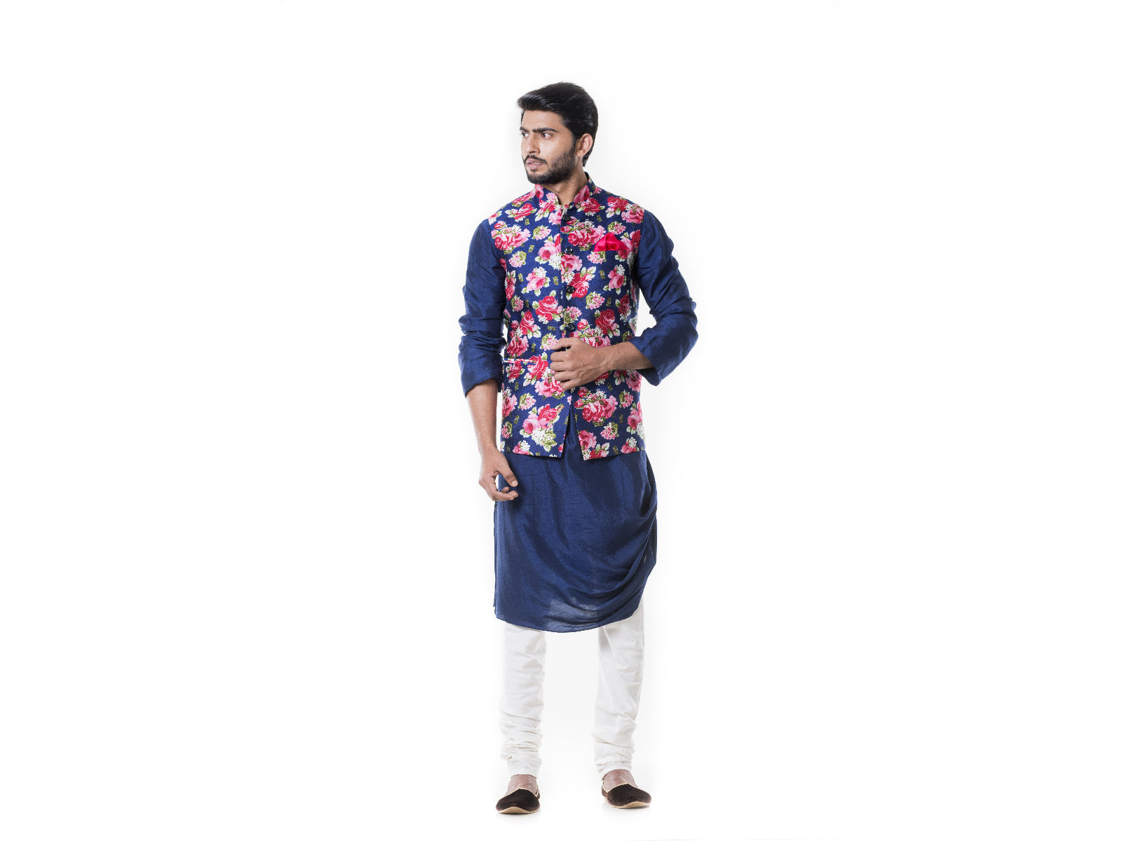 Featuring a Blue Cowl Kurta set with printed Blue Floral Waist Coat Set.