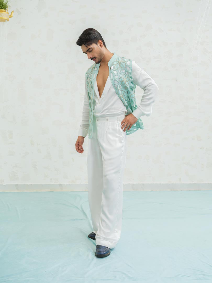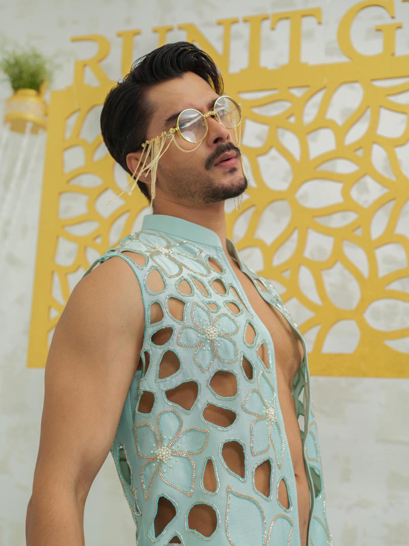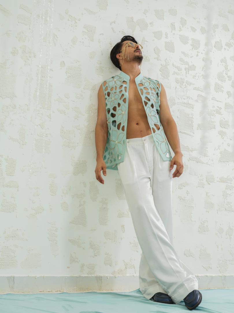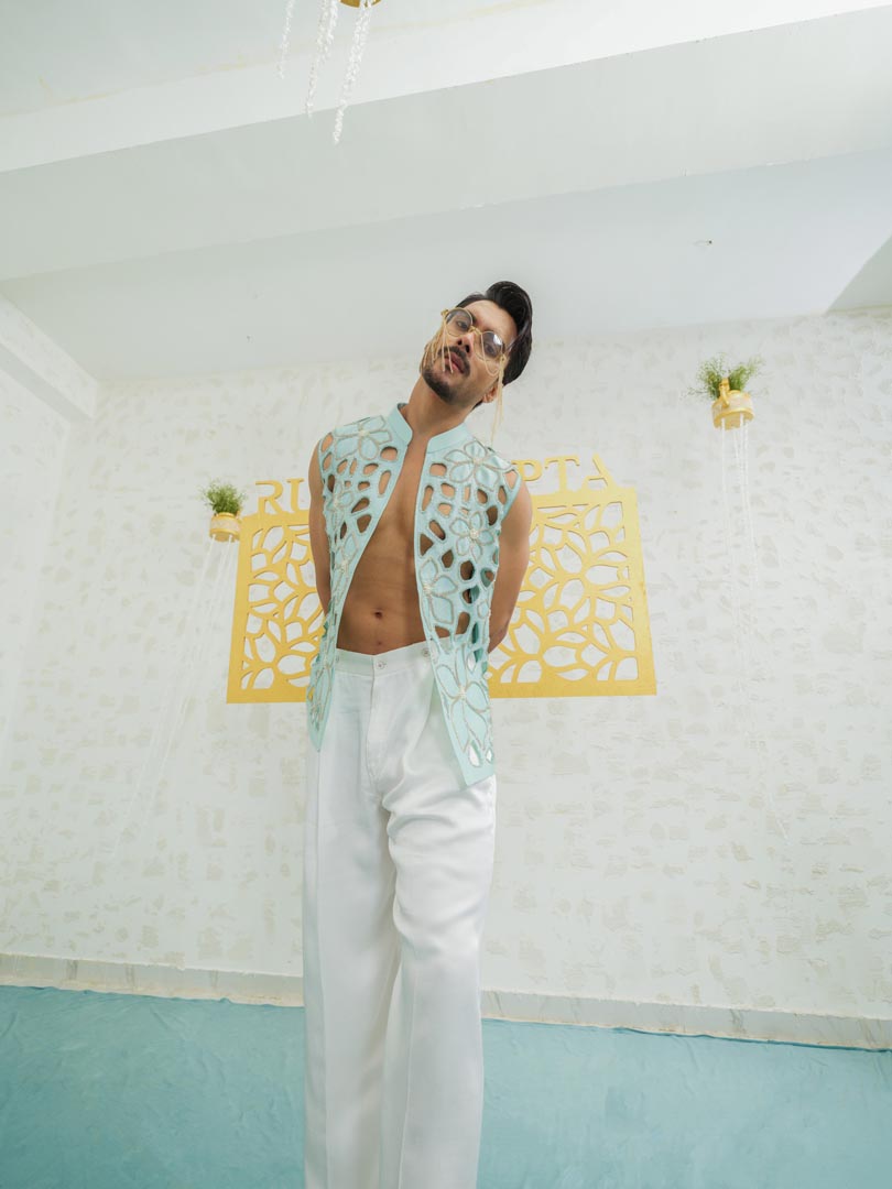 A pastel powder blue bundi designed with dramatic cutwork in floral patterns, embellished delicately with pearls and sequins to outline the motifs.Paired with a ivory shirt and ivory flared pants.