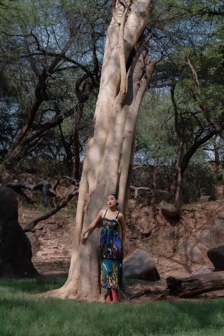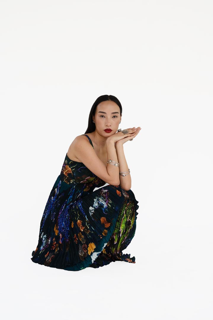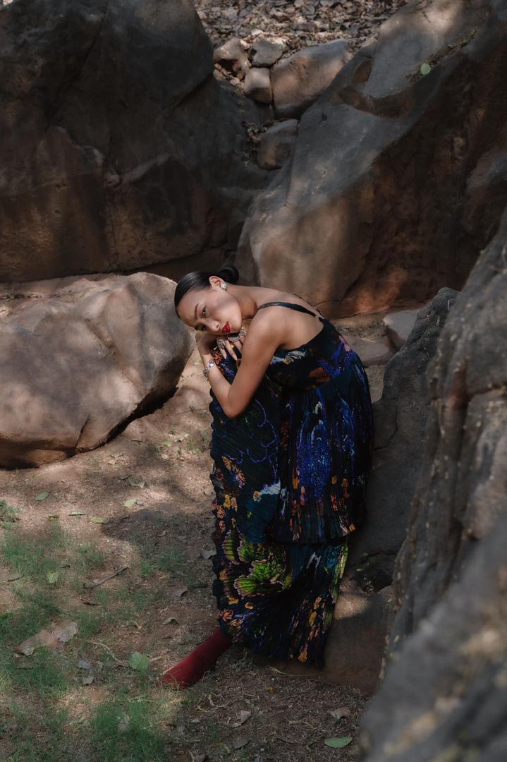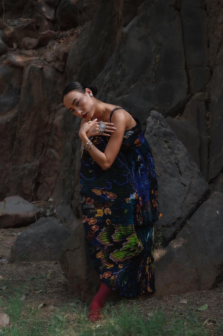 Blue Lily is heavenly printed solitude on its own, it is definietly a show stealer that has unique tone of landshore shades made of weightless pure silk. It has detailed drone shot painted on it and a splatter mix with handpleated work.