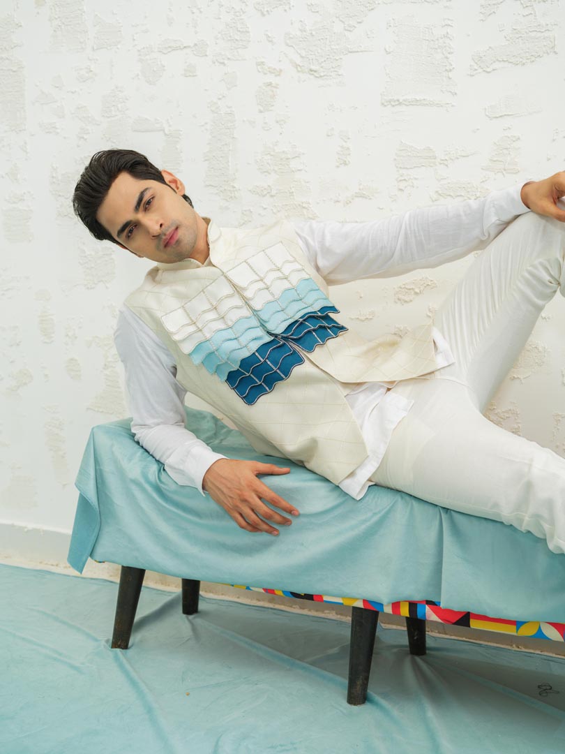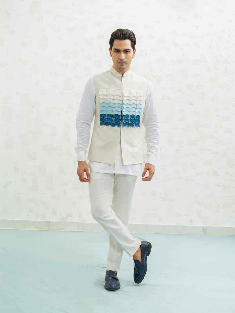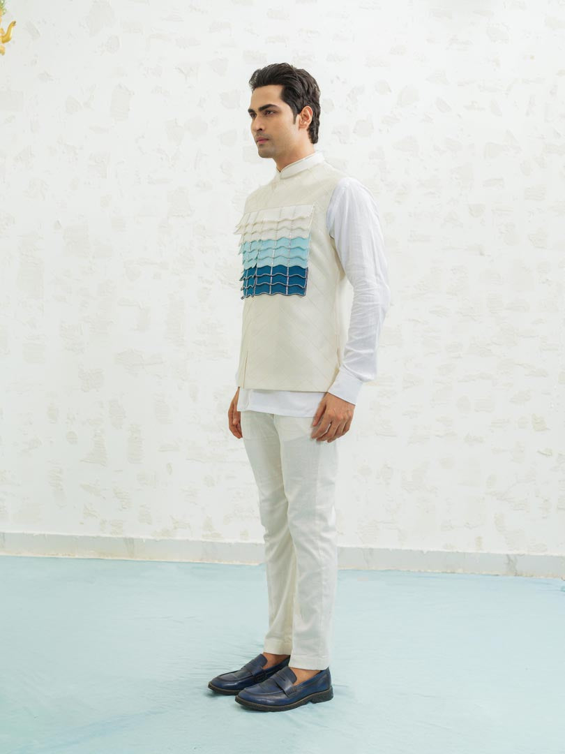 The bundi stands out with its artistic layered detailing and thread work with beautiful embroidery at the front in gradient shades of blue ,transitioning from light aqua to deep navy, creating a striking wave effect.