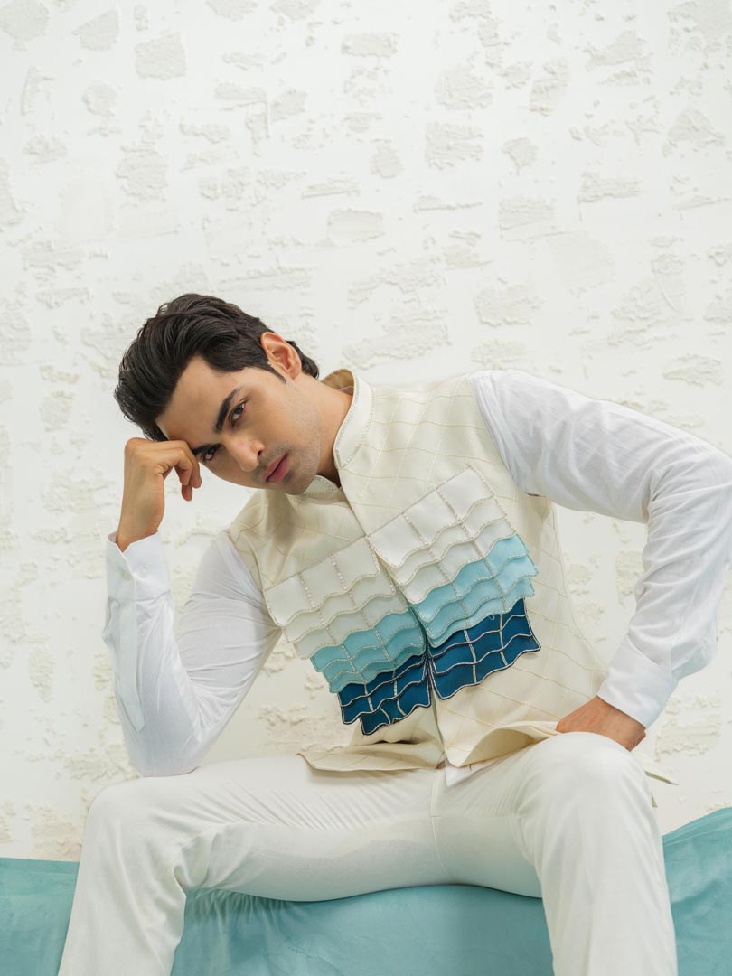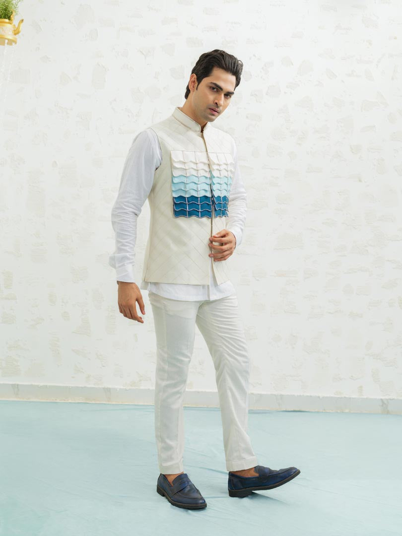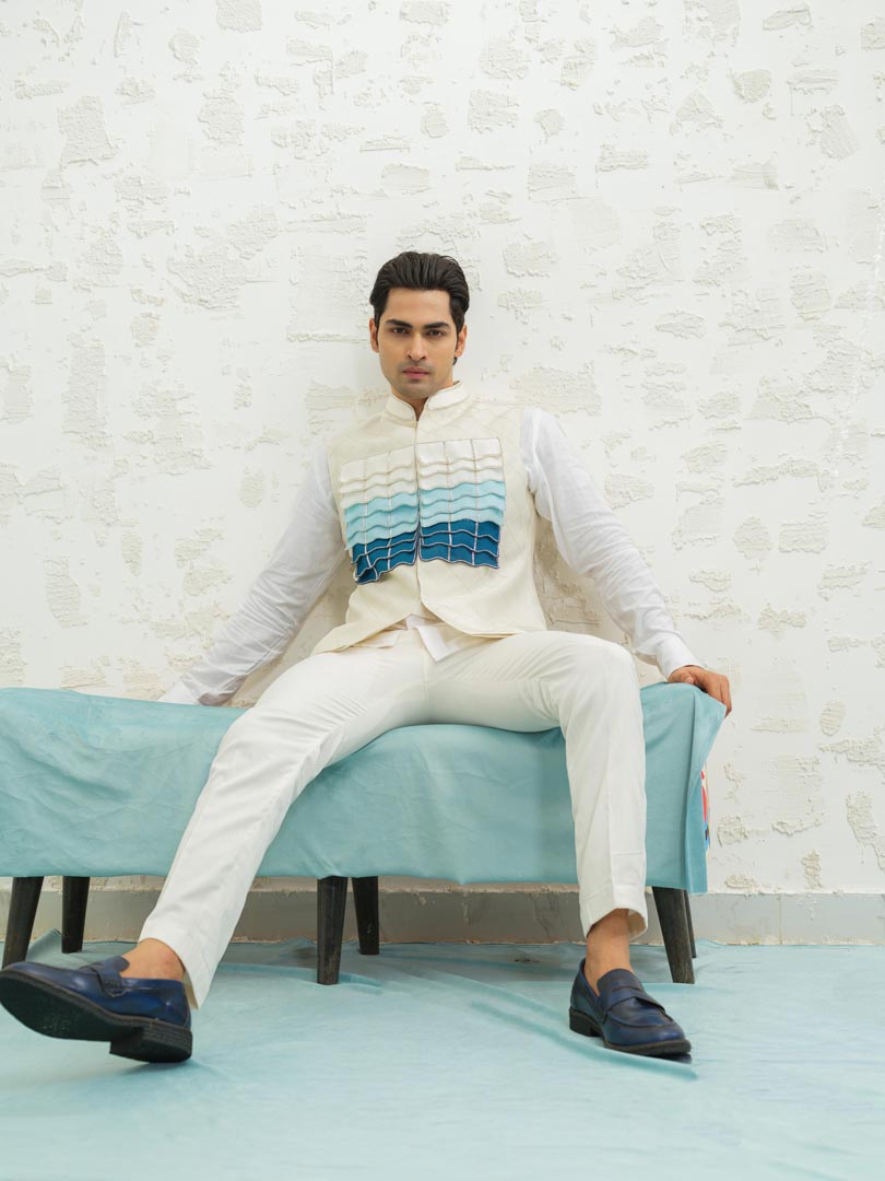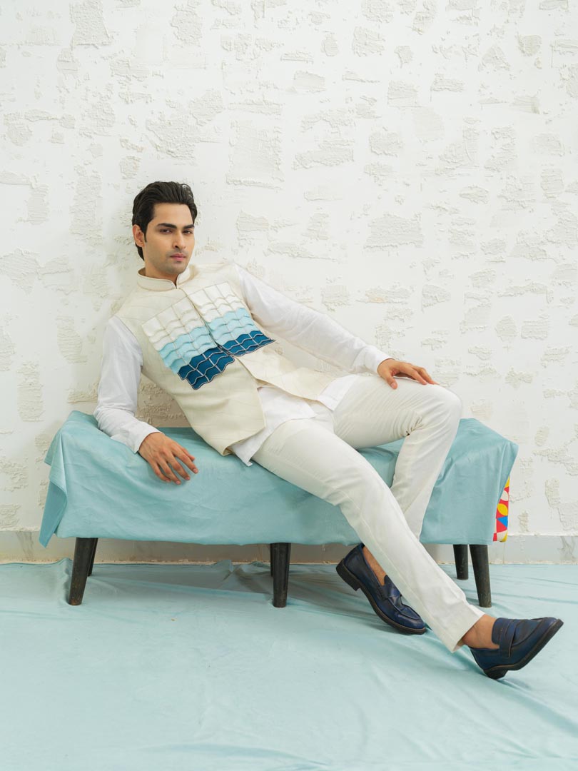 An ivory kurta set paired with a bundi. The bundi stands out with its artistic layered detailing and thread work with beautiful embroidery at the front in gradient shades of blue, transitioning from light aqua to deep navy, creating a striking wave-like effect. The rest of the outfit remains clean and understated with straight-cut ivory trousers and a crisp white kurta.