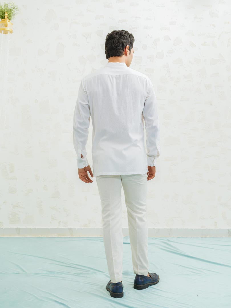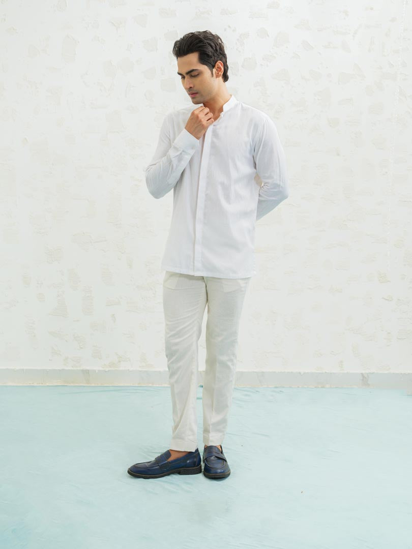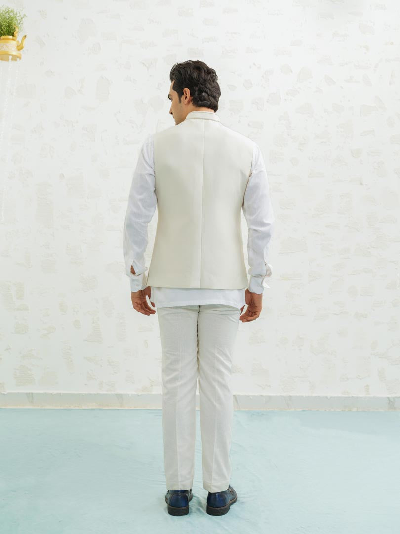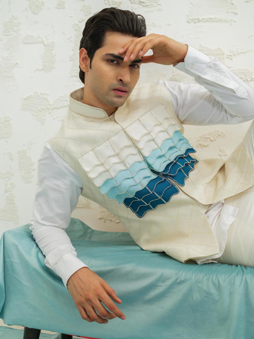 An ivory kurta set paired with a bundi. The bundi stands out with its artistic layered detailing and thread work with beautiful embroidery at the front in gradient shades of blue, transitioning from light aqua to deep navy, creating a striking wave-like effect. The rest of the outfit remains clean and understated with straight-cut ivory trousers and a crisp white kurta.