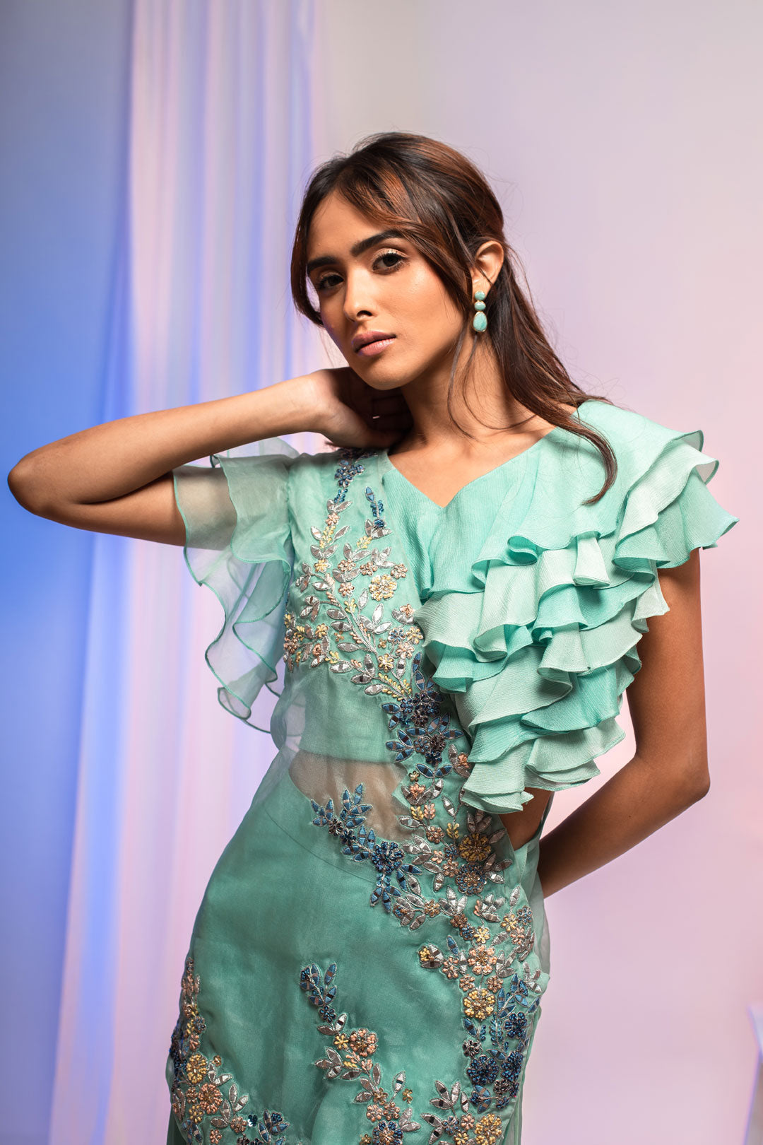 Aqua Ruffled Crop Top With Embroidered One Sided Tie Up Cape, Paired With Pallazo.