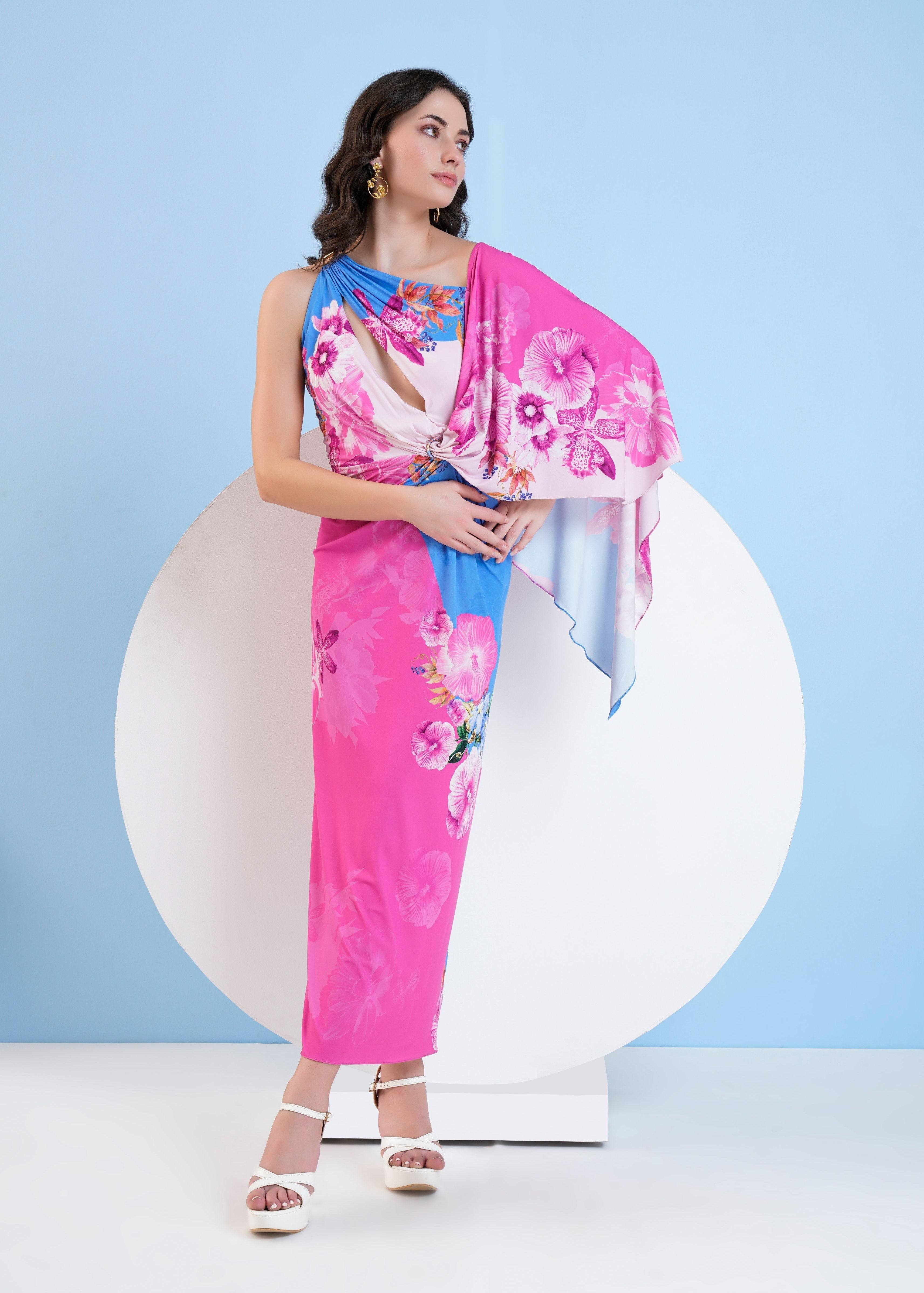 Featuring blue pastoral long dress in jersey with drape sleeve.