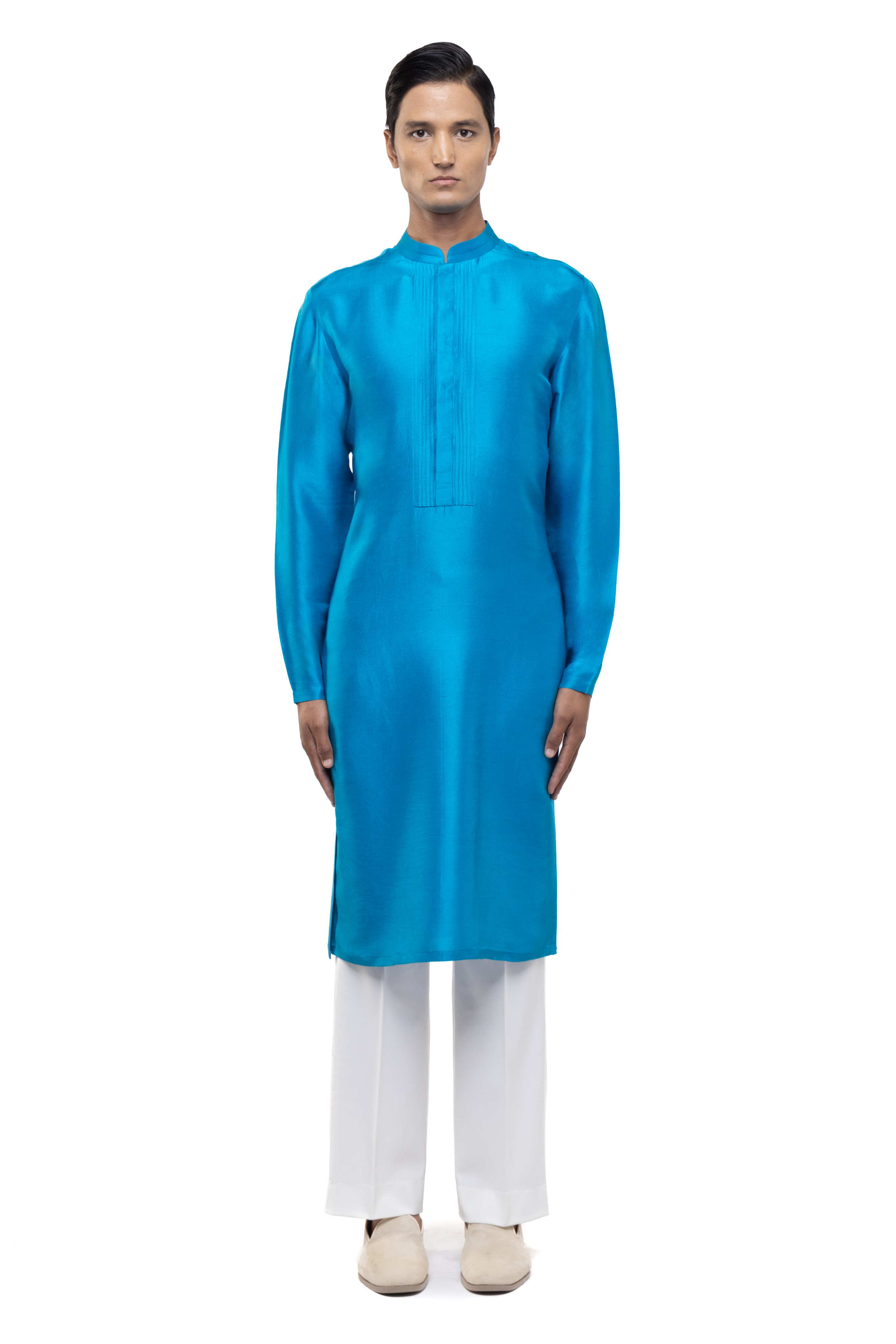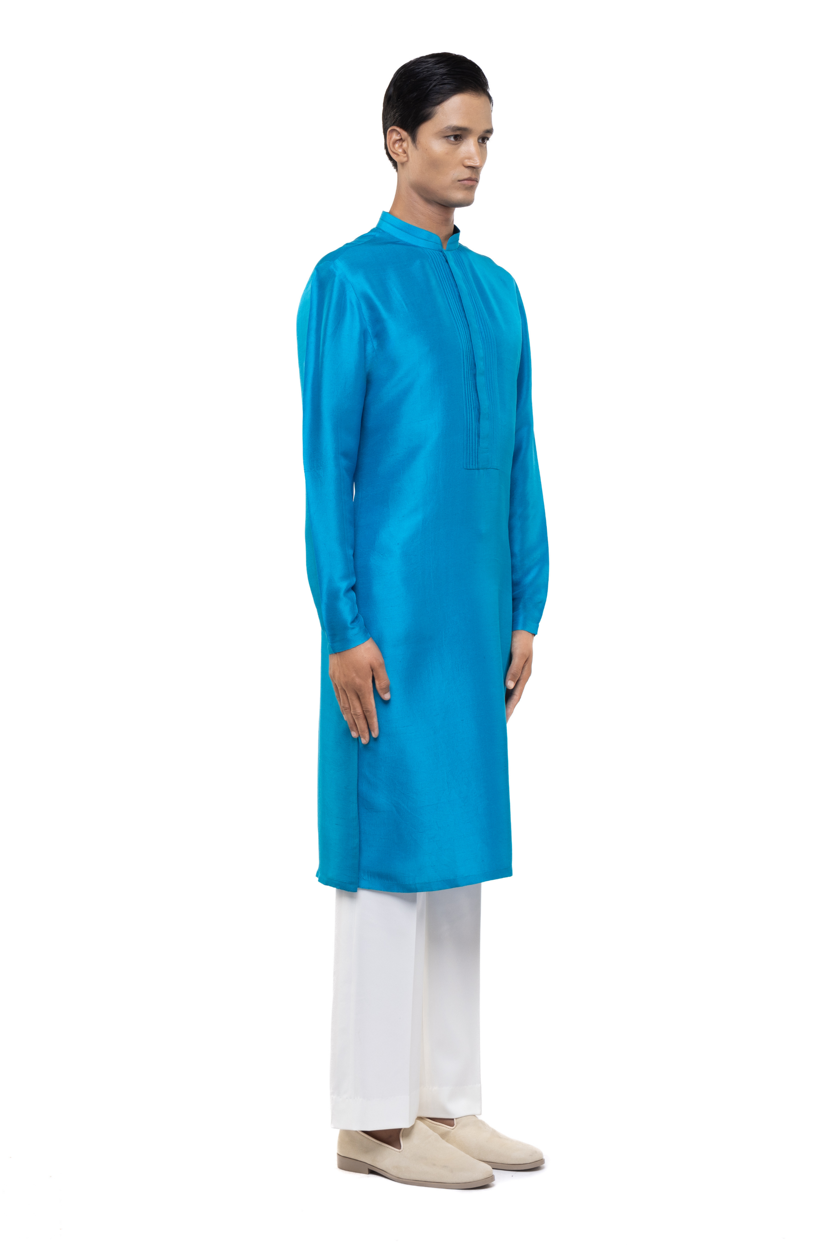 This blue silk kurta set, detailed with a pleated placket, is a sophisticated choice for ethnic and festive occasions.