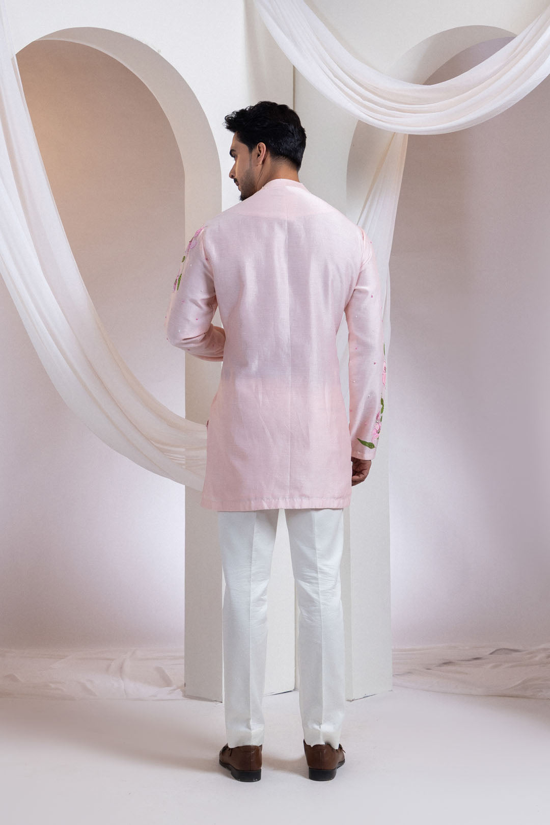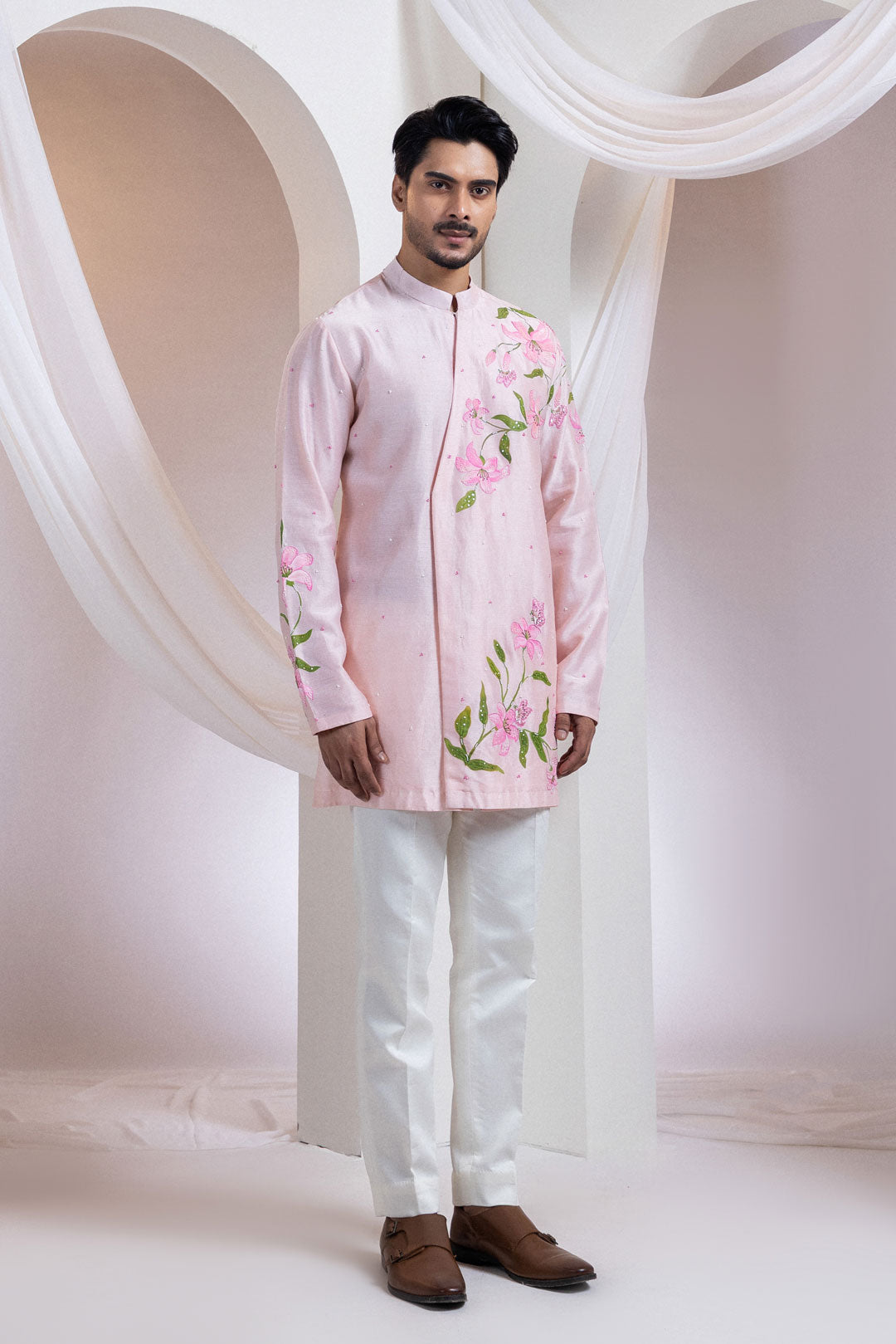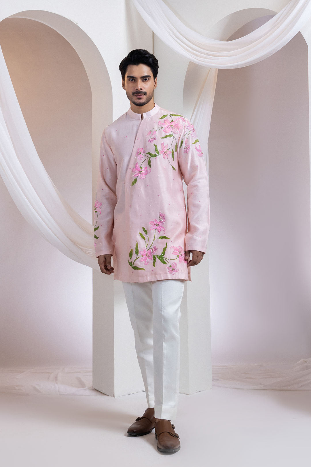 A refined two-piece set featuring an overlapping front-panel kurta paired with matching pants. The kurta is hand-painted with delicate floral motifs, elevated by soft pink thread embroidery, sequins, and bead accents. Scattered French knot embroidery adds gentle texture across the fabric, creating an understated yet artistic surface. Ideal for festive gatherings or elegant daytime affairs.