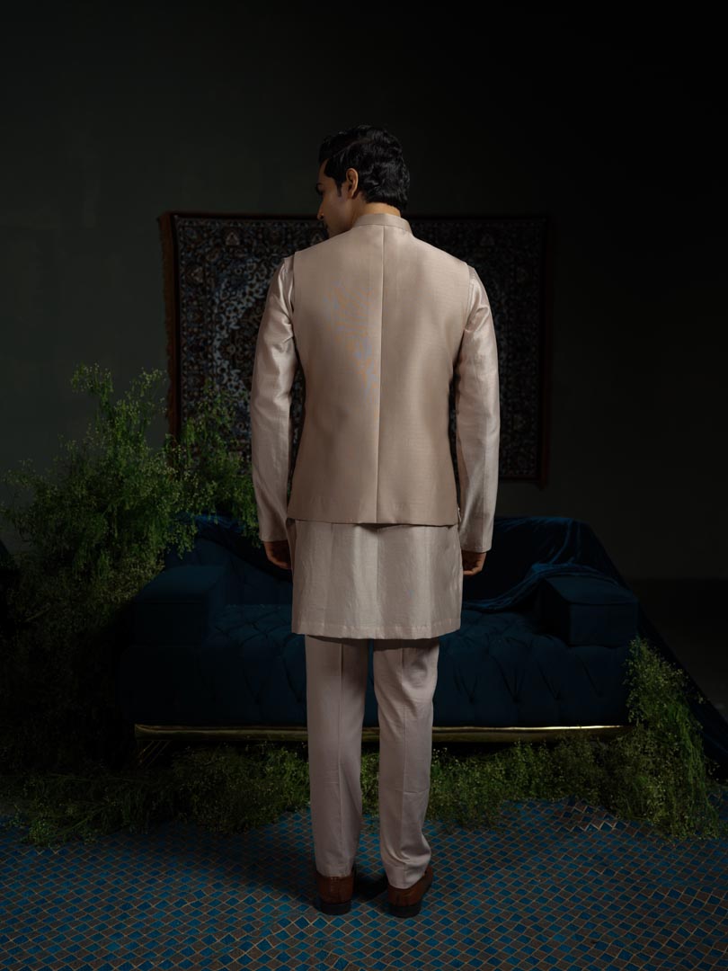 The bundi serves a structured cut with enhanced border and floral beadwork embroidery. Made in chanderi silk, the jacket serves a multi-occasional look.