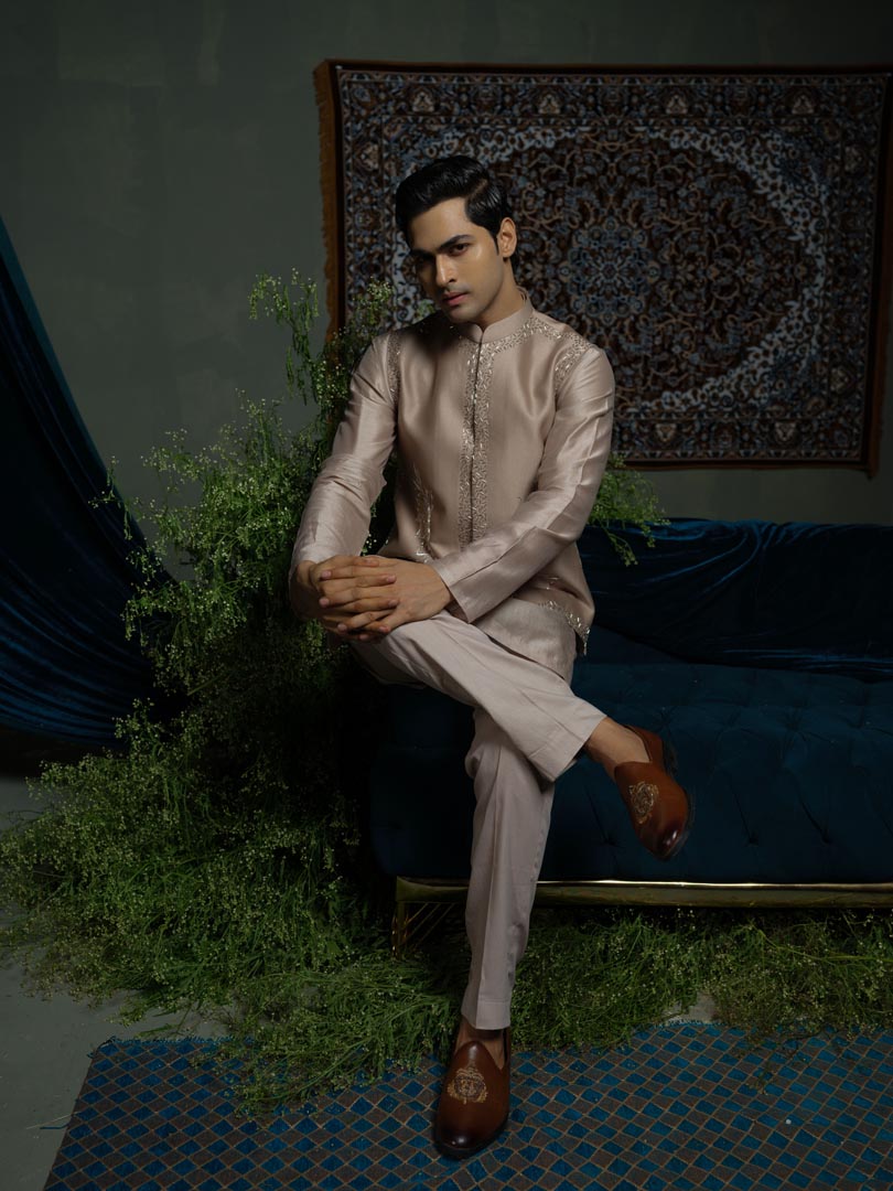 The bundi serves a structured cut with enhanced border and floral beadwork embroidery. Made in chanderi silk, the jacket serves a multi-occasional look. Paired up with Lighter tone kurta set in chanderi and vegan silk.