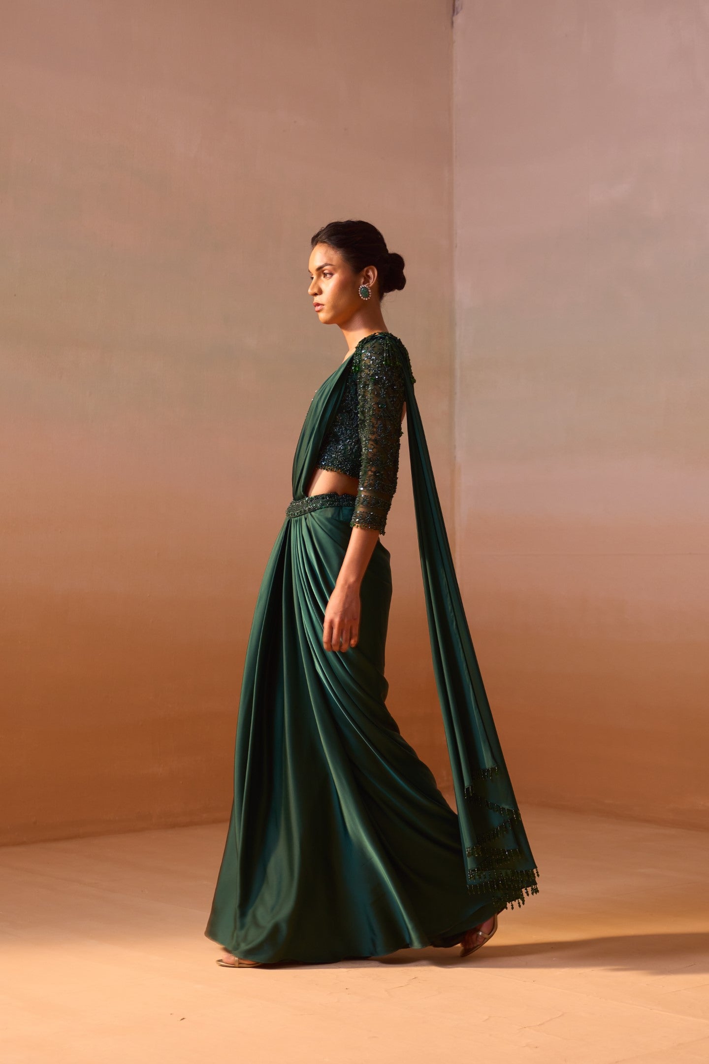Bottle green satin pre-draped saree with tonal swarovski sequins and beadwork embroidered blouse.