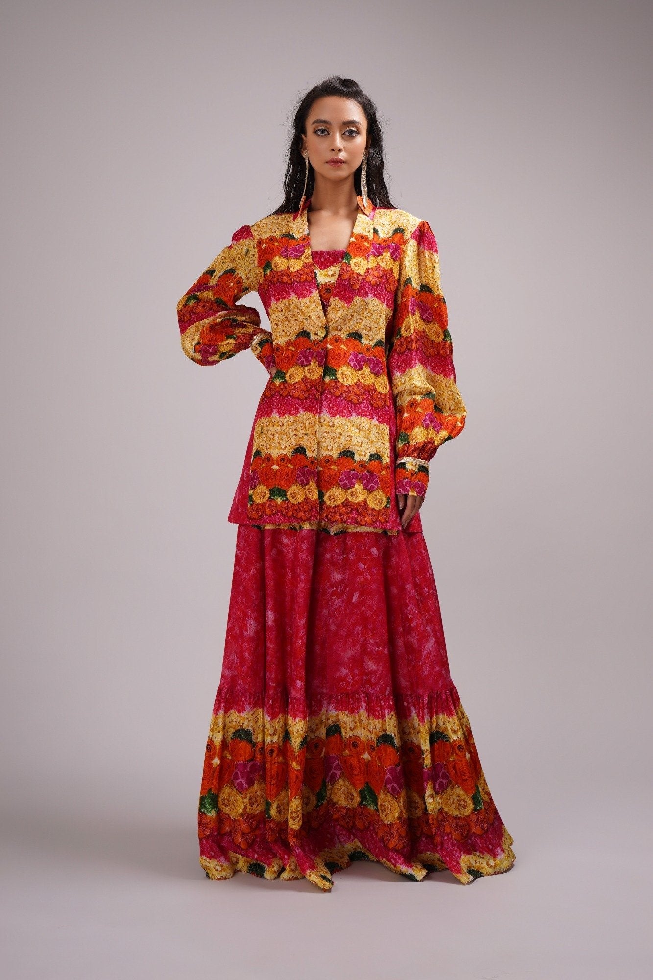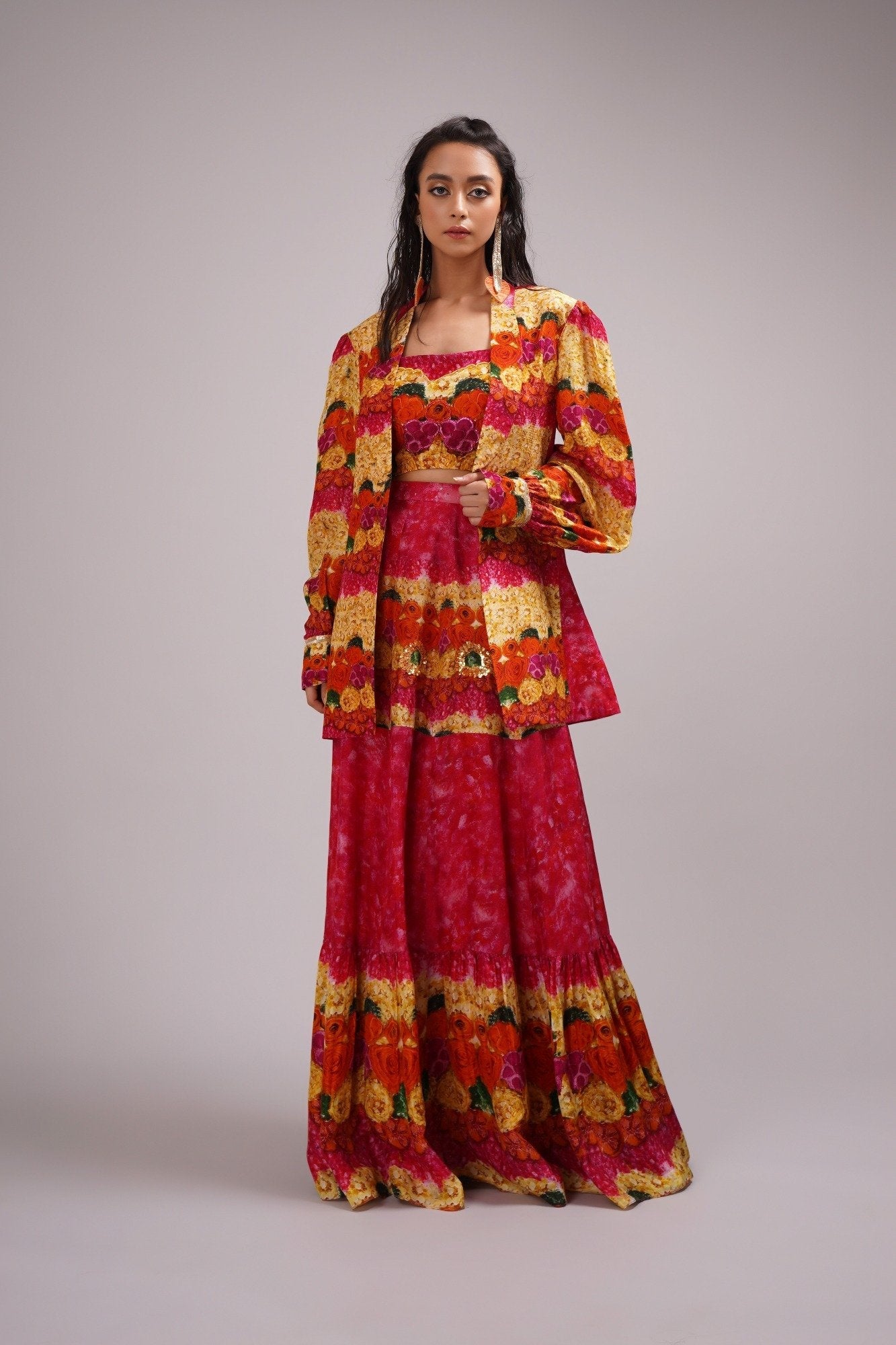 A Hand Painted Pink-Yellow Flower Row Print Silk Lehenga Paired With Hand Embellished Scoop Neck Bustier Blouse Along With Stylised Sleeve Jacket.