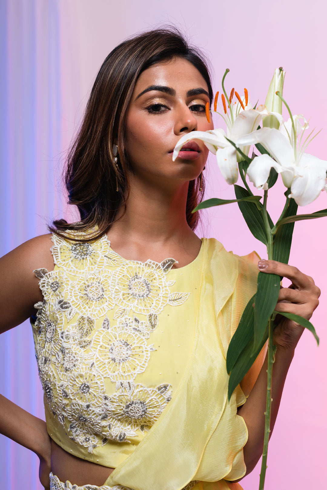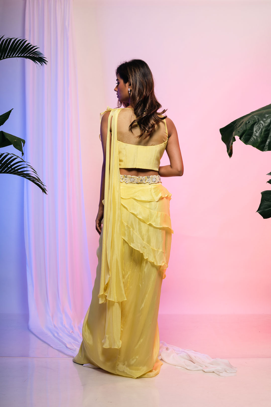 Firefly Yellow Draped Saree Set, With Draped Skirt With Attached Ruffled Palla And Embroidered Blouse.