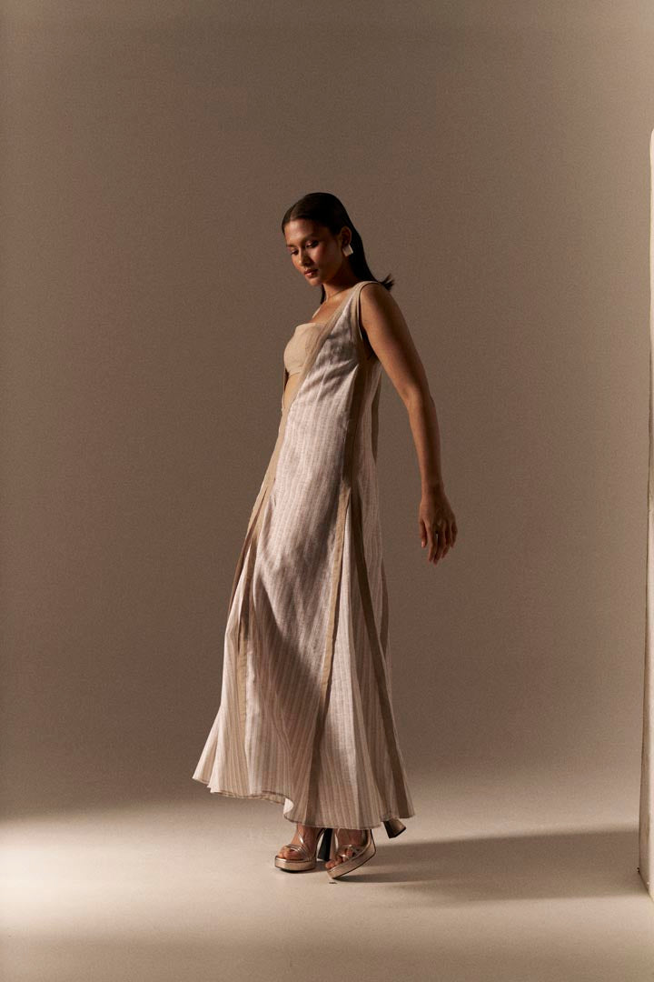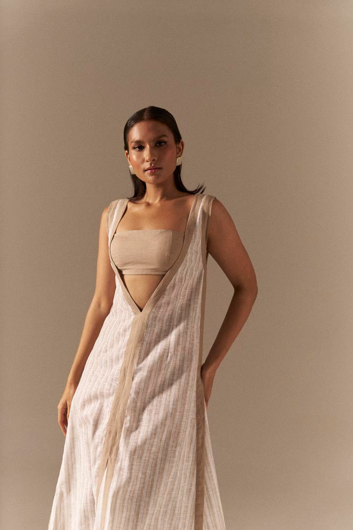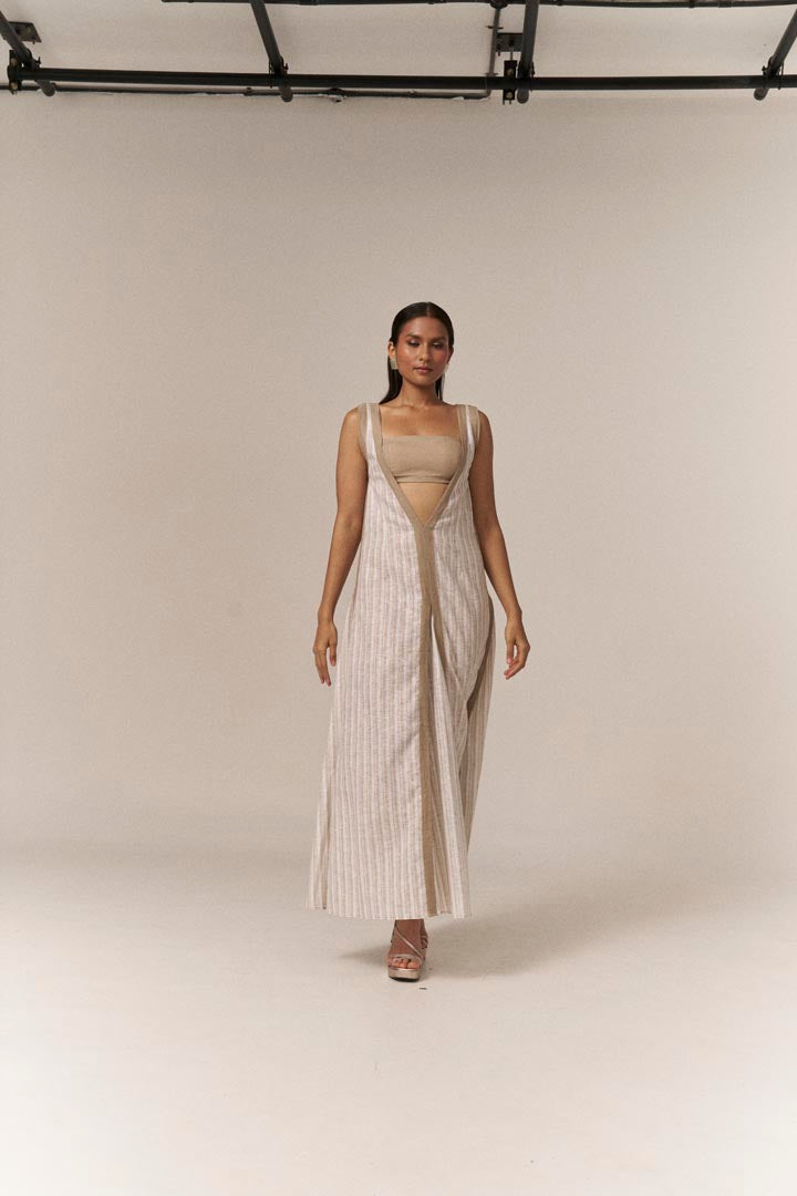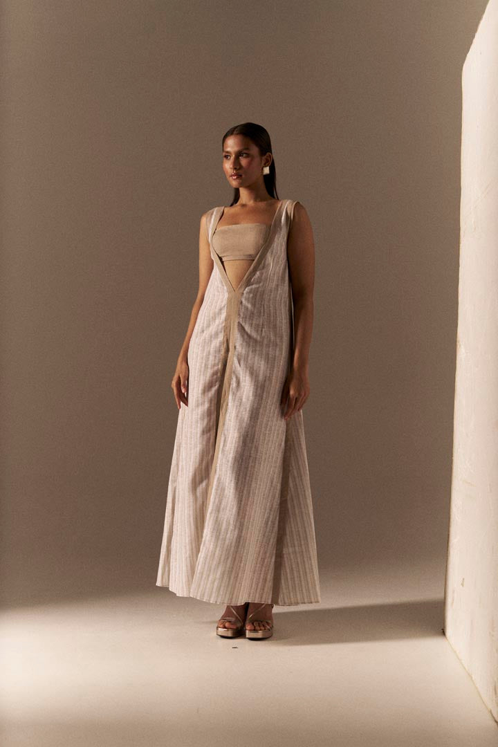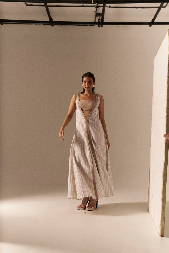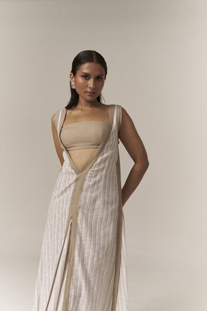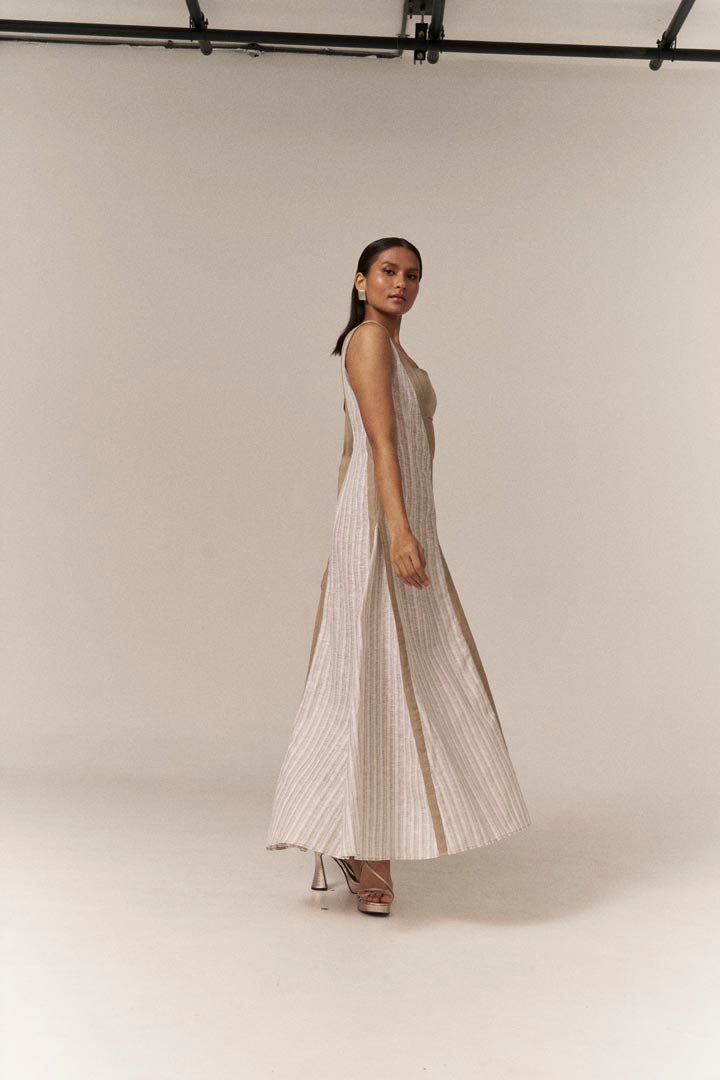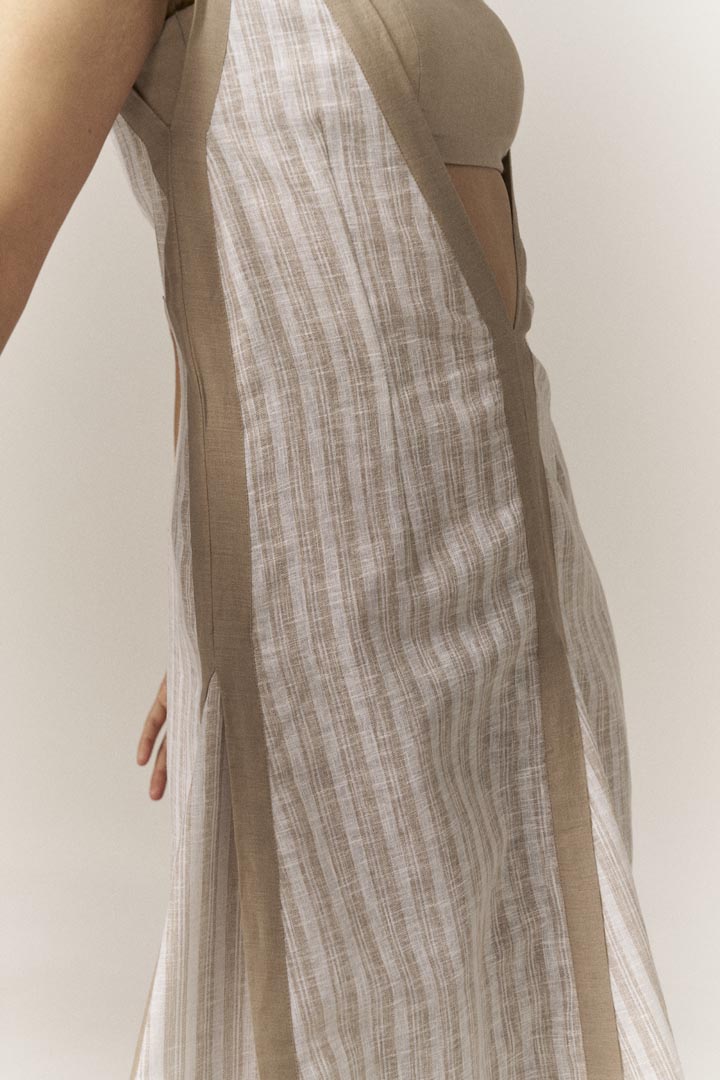 This stunning linen-cotton dress is a flowy dream! With a unique cutout detail and a breezy, striped design, it's perfect for a chic, effortless look. Paired with nude heels, it's a stylish outfit for a sunny day out!