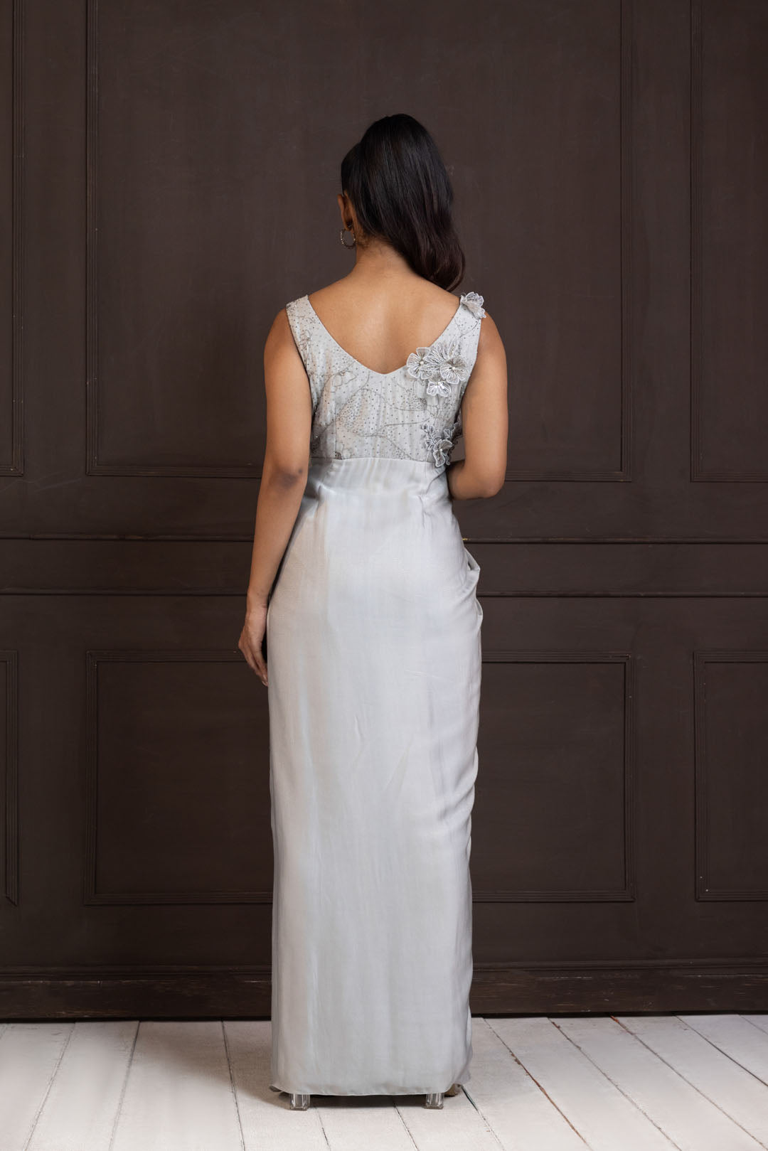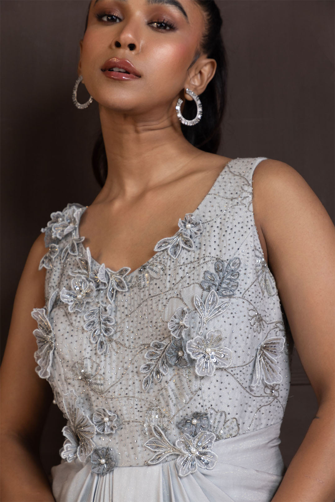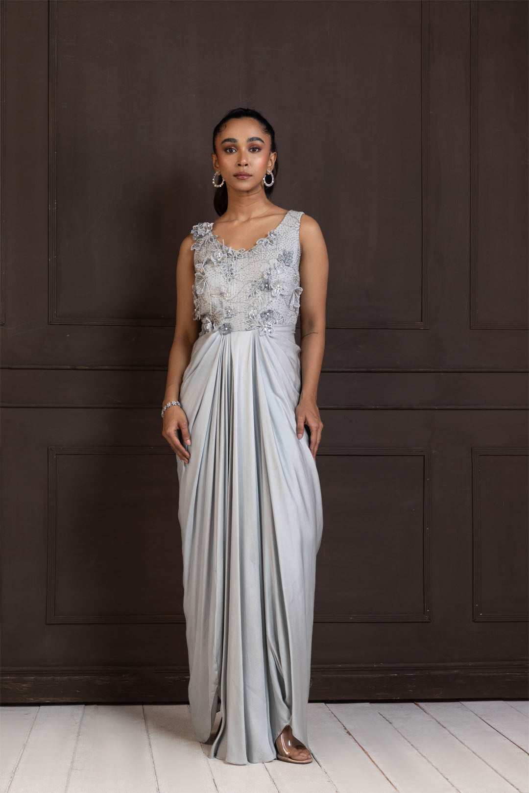 This stunning silver gown is the epitome of grace and glamour. Featuring a sleeveless design, the bodice is intricately embellished with shimmering sequins and beadwork, adding a touch of luxury. The draped skirt flows elegantly, creating a soft, cascading effect that enhances the silhouette. Ideal for formal events or evening occasions, this gown is crafted from lightweight fabric, offering comfort and effortless style.