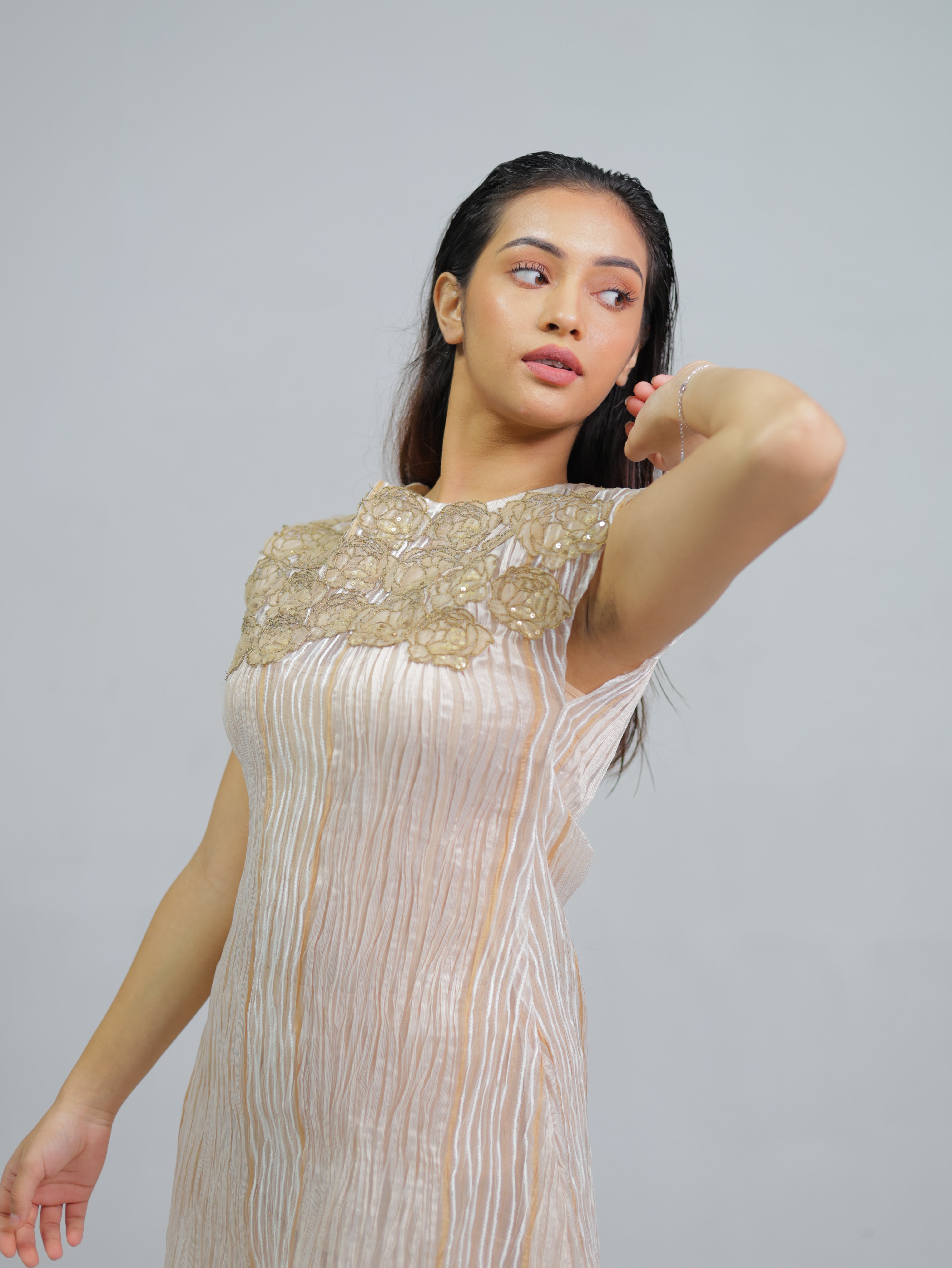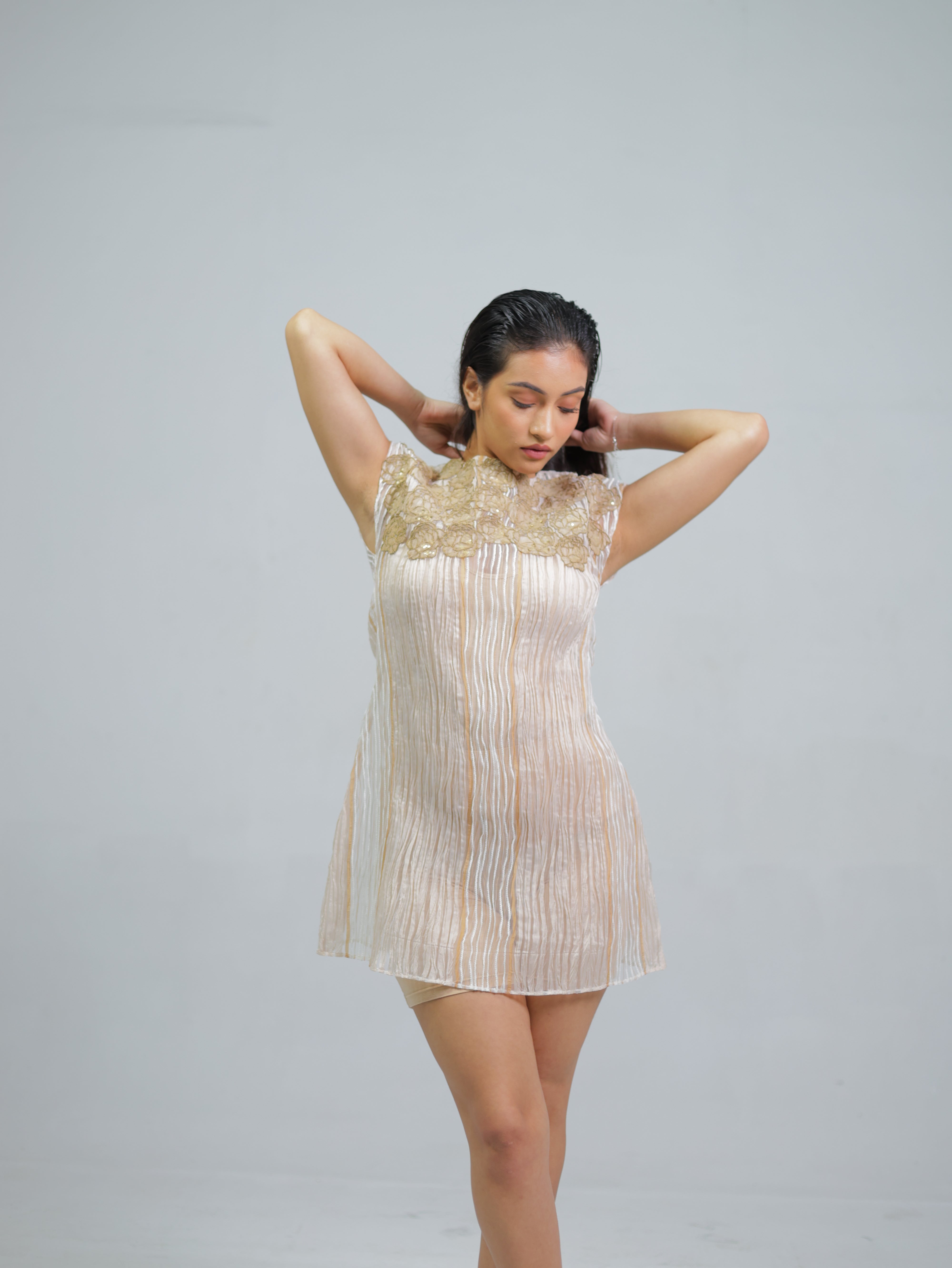 A chic mini dress with gold lace detailing and soft, shimmering stripes for a graceful, radiant look
