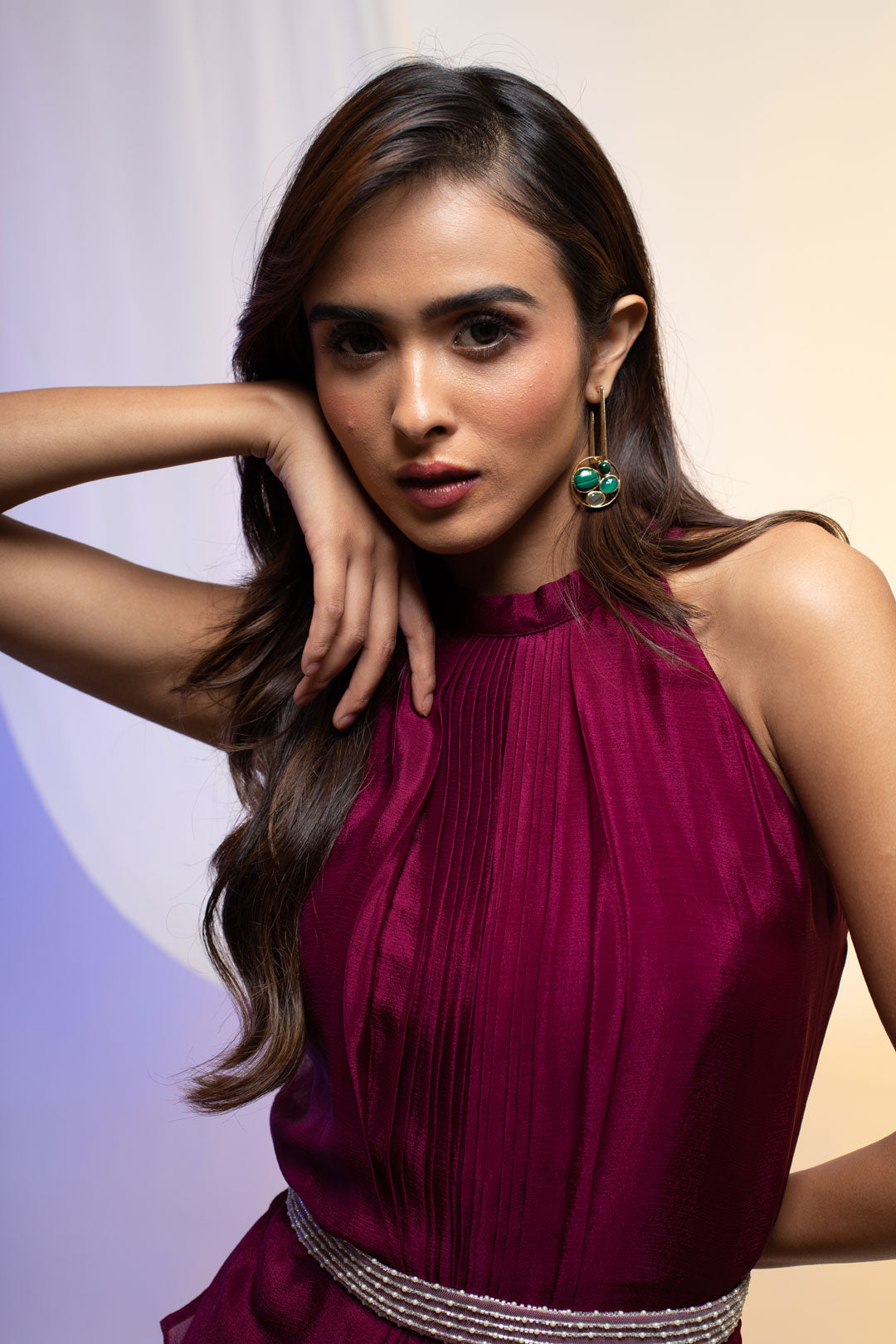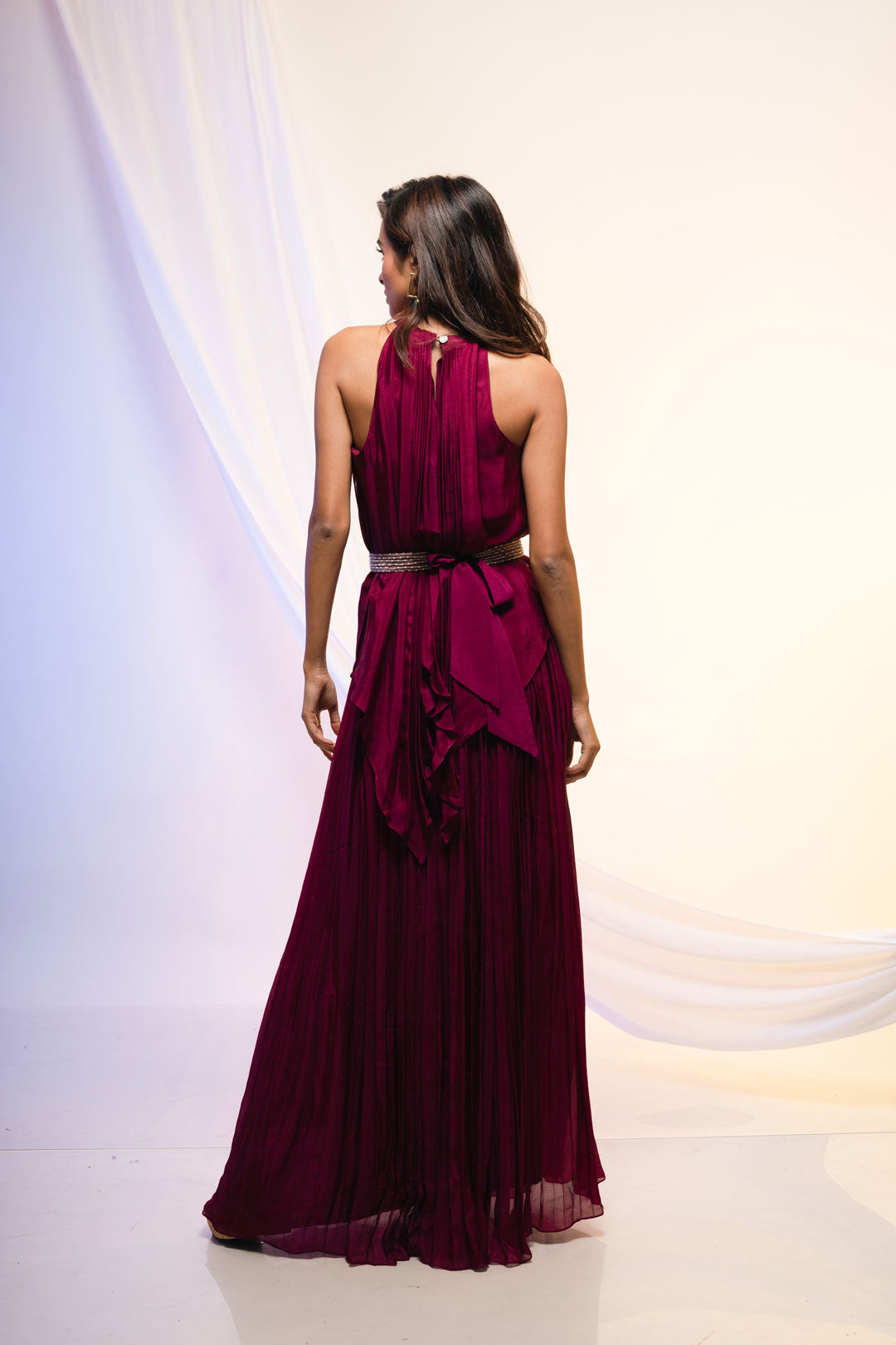 Magenta Co-ord Set With Pleated Halter Neck Asymmetric Top, Paired With Pleated Pants And Embellished Belt.