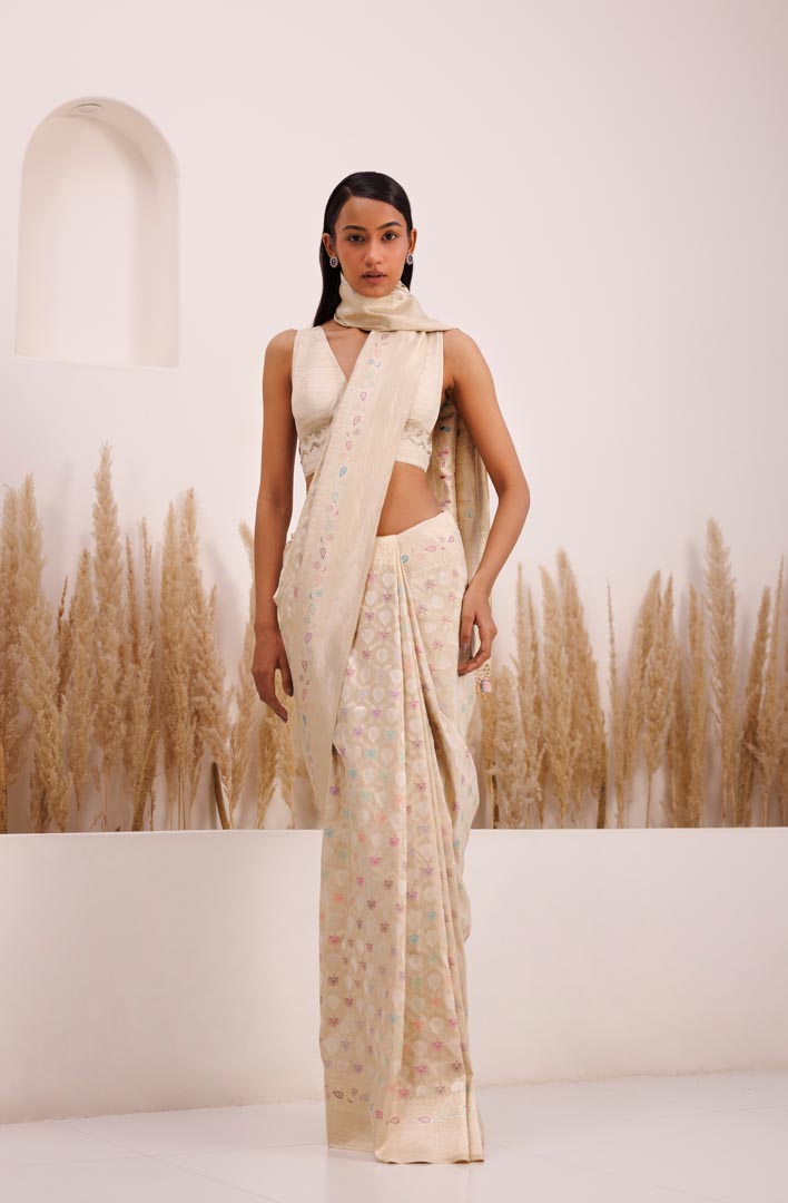 A multi-colour Meena saree finds its perfect match in a premium quality Crepe bralette, adorned with rhinestone that add a touch of brilliance and opulence to the ensemble.