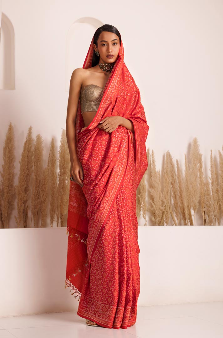 A Silk Jamdani saree, intricately hand-woven with meticulous care, pairs seamlessly with a Silk Satin bustier adorned with rhinestones, infusing a sense of luxury into the ensemble.