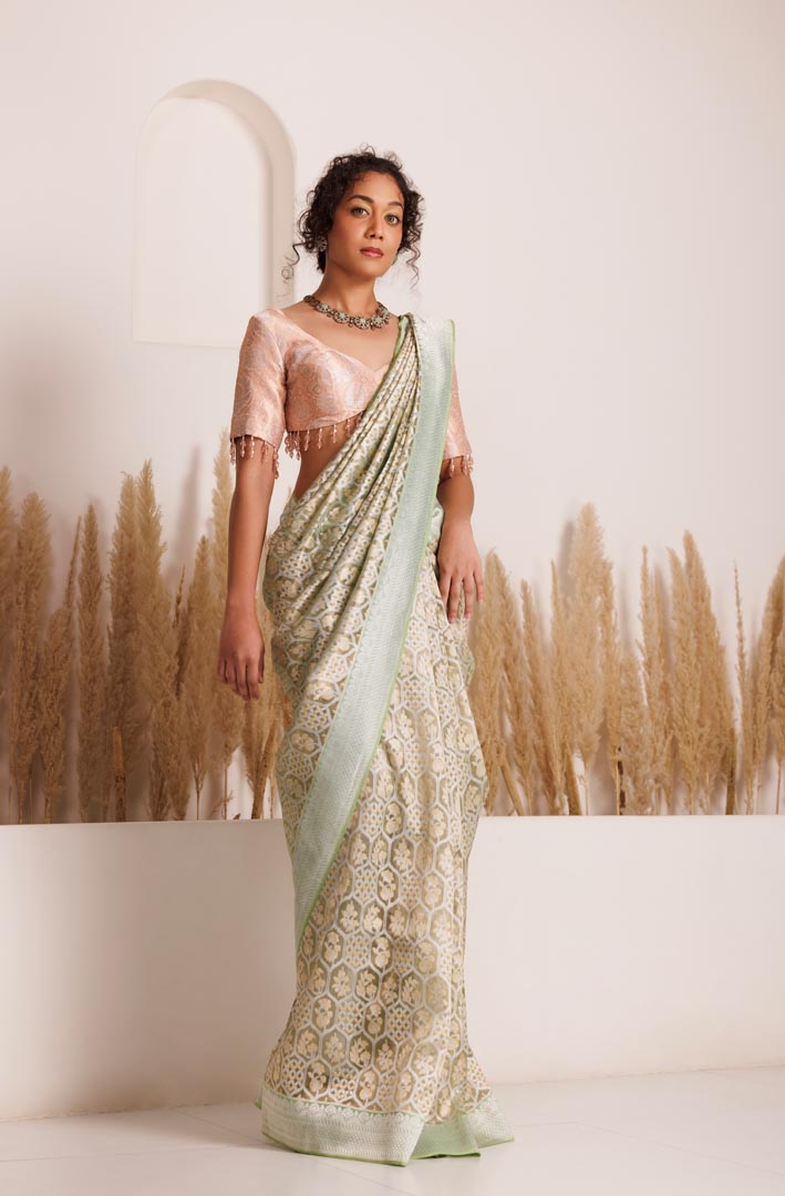 A Tissue Net saree, meticulously crafted discovers its perfect complement in a premium-quality Brocade blouse, elegantly adorned with crystal embellishments along the edges, thereby infusing a touch of brilliance and opulence into the ensemble.