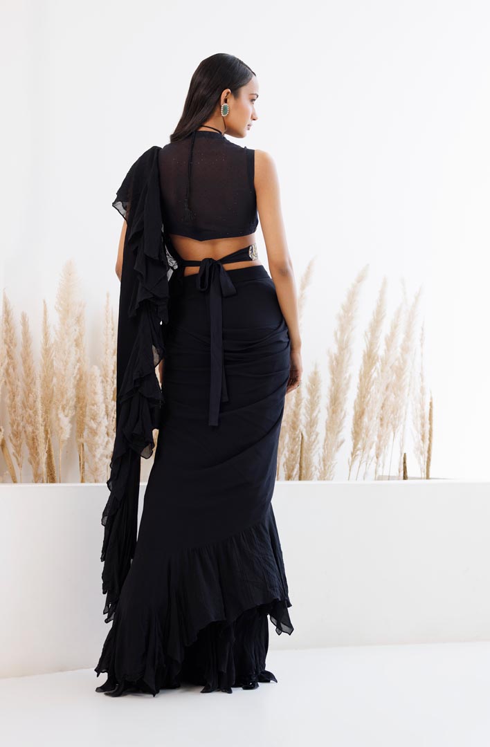 A Black Georgette saree harmoniously pairs with a Brocade and Georgette blouse adorned with a Brocade belt, infusing a sense of luxury into the ensemble.