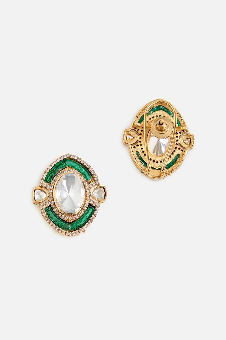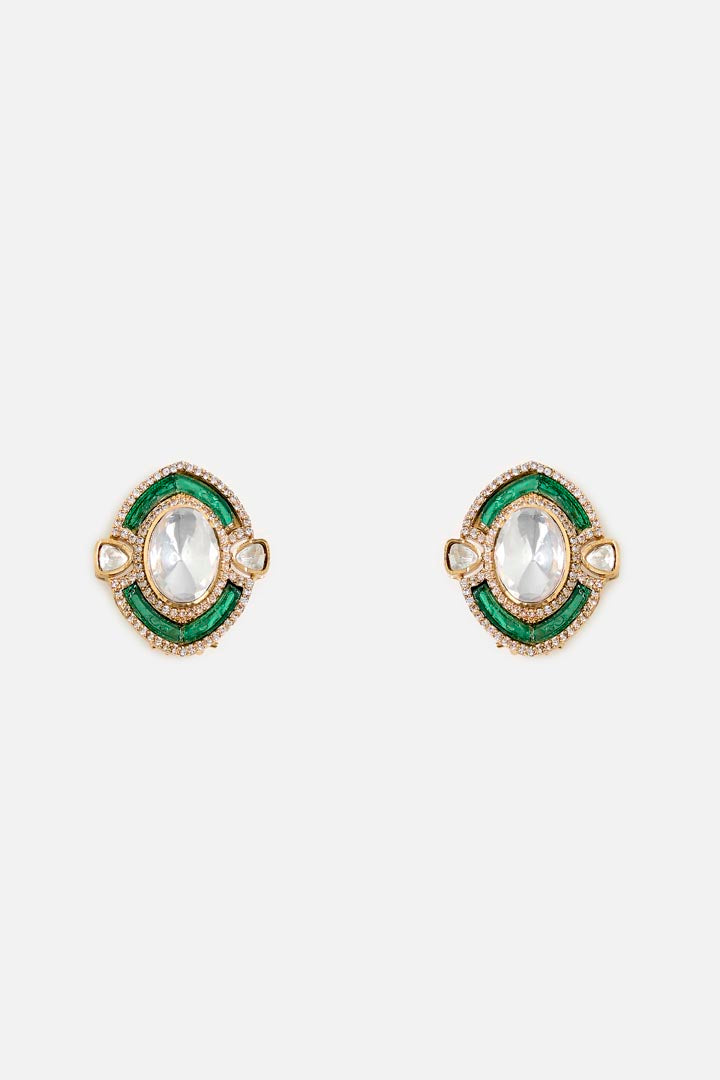 This classic kundan choker necklace set with matching stud earrings showcases green and white stones in a timeless floral motif. Perfect for adding elegance to weddings, festive occasions, or parties.