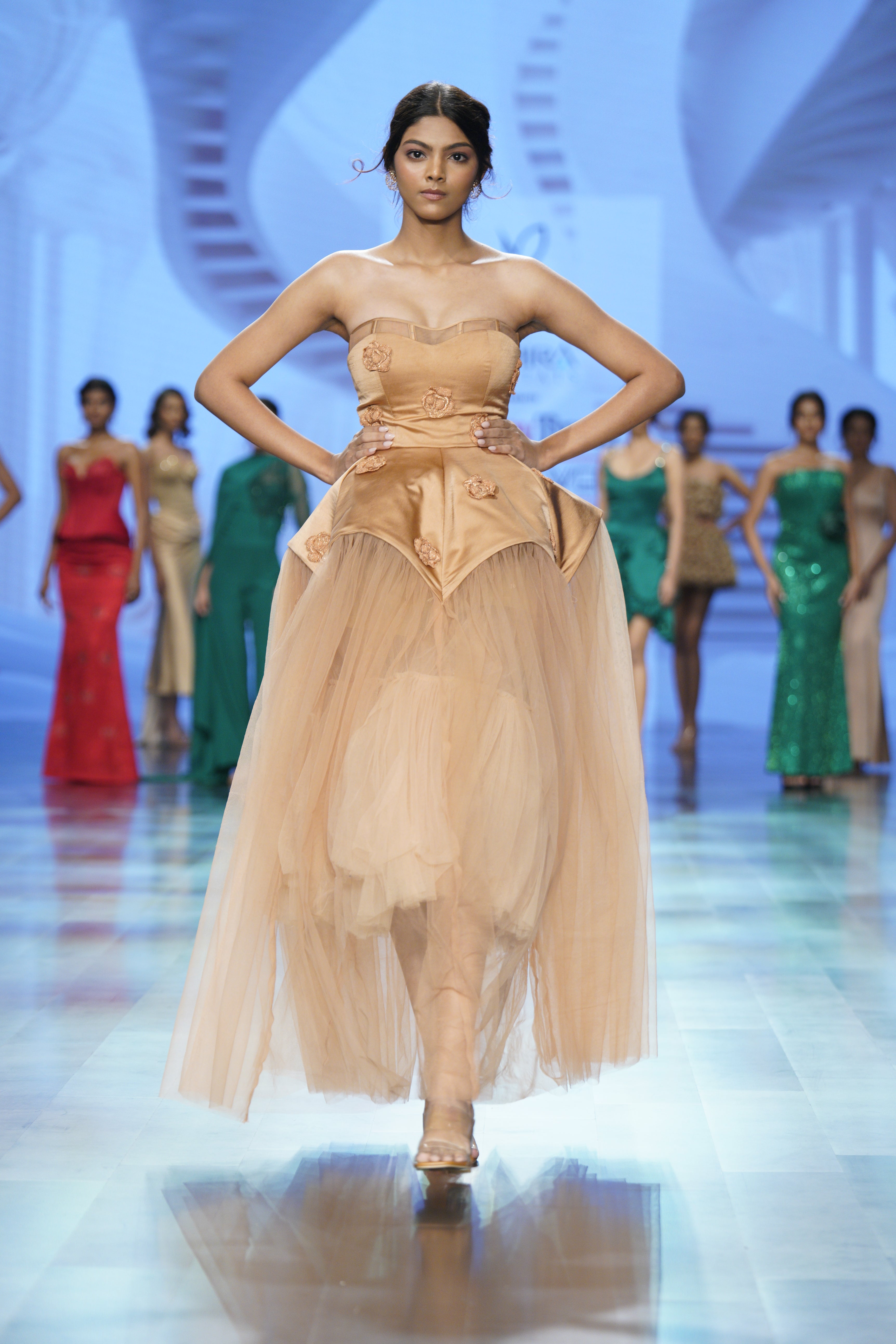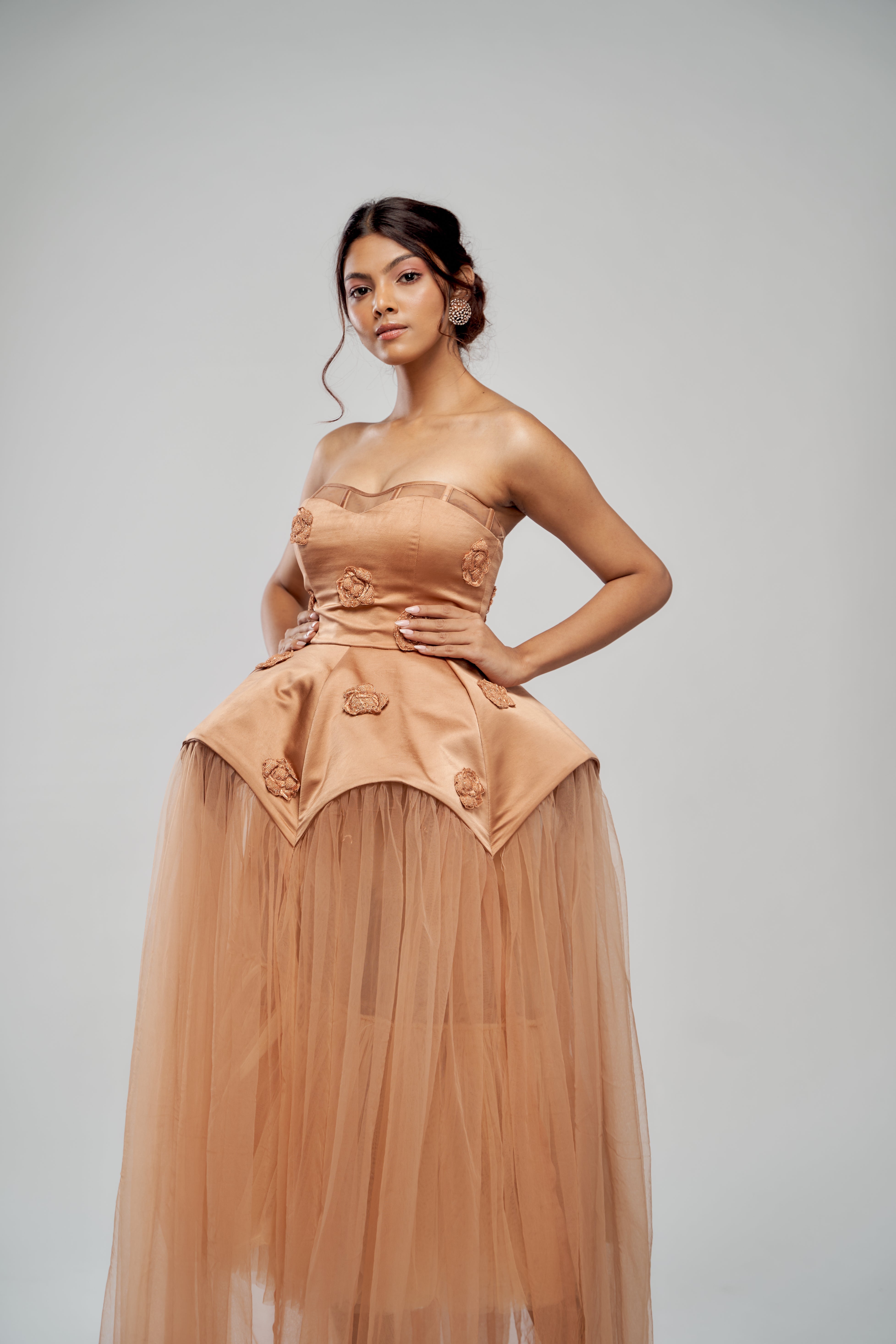 A timeless 3D dress featuring peony patches crafted from resham and baadla thread. Inspired by Victorian silhouettes, this piece blends historical charm with intricate modern