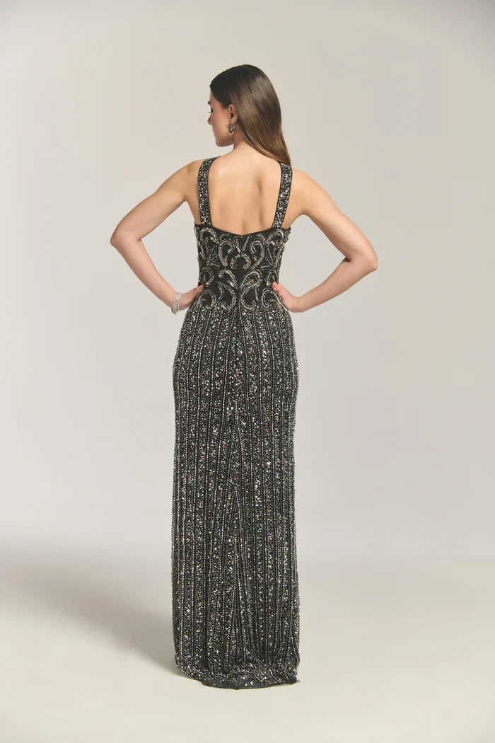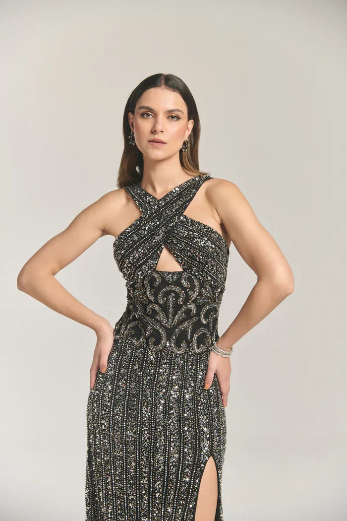 A striking black sequinned gown that cascades to the floor, this elegant piece features a flattering halter neckline with a crossover design. The gown boasts a daring keyhole cutout at the center and a thigh-high slit on the left side, adding a touch of bold sophistication. Intricately covered in a delicate beaded pattern, the garment is further enhanced with smaller, closely spaced bead lines that embellish the skirt, creating a mesmerizing shimmer and texture across the entire ensemble.