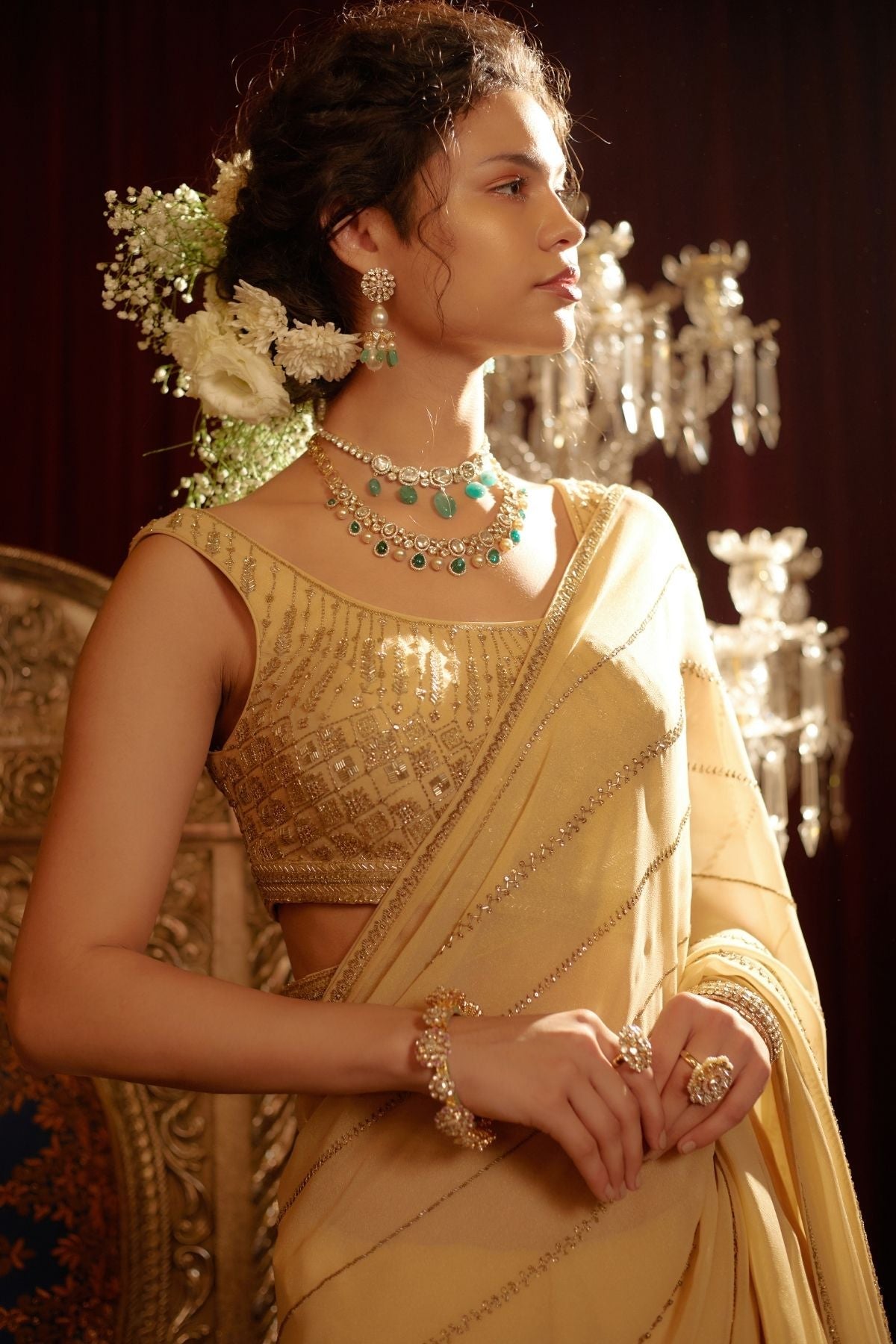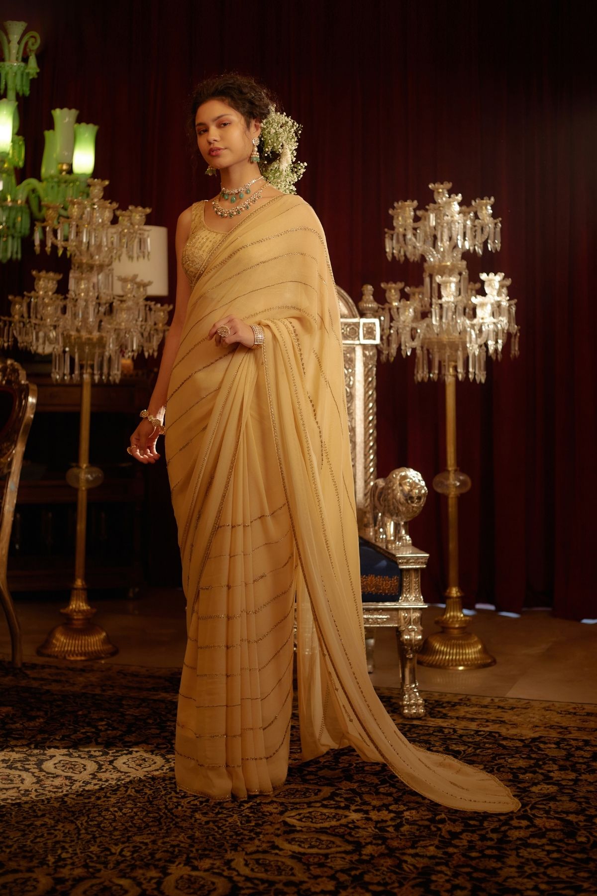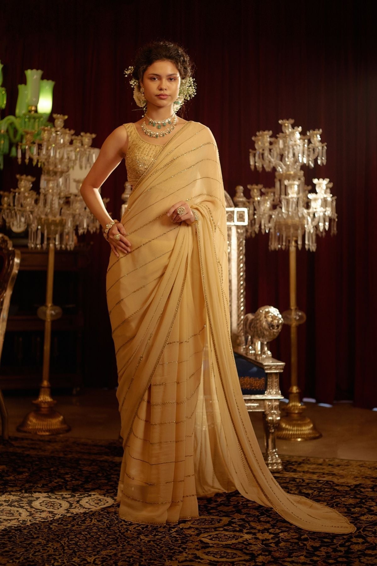 Gold saree with sgold work and with linear design artwork and work detailing of cutdana, swarosvki stones, sequins, dabka