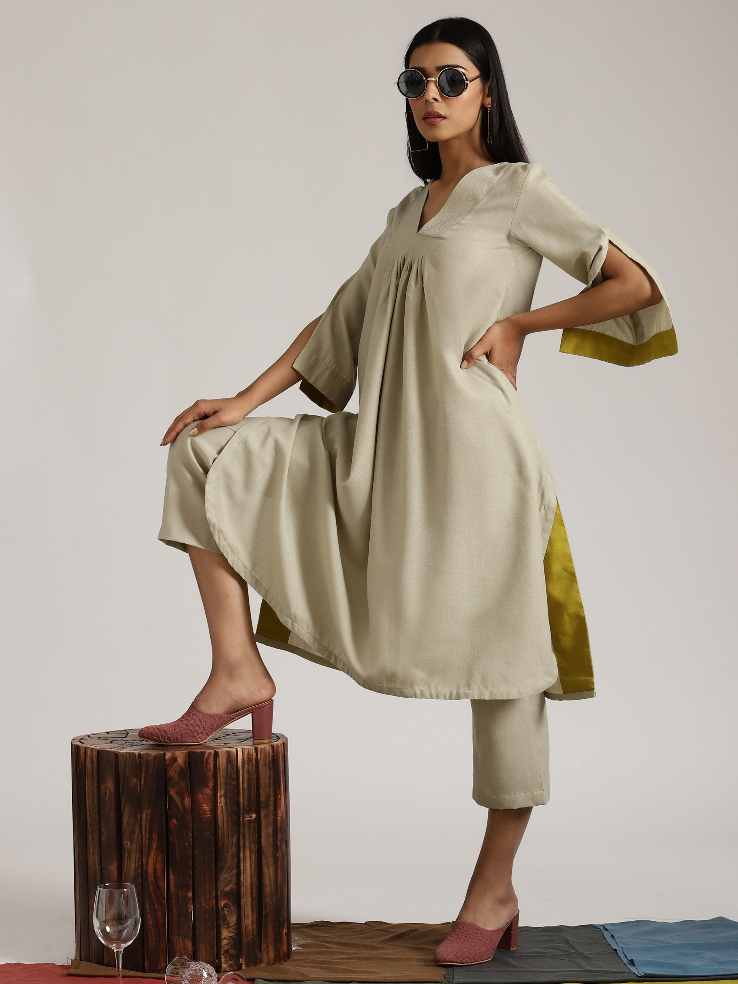 - Soothing Cotton Linen comfortable flared slit Kurta with front pleats and contrast inner facing detailing on slit and sleeves. It has two side pockets. It comes along with bottom with elasticated waist.