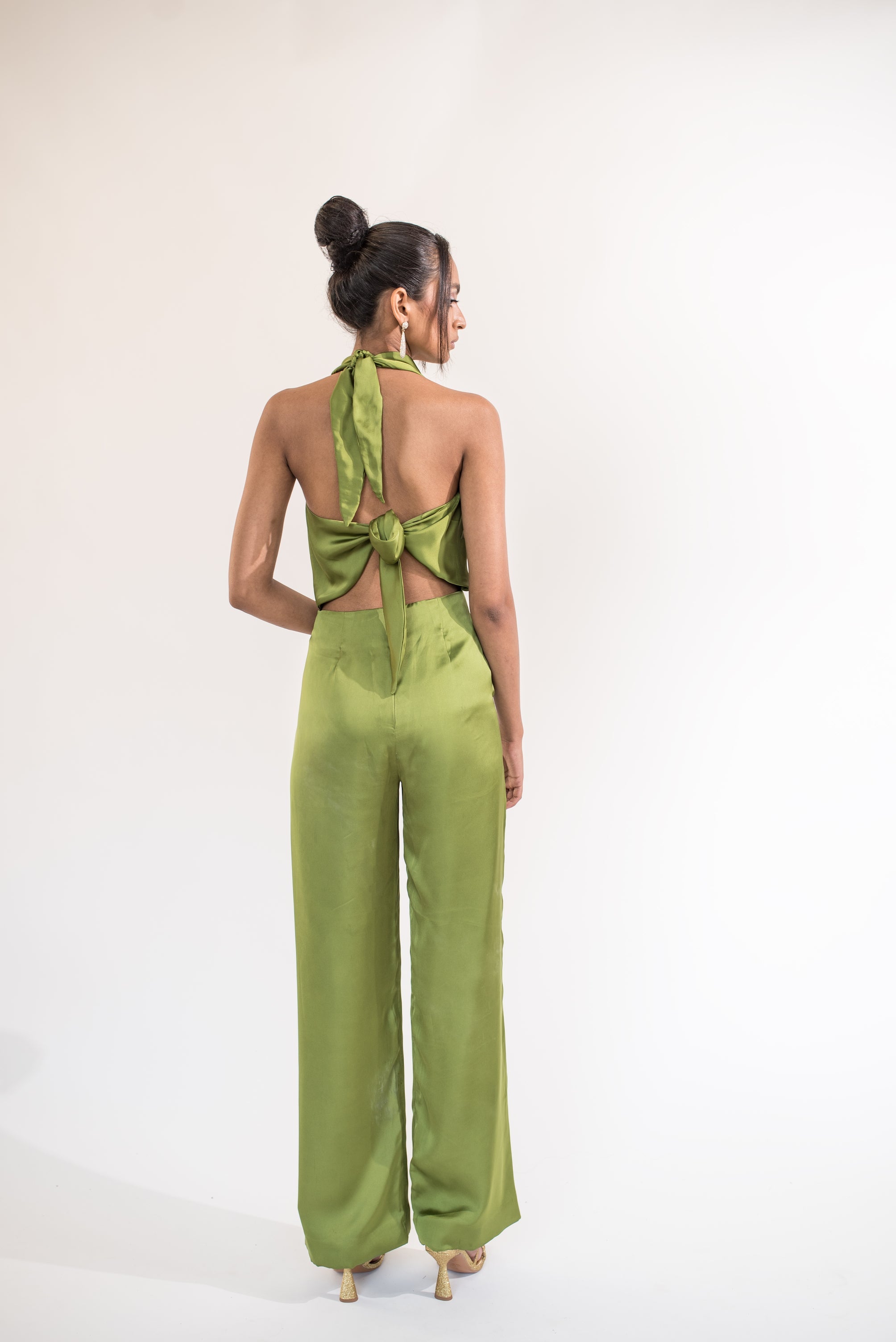 Backless halter neck jumpsuit with tie detail on the back. Front cowl neck. Zip closure at the back. Lined.