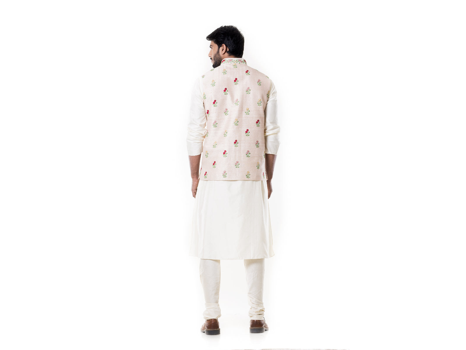 Featuring a Cream Kurta with Light Peach Waist Coat Set with colourful small emroidery.FABRIC SPECIFICATION: The kurta and churidar is made of cotton silk and the jacket is made of raw silk.FULL LENGTH: The full length of the kurta is 45" and the full length of the jacket is 28".WASH CARE INSTRUCTIONS: Dry clean only.Steam iron only.Do not wash(Possibility of slight colour variation) This piece consists of kurta set & a jacket