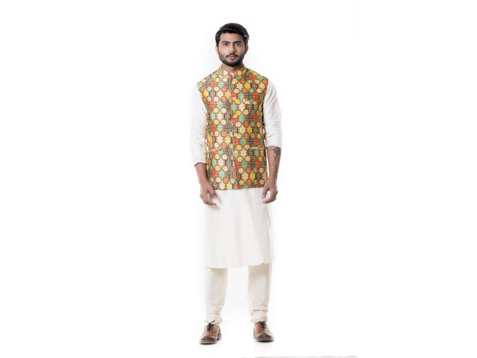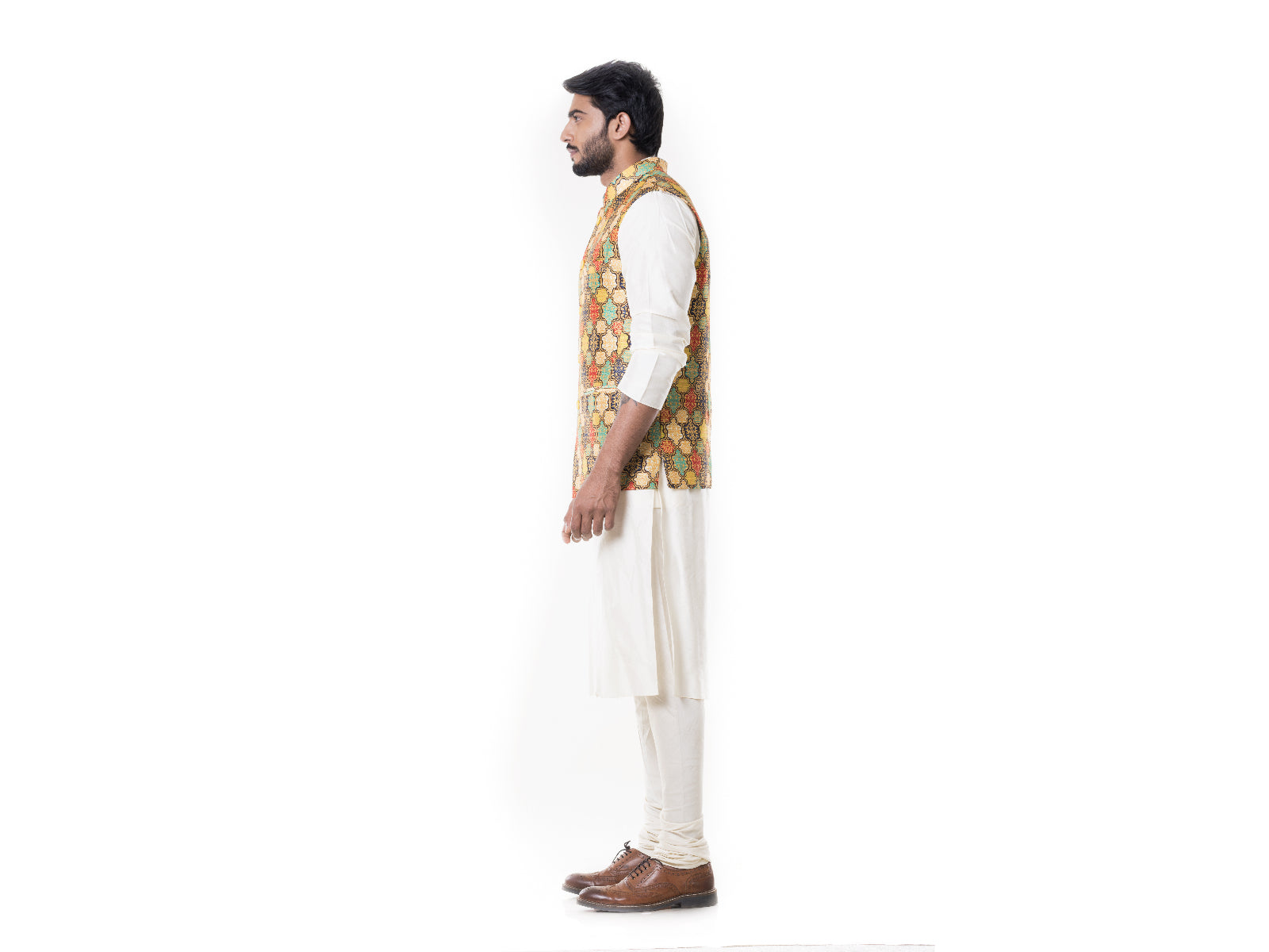 Featuring a Cream Kurta with Pink Waist Coat with jadi embroidery.FABRIC SPECIFICATION: The kurta and churidar is made of cotton silk and the jacket is made of printed silk.