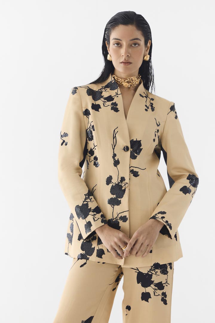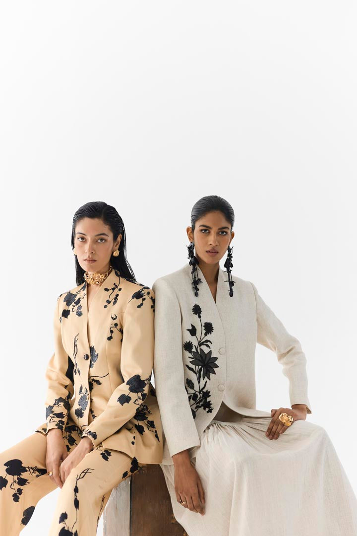 The Cream Sakura Blazer & Straight Pants crafted from our stunning vegan silk fabrication, trans-seasonal, is a statement piece. This set, printed in cream base sakura flower print, has a chic look.With a two tone look, the front is cream and the back is made in our black sakura print. The blazer has a v-neckline and 2 buttons. It is embroidered with sequin all over. It is paired with our matching cream sakura straight pants with a front zipper and elasticated back. Wear it with heels for an elegant look.