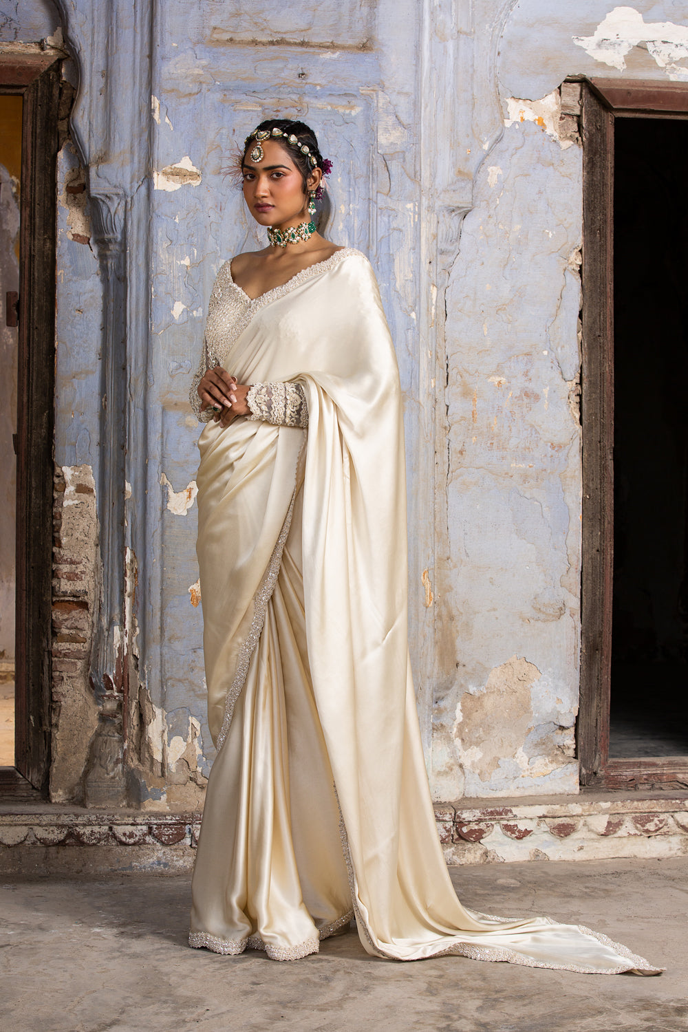 Cream Satin Saree with long-sleeved net blouse embroidered in tonal resham, beadwork, and silver crystals.