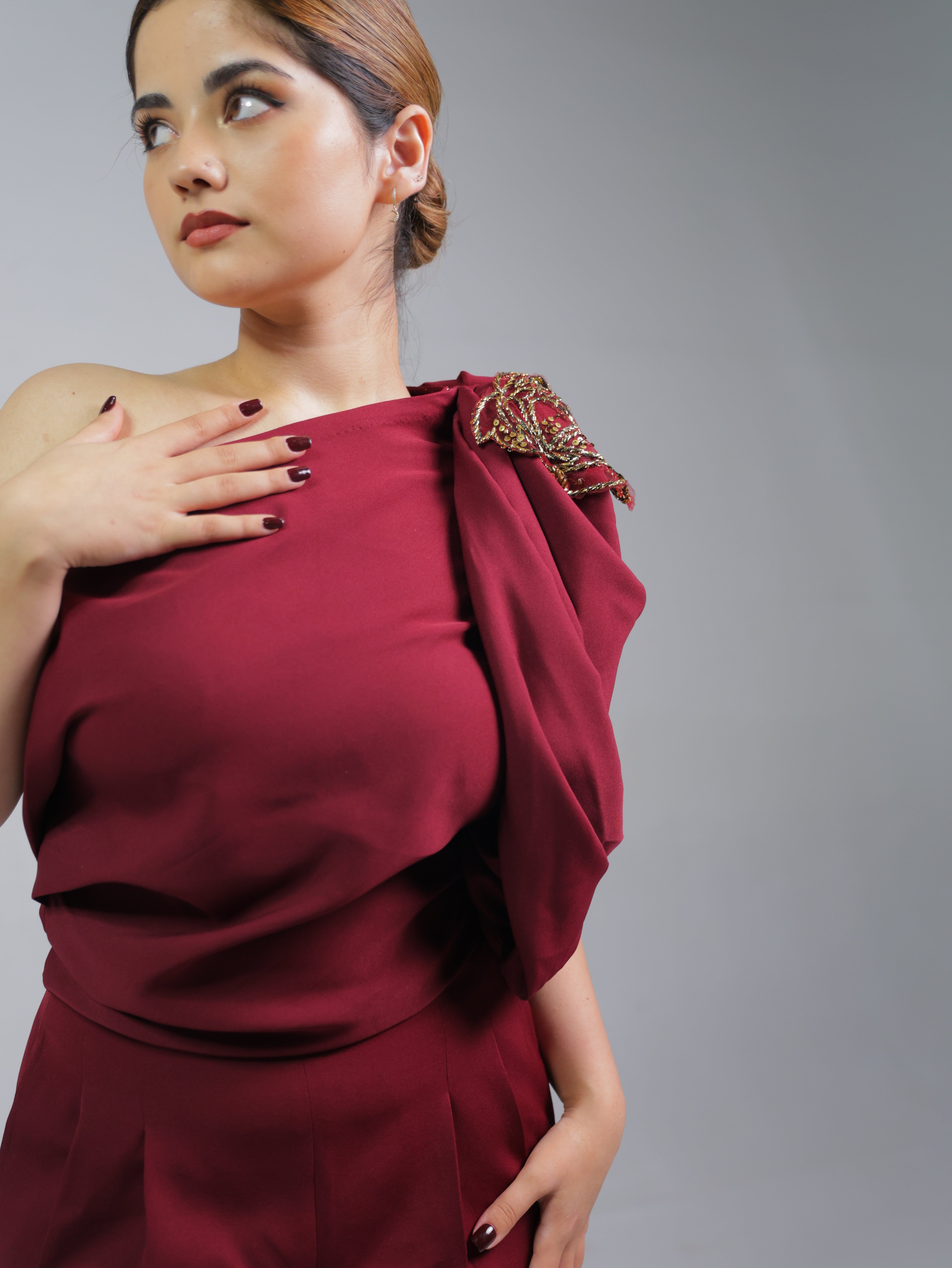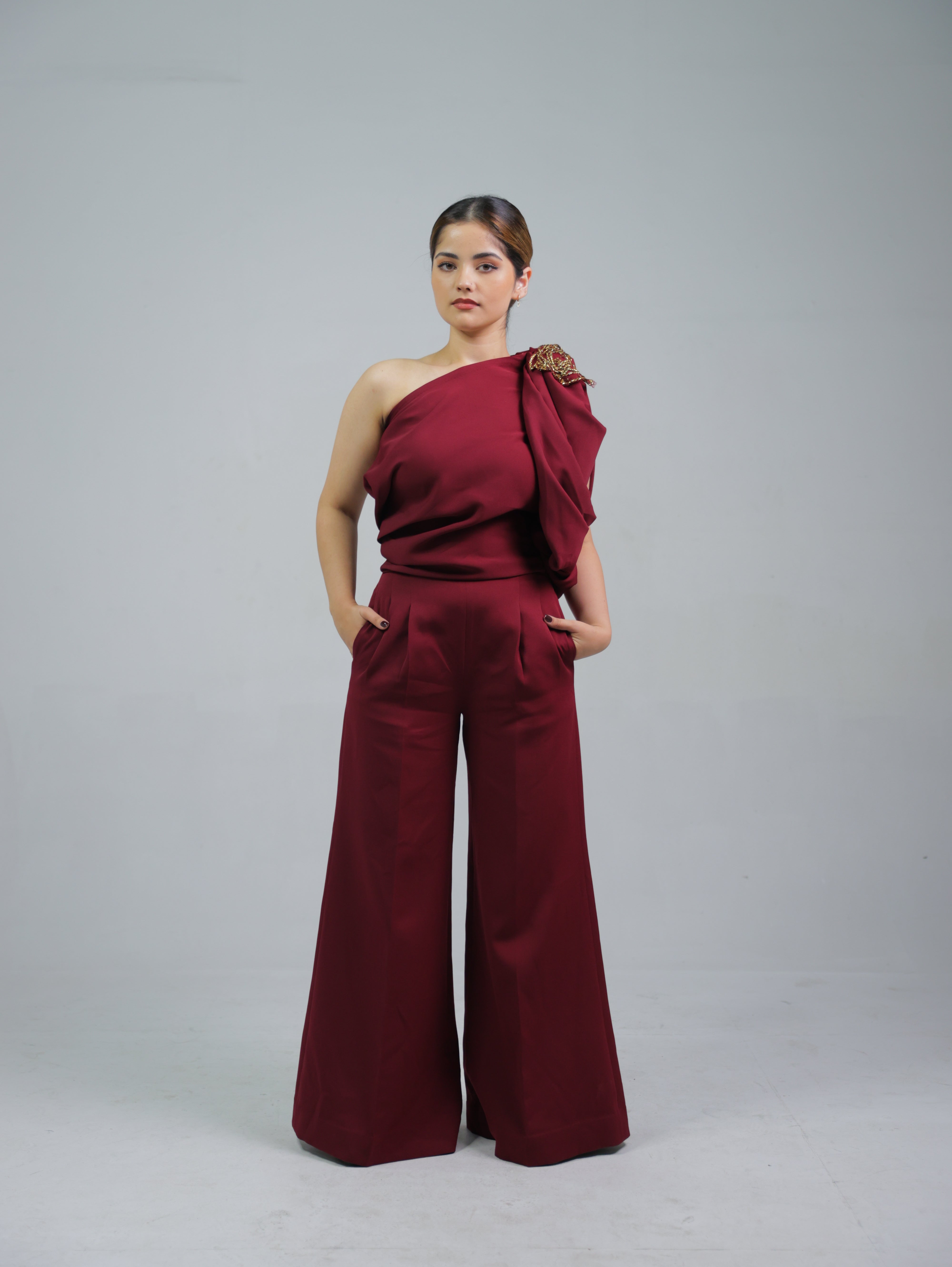 A striking one-shoulder maroon jumpsuit with a draped top and wide-leg pants, accented by a stylish shoulder brooch