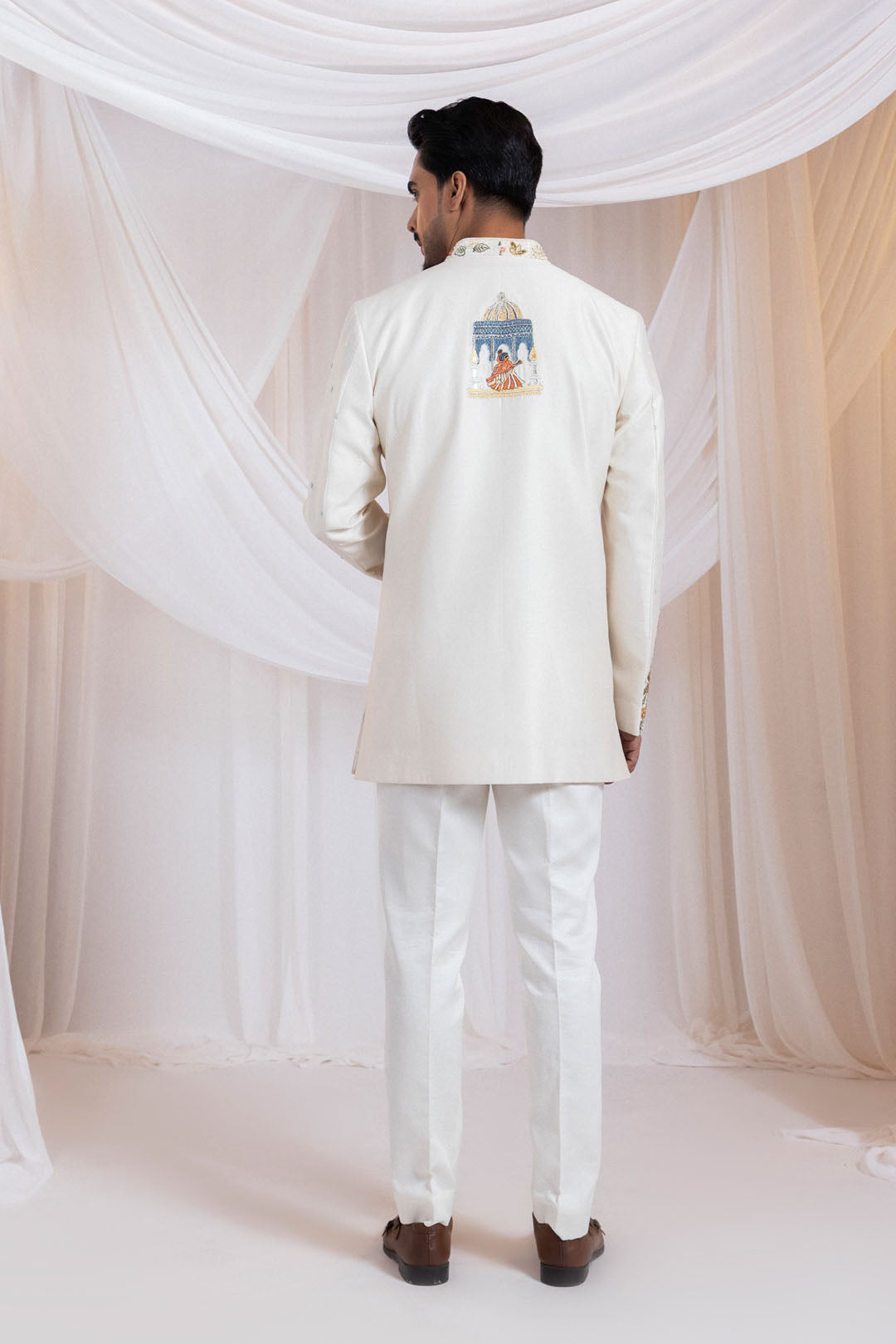 This intricately handcrafted bandhgala is a regal ensemble in ivory silk, featuring a stunning tapestry of Mughal garden scenes. Embellished with detailed multicolored embroidery, it showcases royal domes, palm trees, peacocks, and dancers inspired by traditional miniature art. The mandarin collar is with hand-embroidered floral motifs, while subtle pearl beads ,sequinss and sequins work across the body adds dimension. It is perfect for grooms or groomsmen at weddings and grand celebrations.