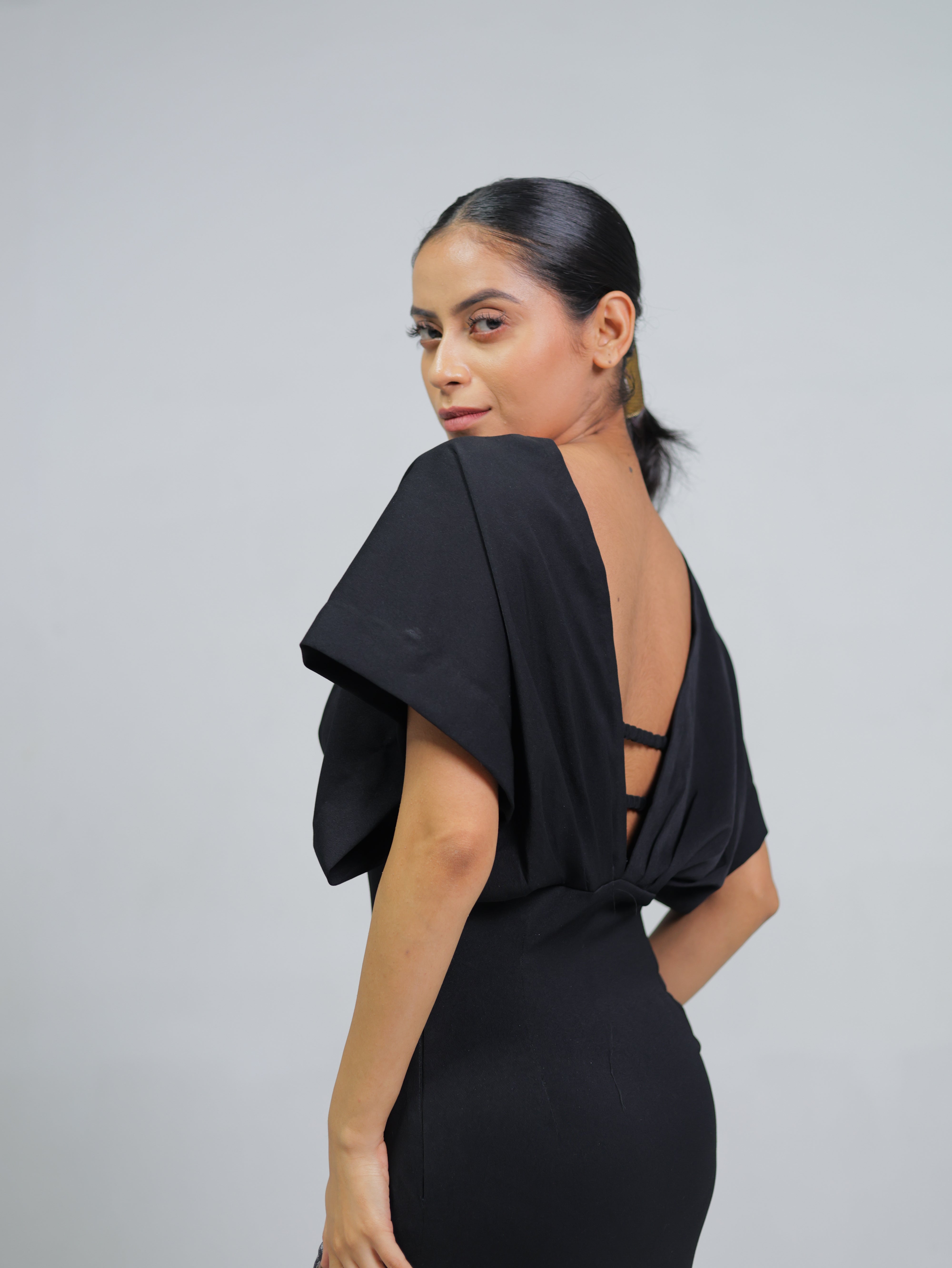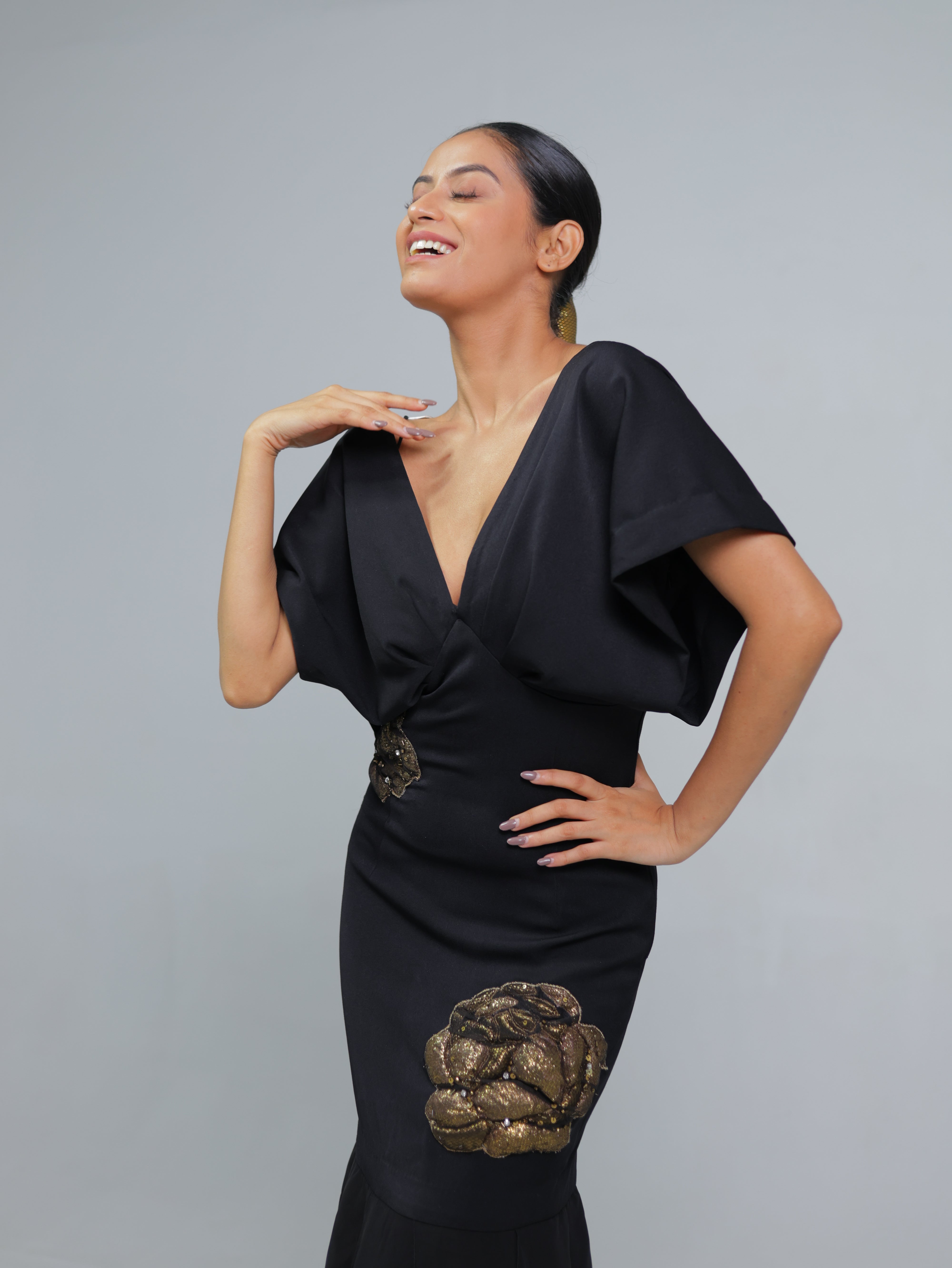 A sleek black body hugged dress with gold peony accents and a flowing silhouette, exuding elegance and allure. Perfect for a bold evening look.