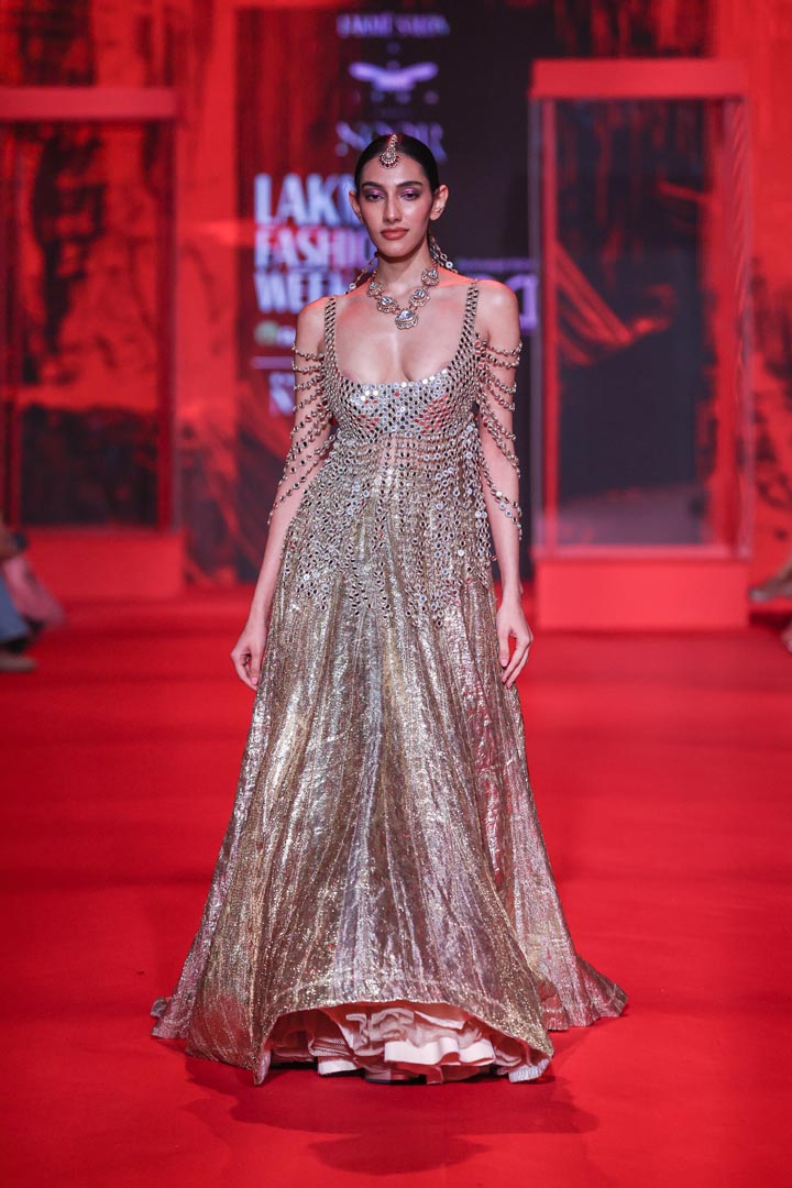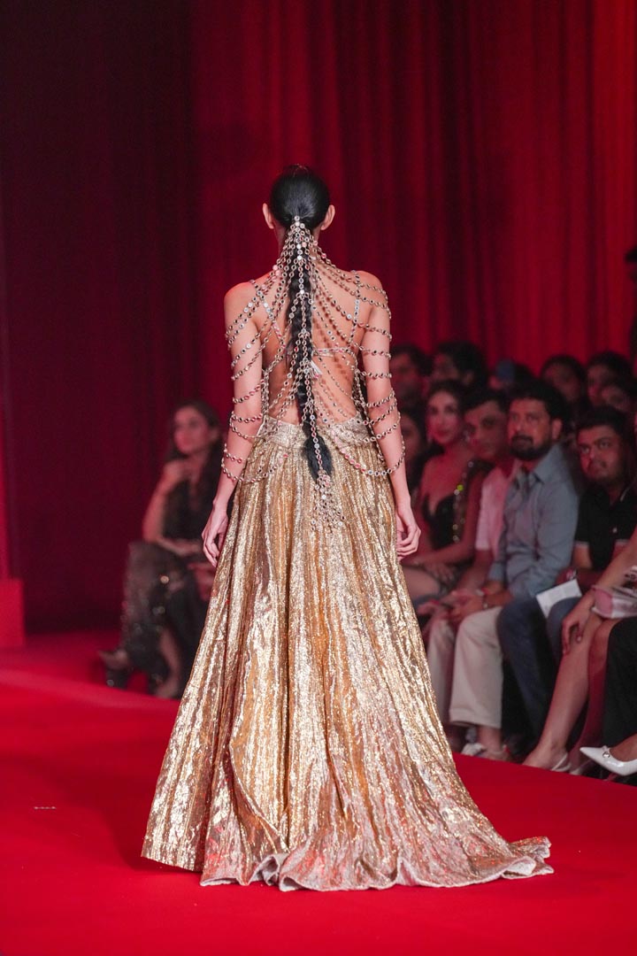 This scoop neck mirror work blouse features statement arm hangings that drape elegantly down the back, paired with a gold lampi lehenga. The intricate mirror embellishments and cascading arm hangings create a dramatic statement piece perfect for weddings and festive occasions