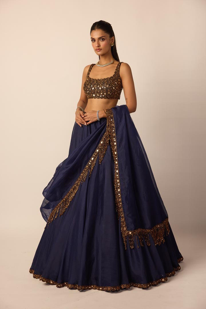 Deep Blue Embroidered Organza Lehenga, paired with a embroidered Square-neck Blouse and a Dupatta with cascading copper tassels.