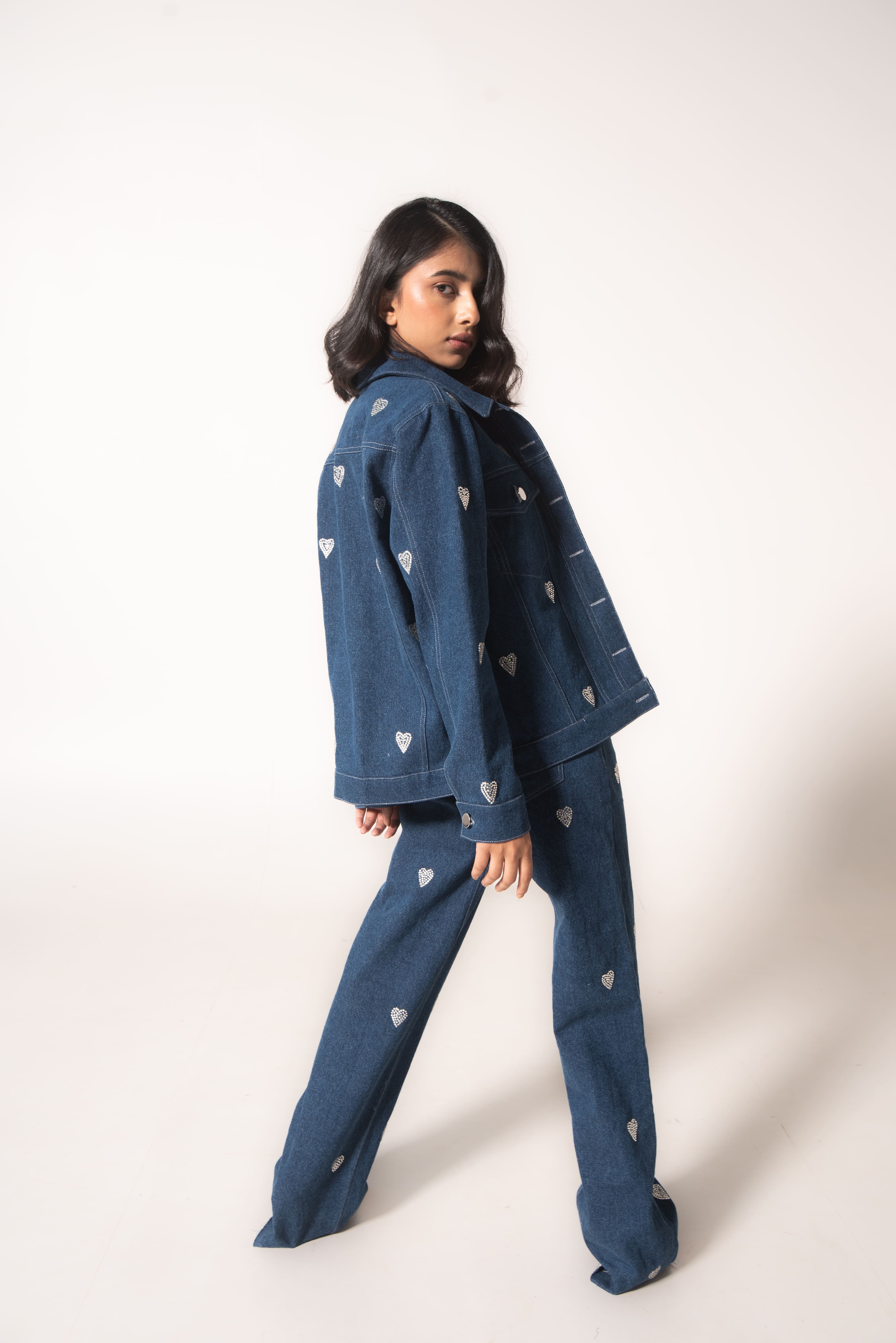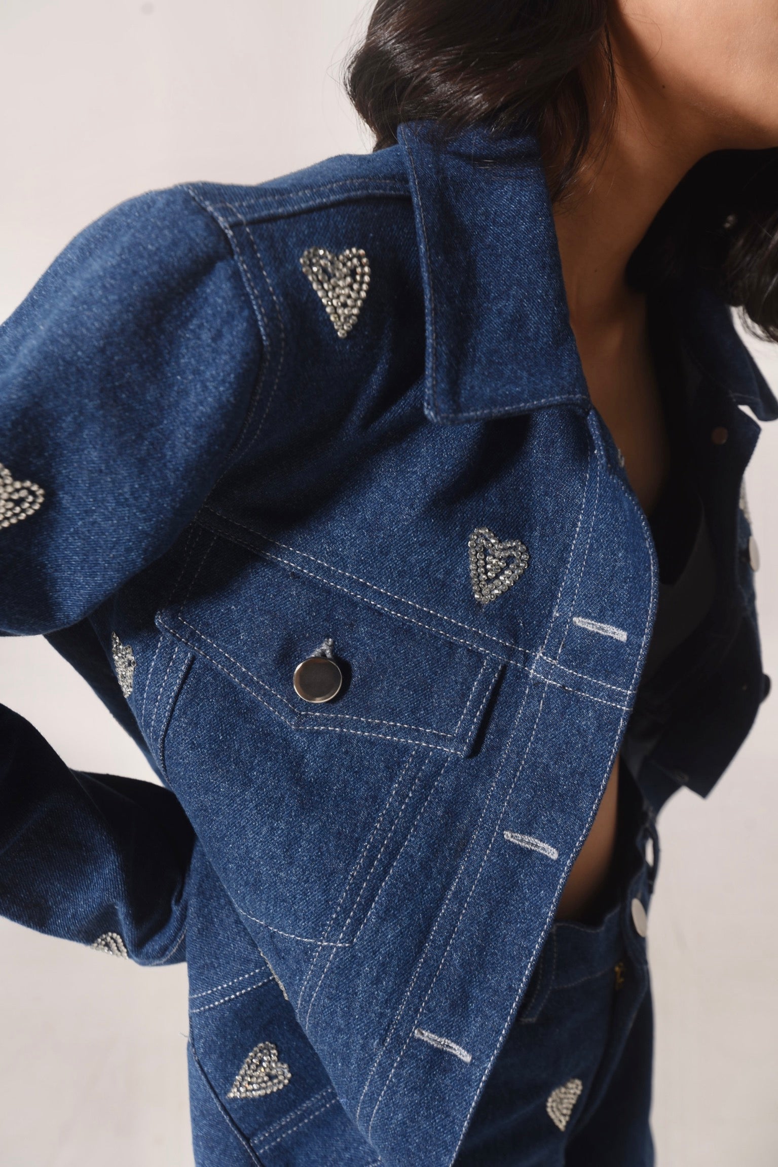 Straight fit denim jacket featuring bejewelled hearts all over. Chest pockets. Front button closure.