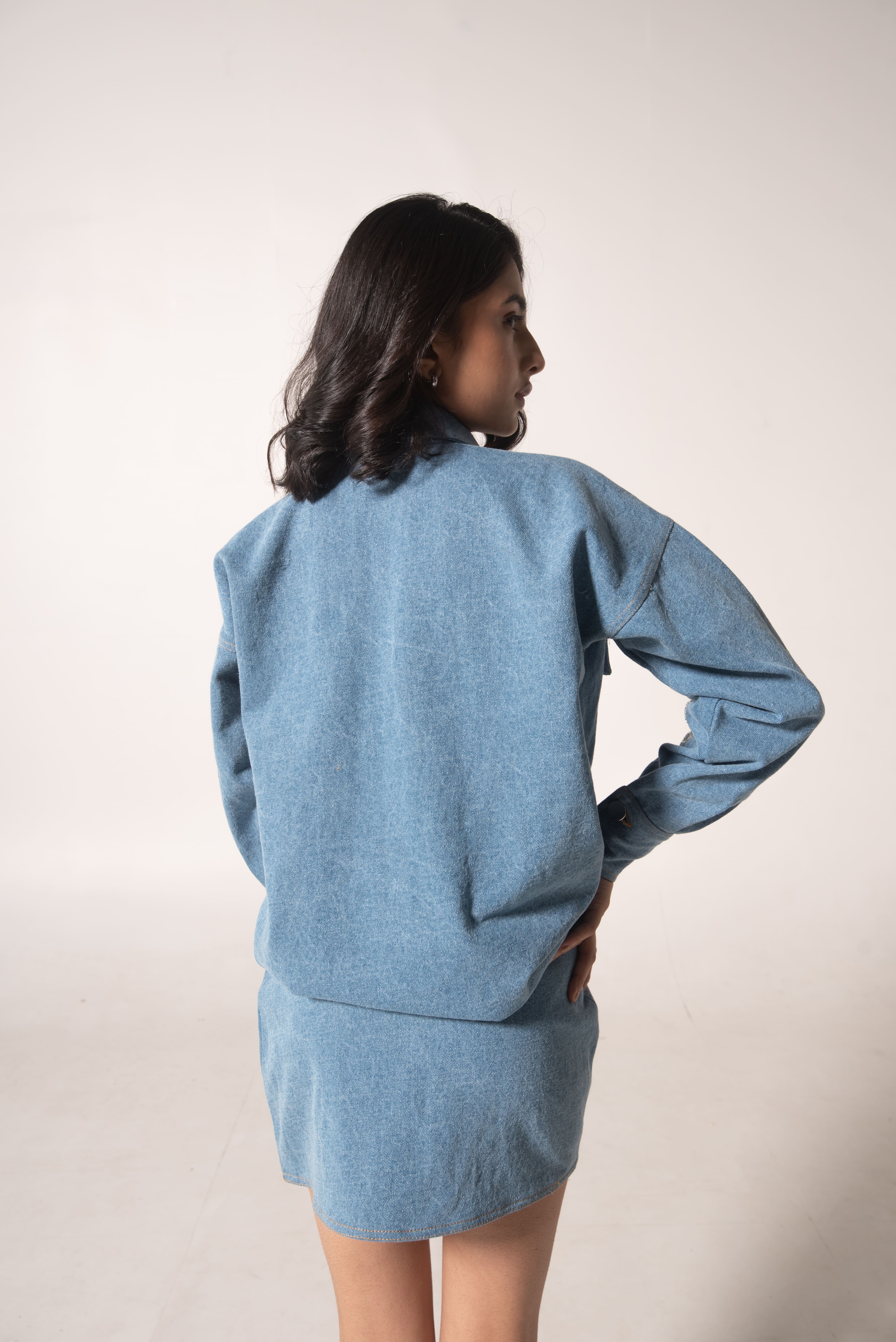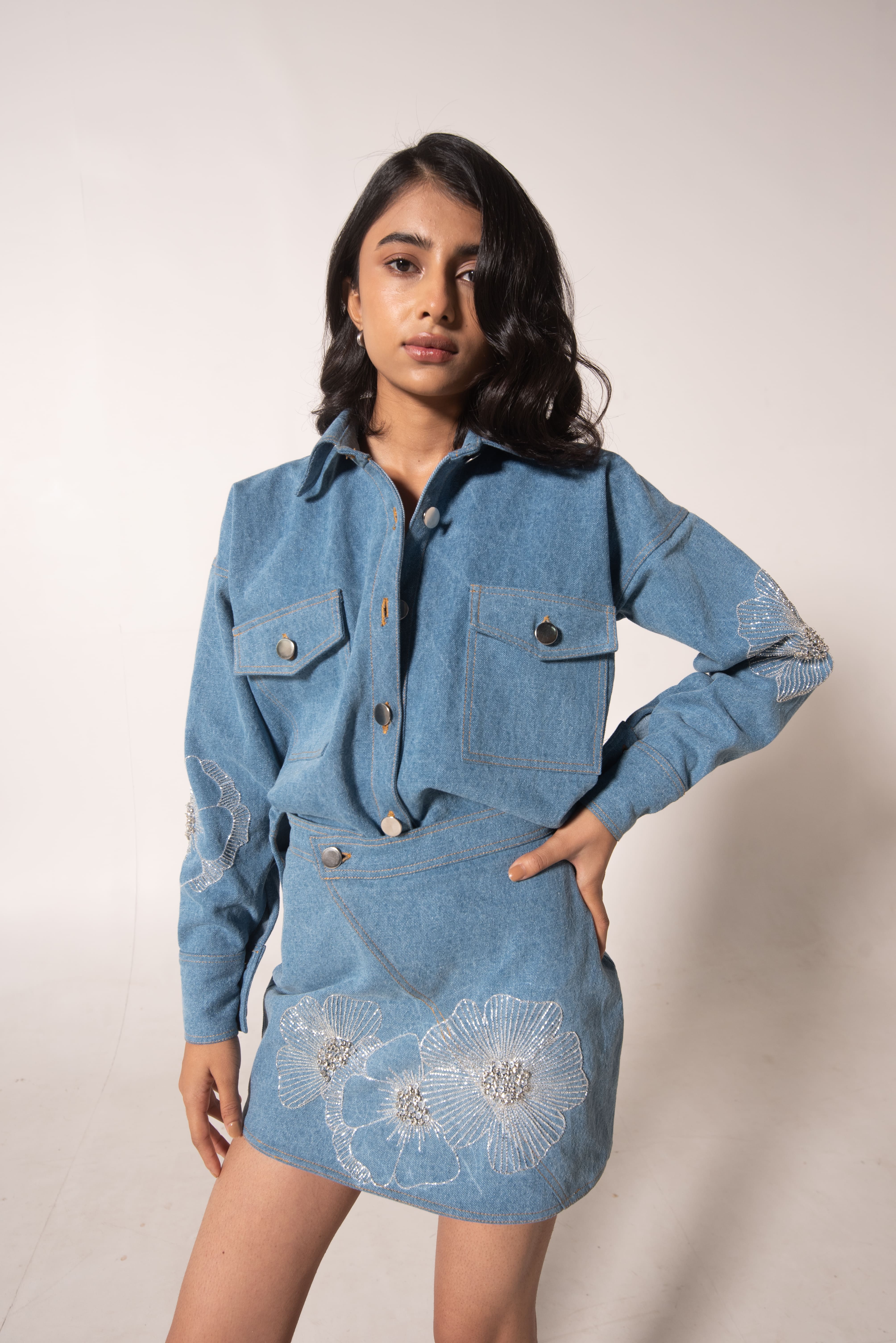 High-waisted, fitted, asymmetric front, denim mini skirt. Hand-embellished floral motifs on the front. High-quality, thick denim.