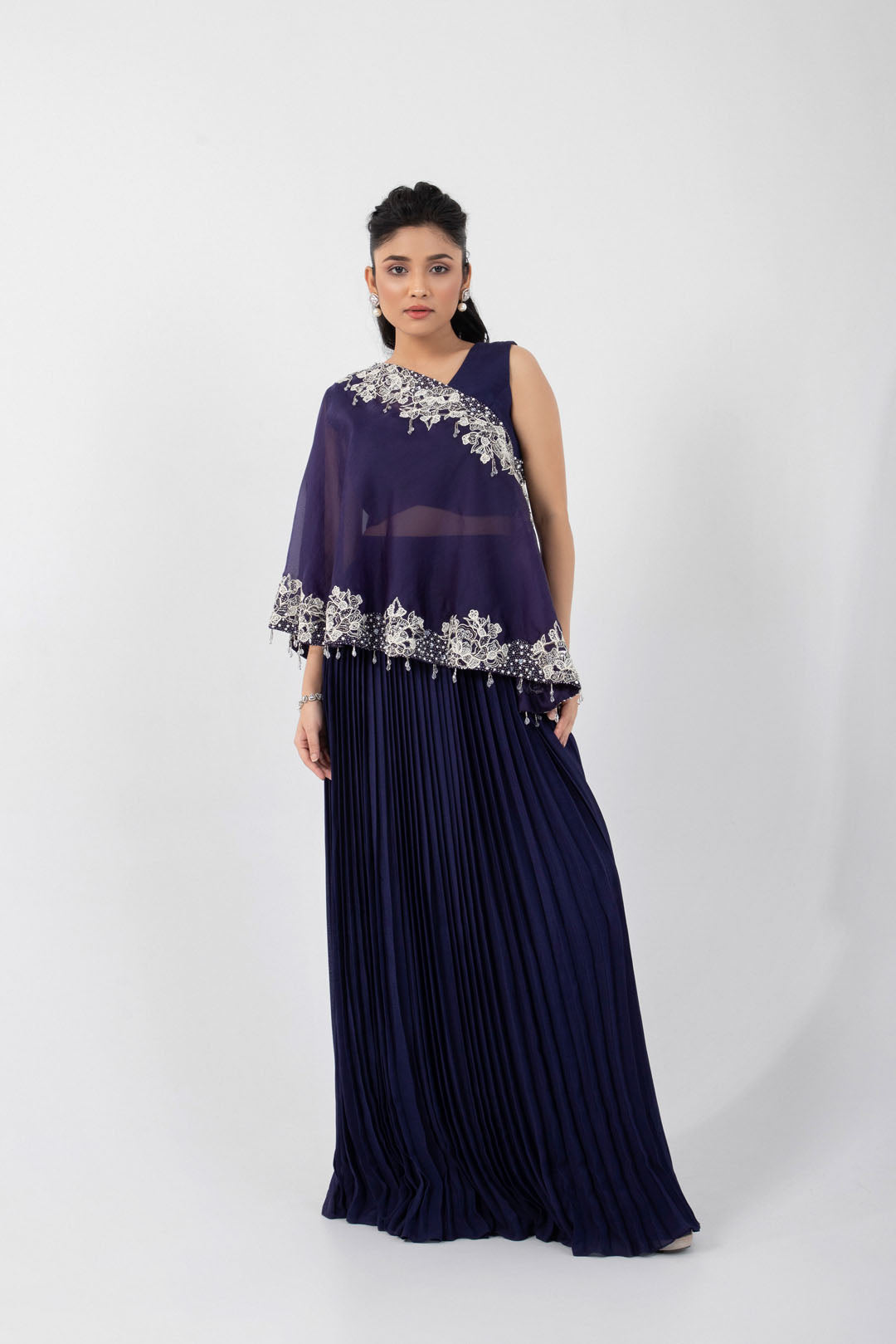 Make a statement with this stunning one shoulder embroidered cape, comes with a matching blouse and pleated skirt set. White threadwork is an eye catching detail on the border, complete with beads and tassels cascading down the asymmetric cape.